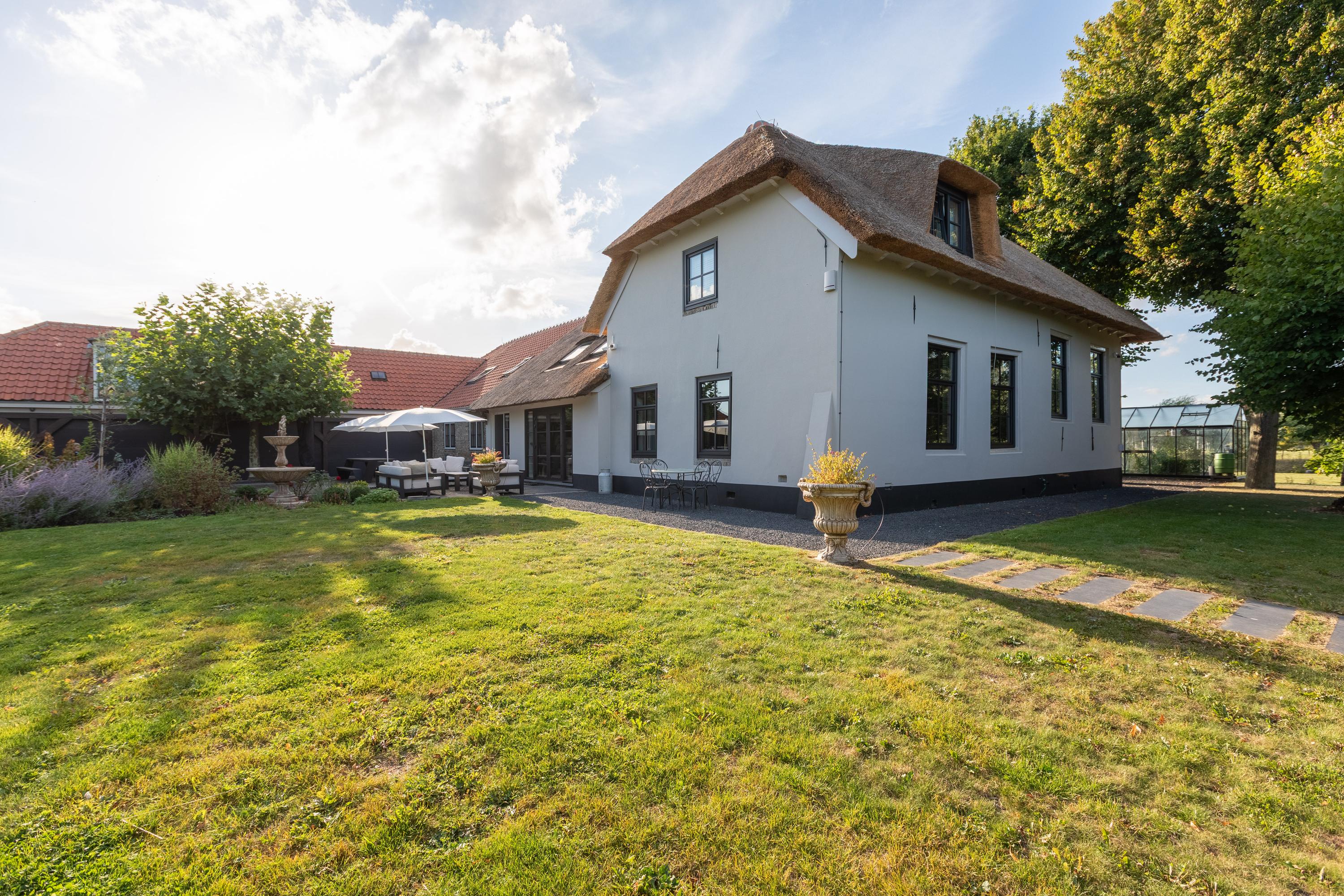 - De voorzijde van de rieten kap is vernieuwd in 2025, de achterzijde in 2017;