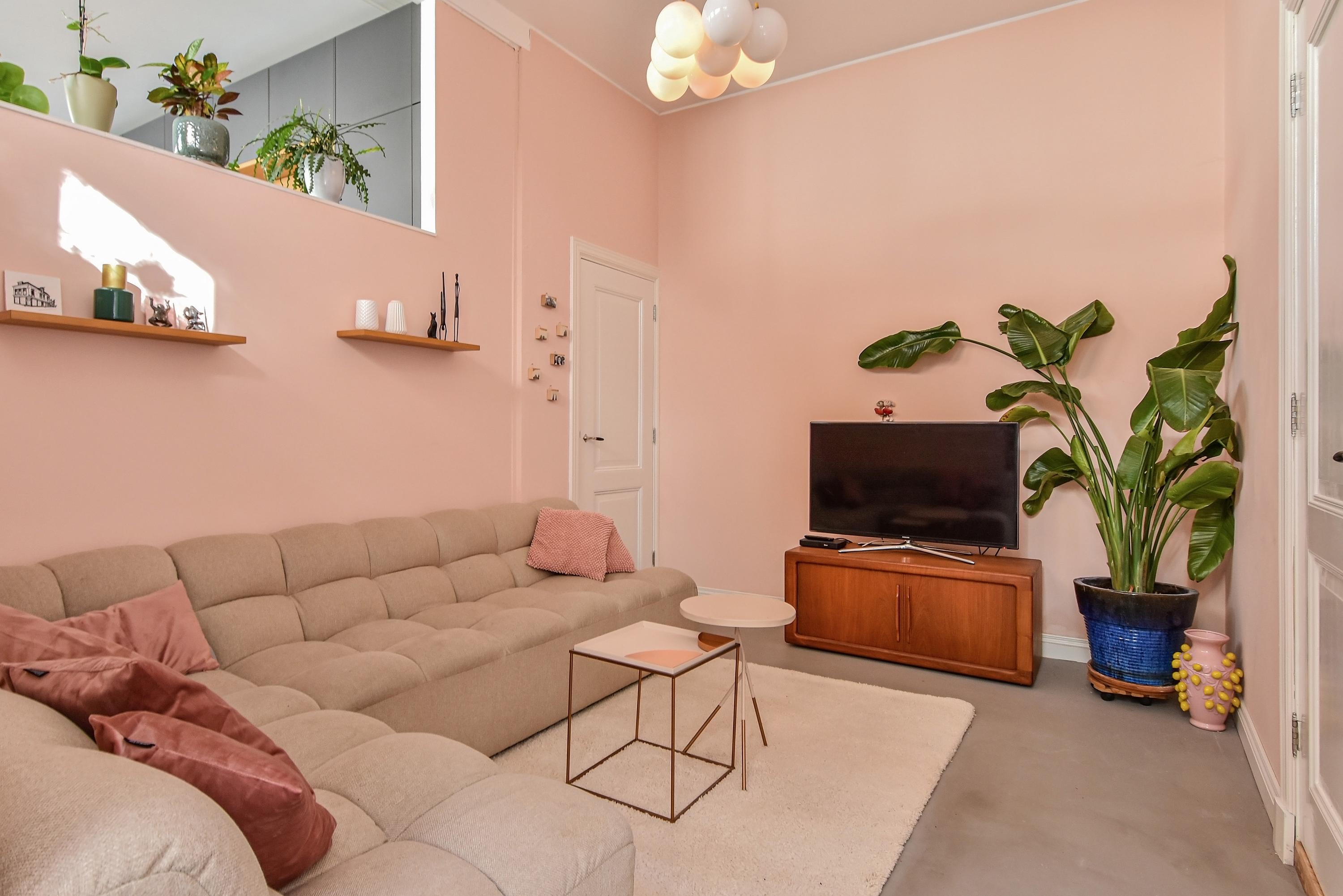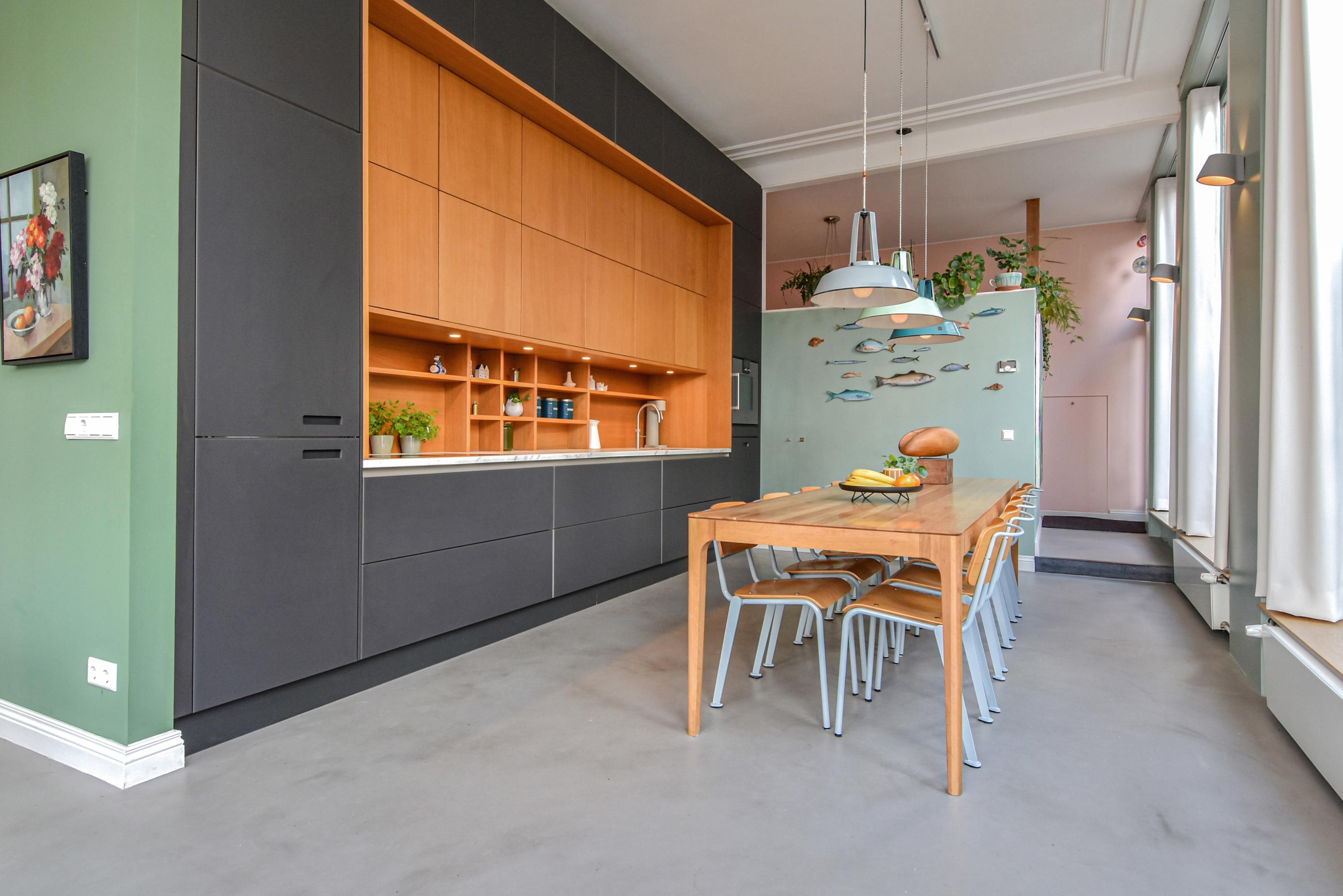 Bij binnenkomst word je direct verrast door de prachtige woonkeuken met haar indrukwekkende hoge glazen puien en een plafondhoogte van maar liefst 3,55 meter. In het plafond zit de originele gestucte sierlijst. De ruimte baadt in het licht en biedt volop plek voor een royale eettafel. De stijlvol afgewerkte keuken vormt het hart van de woning: een fijne ruimte met luxe inbouwapparatuur, waar je met plezier kookt en gasten ontvangt.