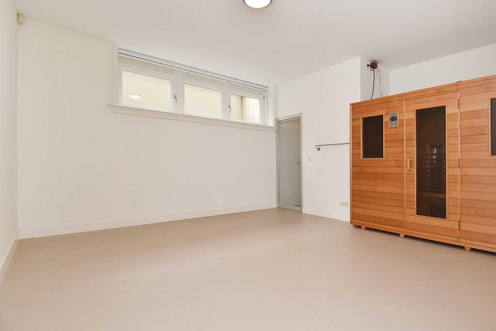 Ruim portaal. Toiletruimte met fonteintje. Sportruimte met sauna en douchegelegenheid. Multifunctionele ruimte met kastenwand. Opslagruimte alwaar de opstelplaats voor de boiler en warmtepomp (verwarming middels aardwarmte).