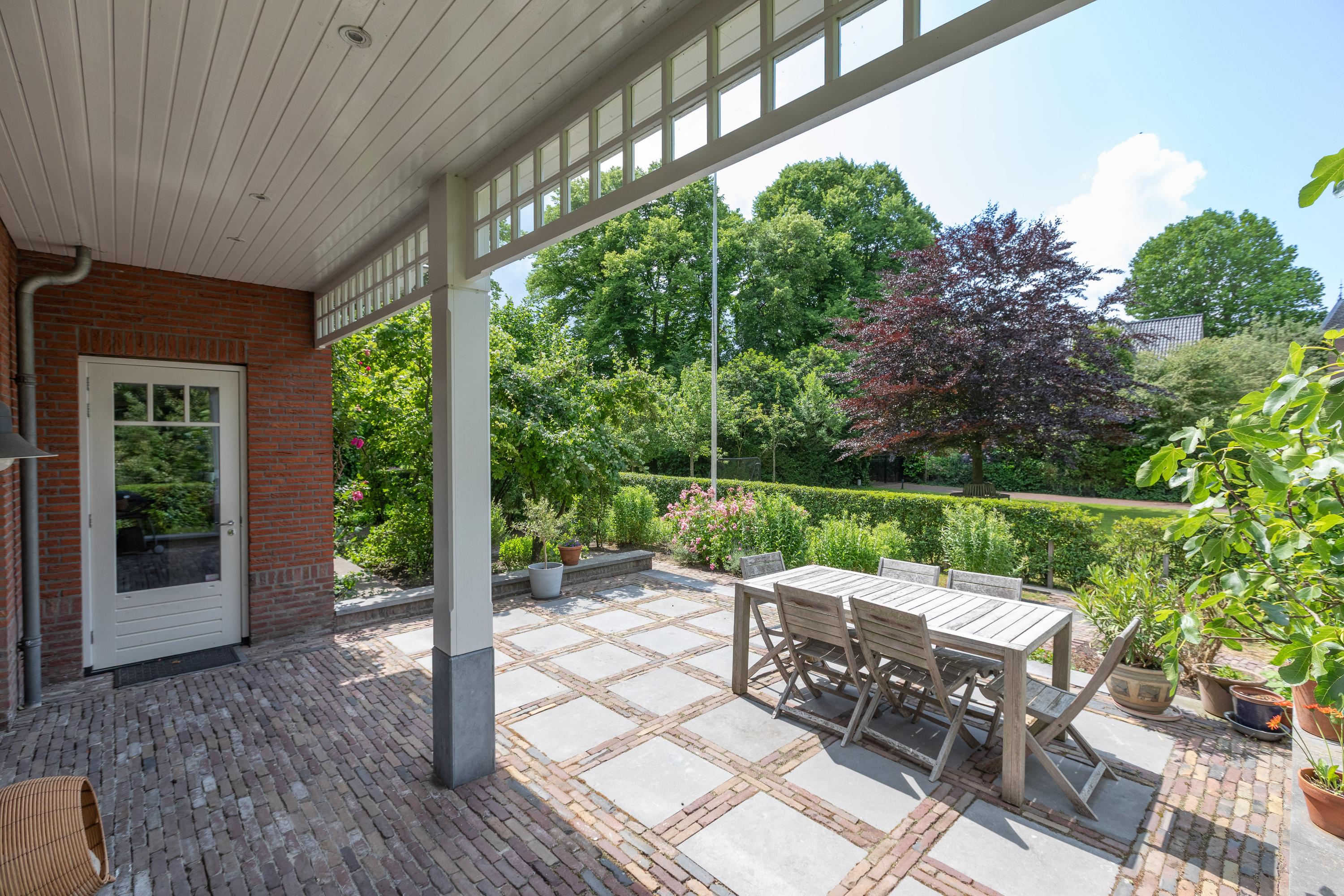 Entree, hal met garderoberuimte en meterkast. Ruime hal met aangrenzend de studeerkamer (3.80 x 3.40m). Toiletruimte. Woonkamer met fraaie visgraat-parketvloer en open haard. De woonkamer heeft meerdere openslaande deuren naar de omliggende tuin. Woonkeuken (Siematic, 4.18 x 5.30m) met Amerikaanse koel-/vrieskast, 6-pitsgaskookplaat met oven, afzuigkap, vaatwasser en aparte combi oven-/magnetron. Bijkeuken alwaar aansluitingen voor de wasmachine en droger. Zonnig, riant terras (6.05 x 6.22m).