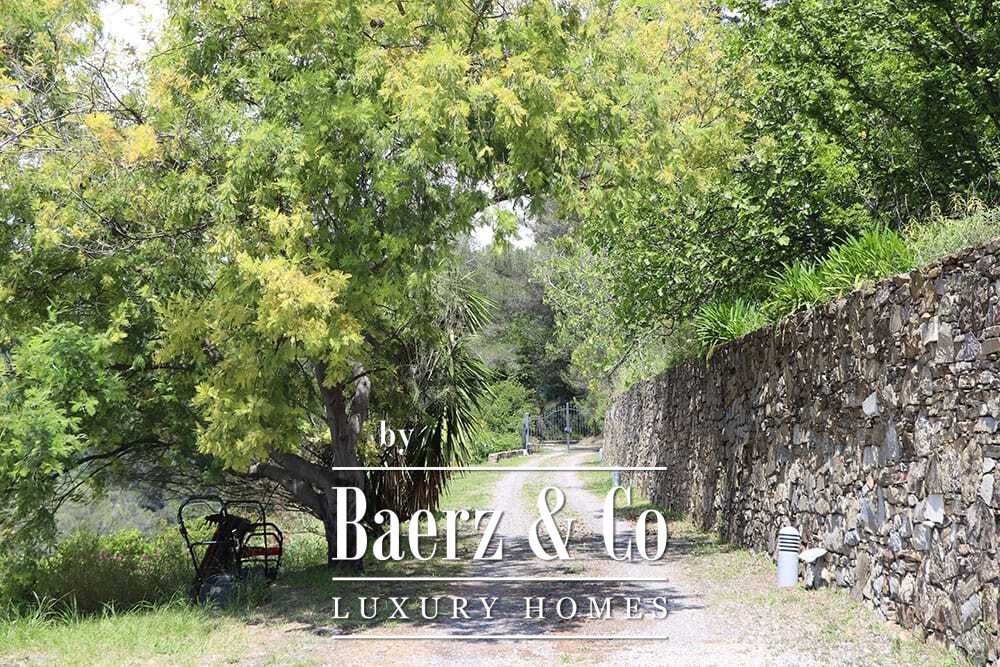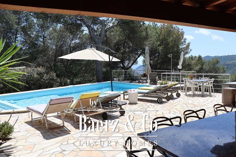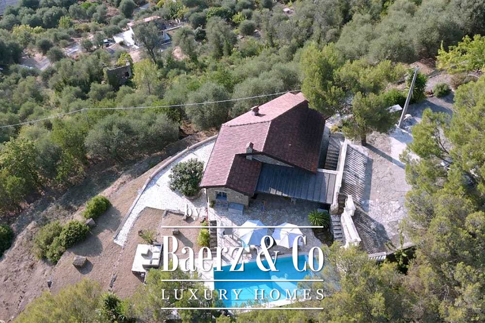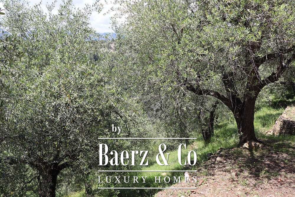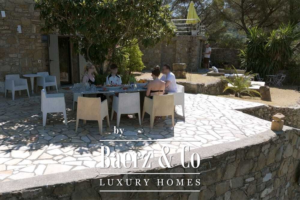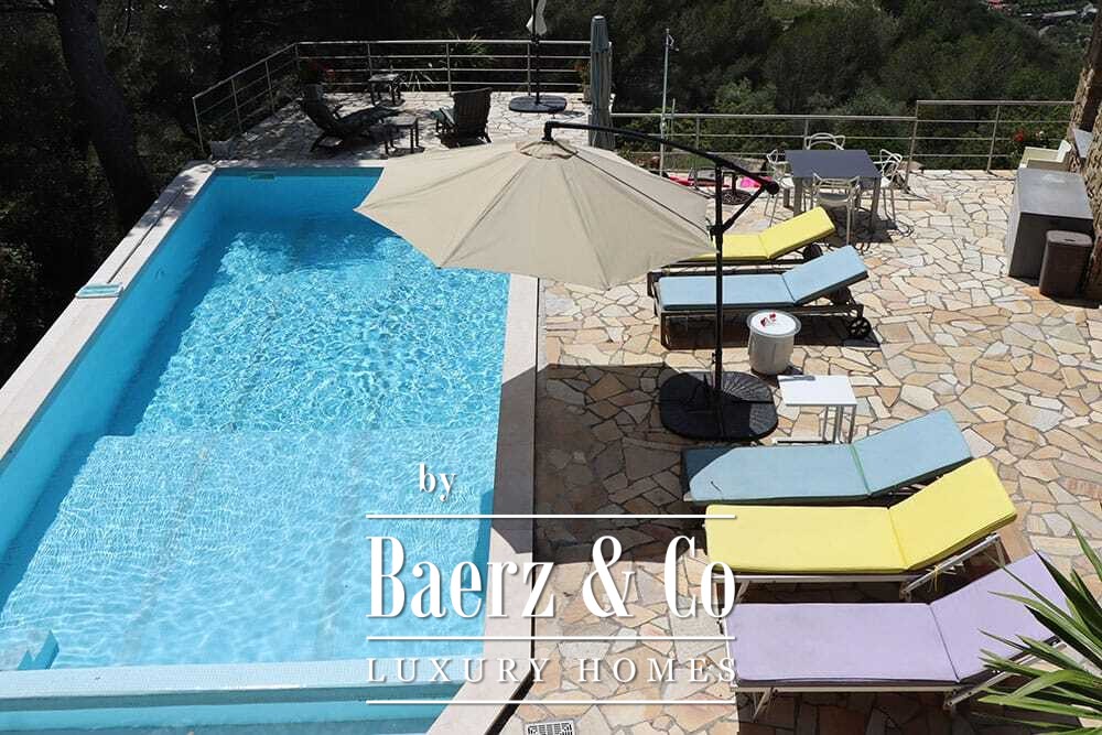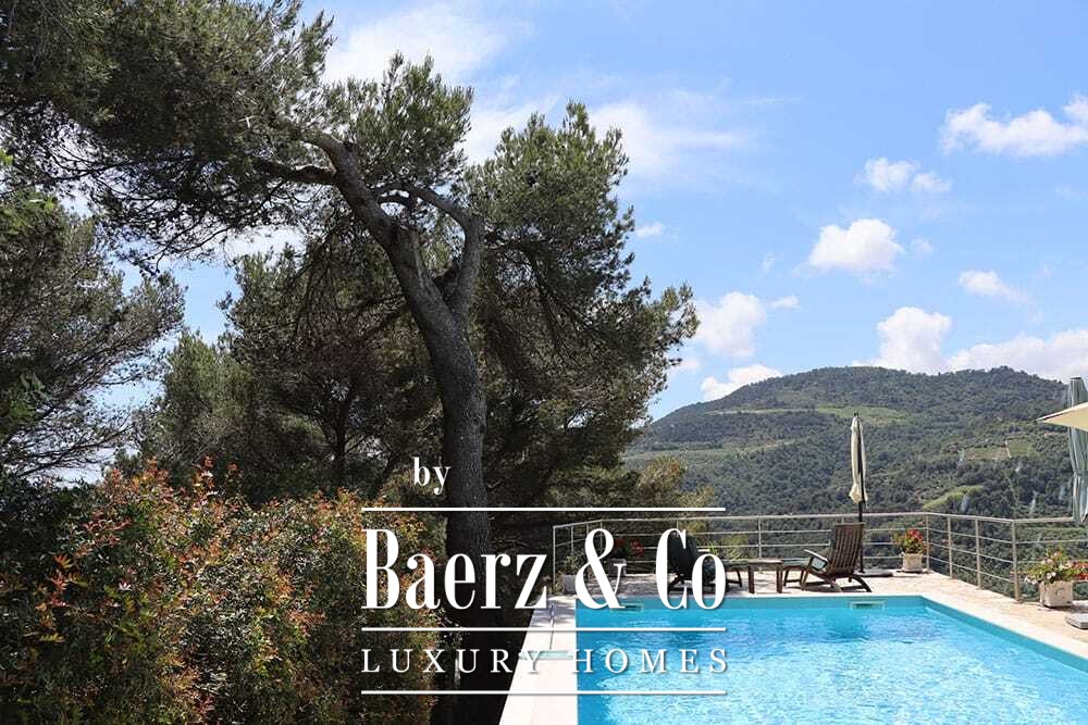 Het zwembad van 11 bij 4 meter, volledig gerenoveerd in 2022, ligt naast een royaal terras met uitzicht over de vallei en de zee. Diverse terrassen, buitenkeukens en schaduwrijke pergola’s nodigen uit tot ontspannen tafelen in alle seizoenen. Paden rondom de woning worden omzoomd door olijfgaarden, waar de vele zonuren zorgen voor een indrukwekkende oogst.