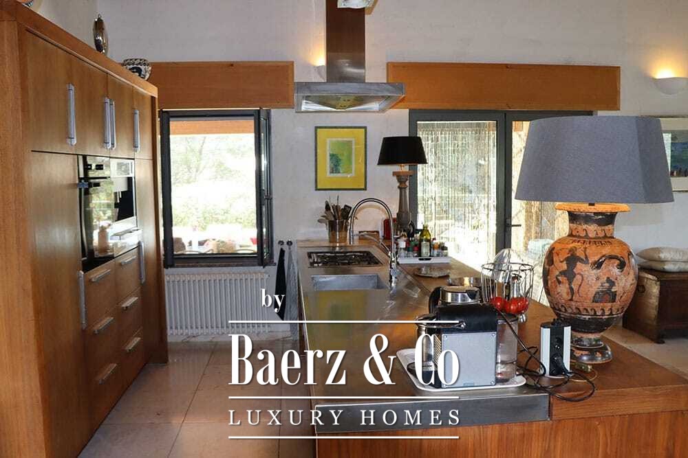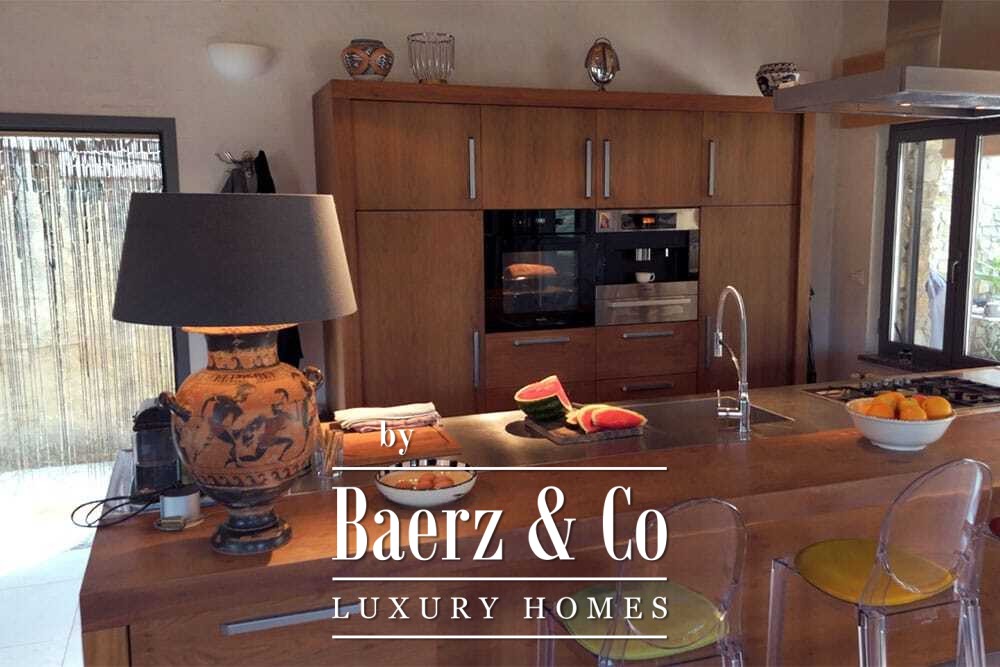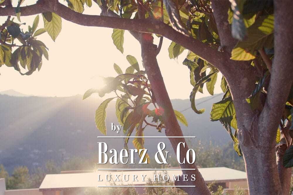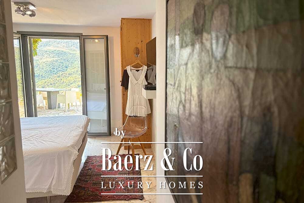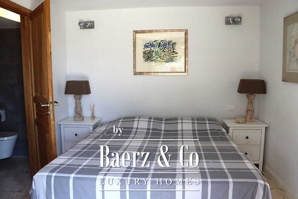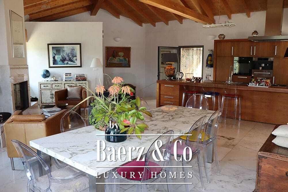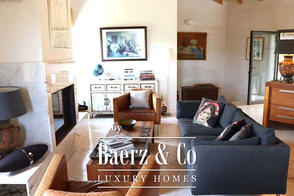 Het huis beslaat twee verdiepingen en beschikt over vier slaapkamers en vier badkamers. Drie slaapkamers op de begane grond openen via openslaande deuren naar een lager gelegen terras met uitzicht op de bergen. De master suite heeft een ruime badkamer met losstaand bad, aparte douche, dubbele marmeren wastafels en designafwerking, wat zorgt voor een sfeer van rust en privacy. De studeerkamer met eigen ingang biedt flexibele mogelijkheden voor gasten of werk. Boven grenst een woonkamer met balkenplafond en open haard aan een keuken van walnoothout en roestvrij staal, uitgerust met hoogwaardige Miele-apparatuur. Hoge glazen deuren leiden naar een lounge met tweede open haard en toegang tot terrassen met granieten tafels en Philippe Starck-stoelen.
