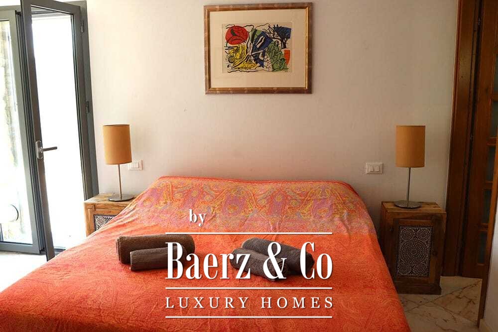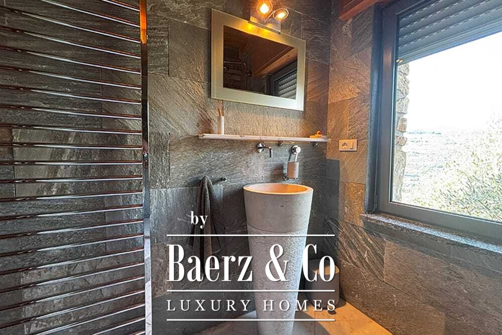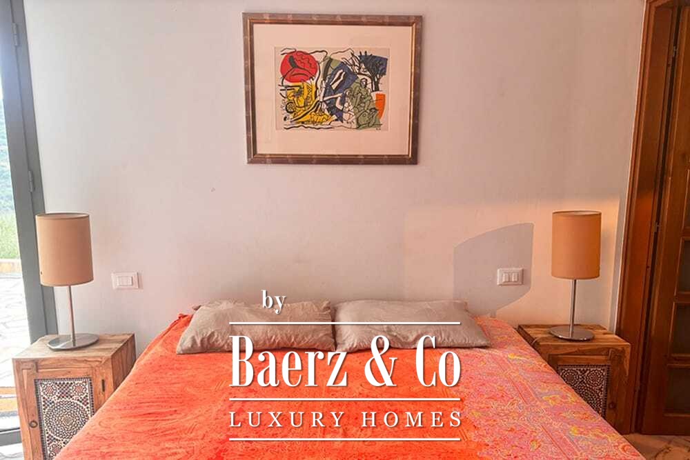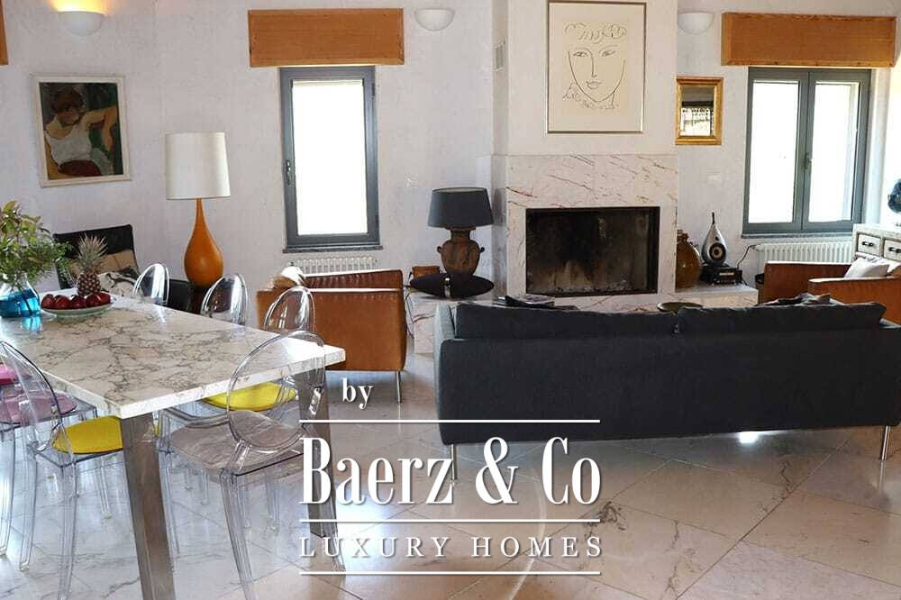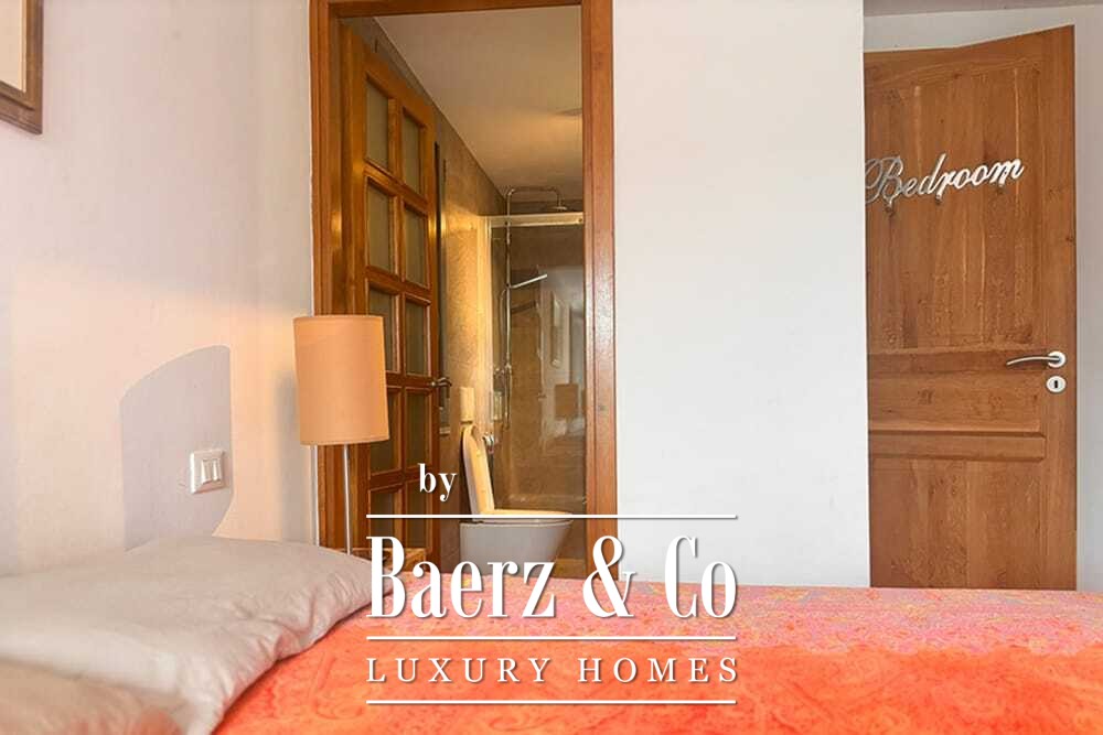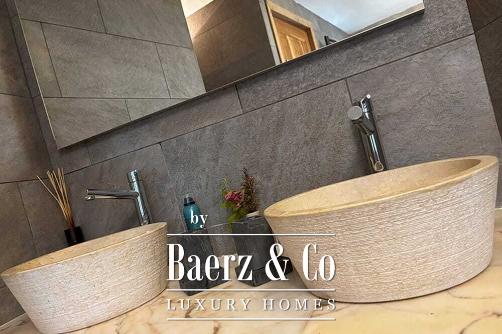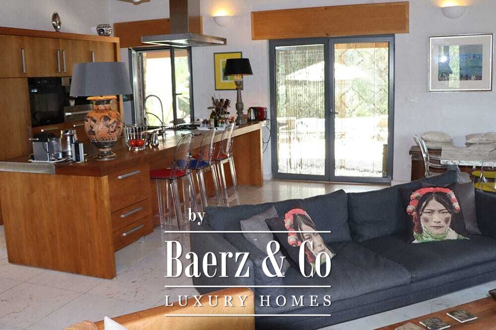 Het huis beslaat twee verdiepingen en beschikt over vier slaapkamers en vier badkamers. Drie slaapkamers op de begane grond openen via openslaande deuren naar een lager gelegen terras met uitzicht op de bergen. De master suite heeft een ruime badkamer met losstaand bad, aparte douche, dubbele marmeren wastafels en designafwerking, wat zorgt voor een sfeer van rust en privacy. De studeerkamer met eigen ingang biedt flexibele mogelijkheden voor gasten of werk. Boven grenst een woonkamer met balkenplafond en open haard aan een keuken van walnoothout en roestvrij staal, uitgerust met hoogwaardige Miele-apparatuur. Hoge glazen deuren leiden naar een lounge met tweede open haard en toegang tot terrassen met granieten tafels en Philippe Starck-stoelen.