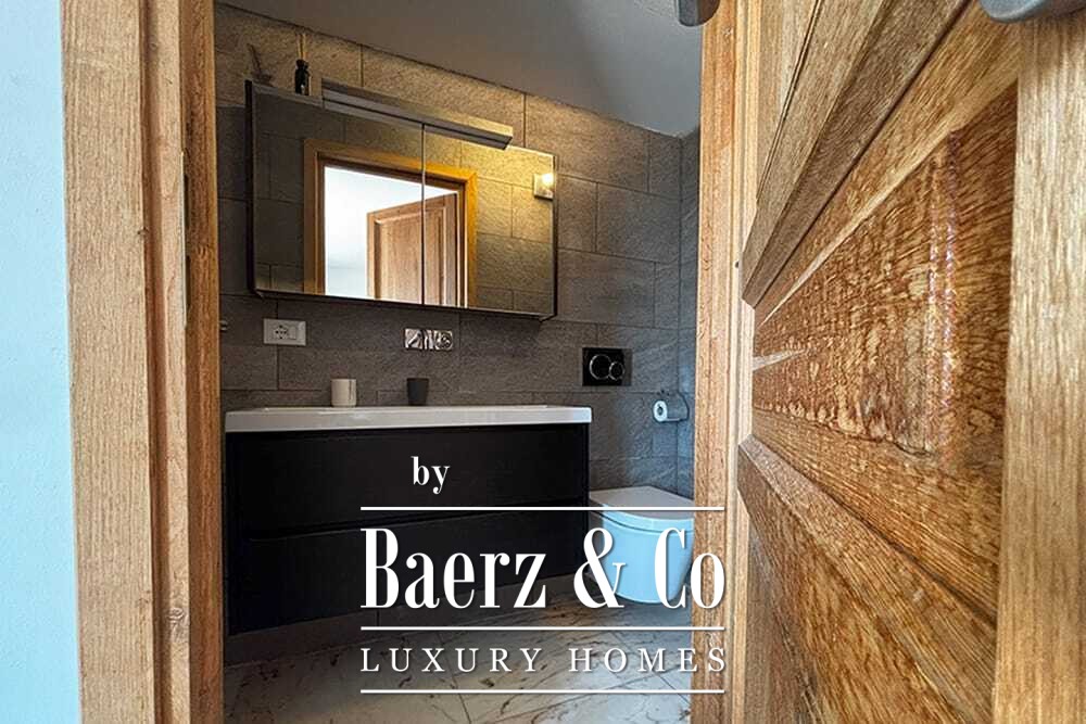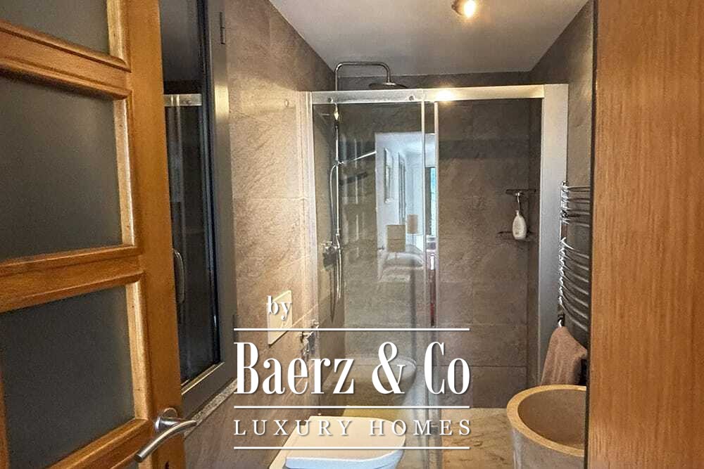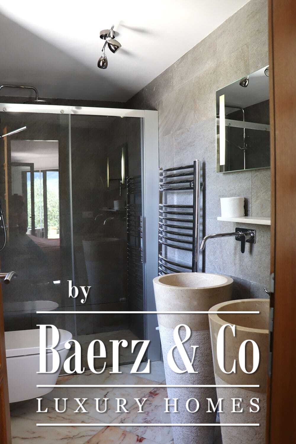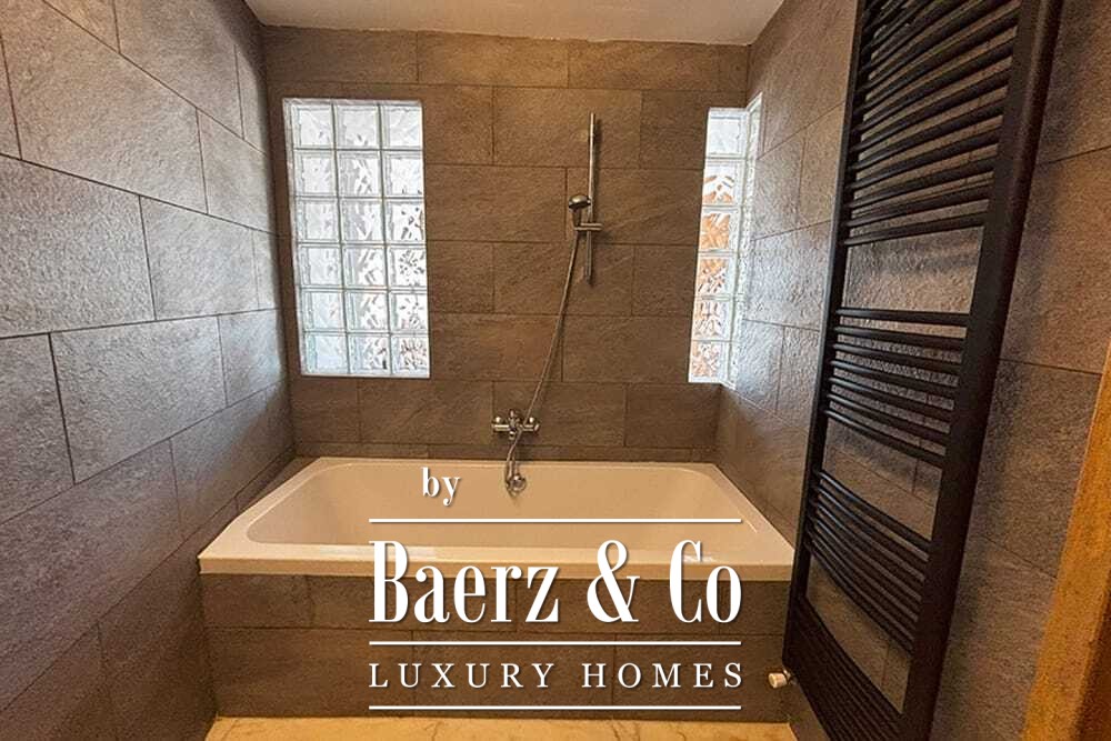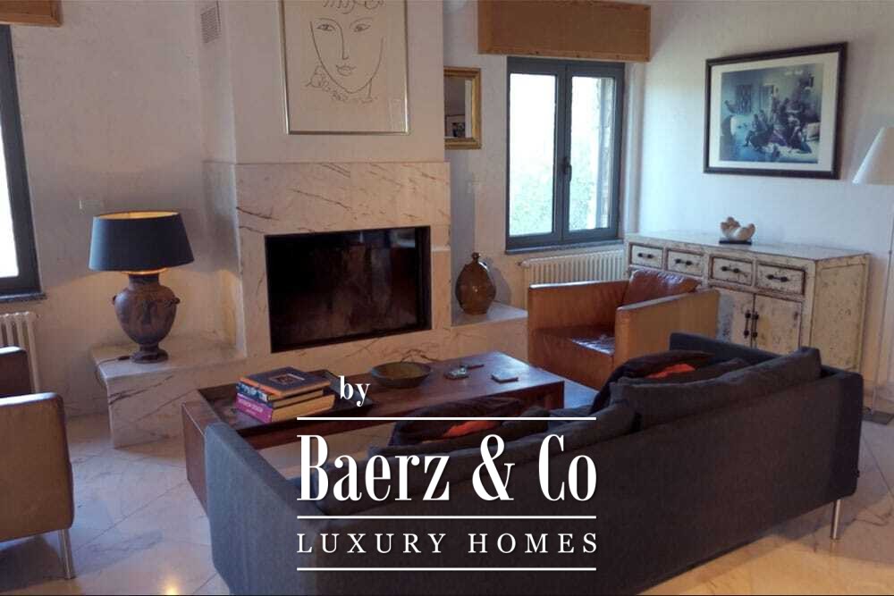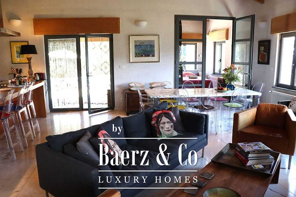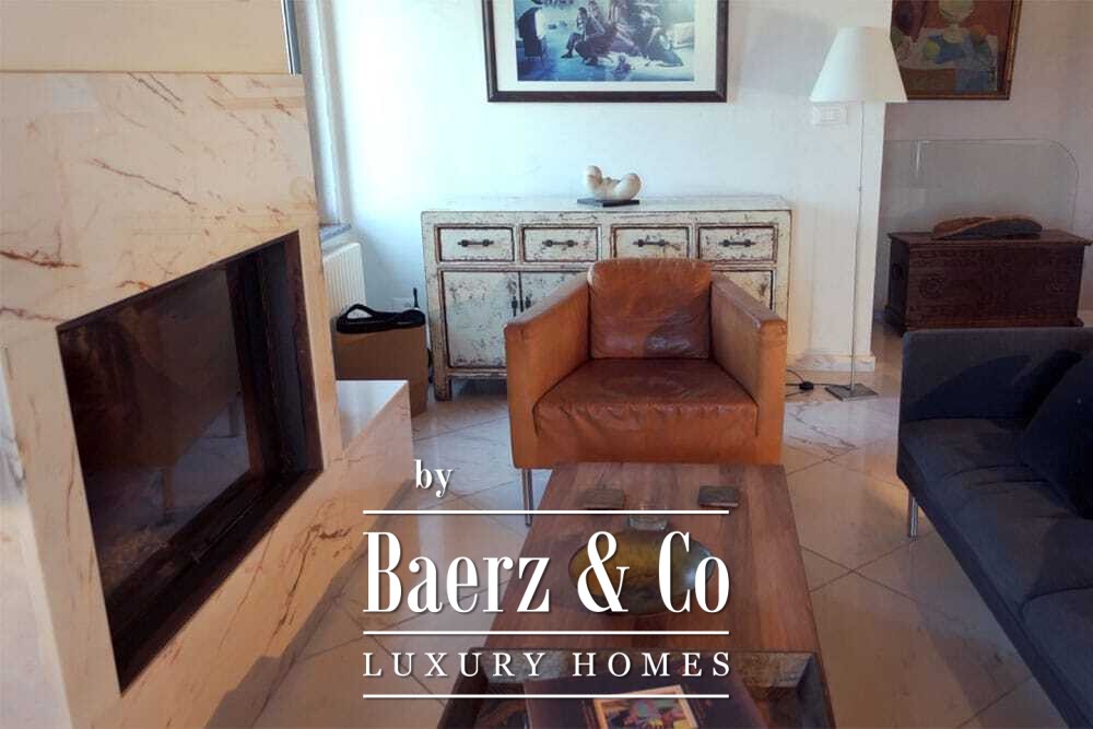 Het huis beslaat twee verdiepingen en beschikt over vier slaapkamers en vier badkamers. Drie slaapkamers op de begane grond openen via openslaande deuren naar een lager gelegen terras met uitzicht op de bergen. De master suite heeft een ruime badkamer met losstaand bad, aparte douche, dubbele marmeren wastafels en designafwerking, wat zorgt voor een sfeer van rust en privacy. De studeerkamer met eigen ingang biedt flexibele mogelijkheden voor gasten of werk. Boven grenst een woonkamer met balkenplafond en open haard aan een keuken van walnoothout en roestvrij staal, uitgerust met hoogwaardige Miele-apparatuur. Hoge glazen deuren leiden naar een lounge met tweede open haard en toegang tot terrassen met granieten tafels en Philippe Starck-stoelen.