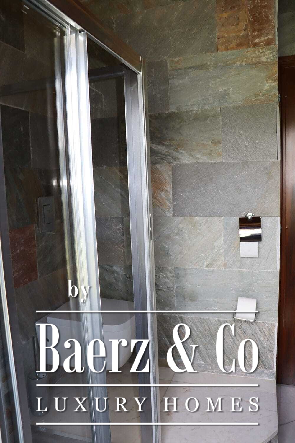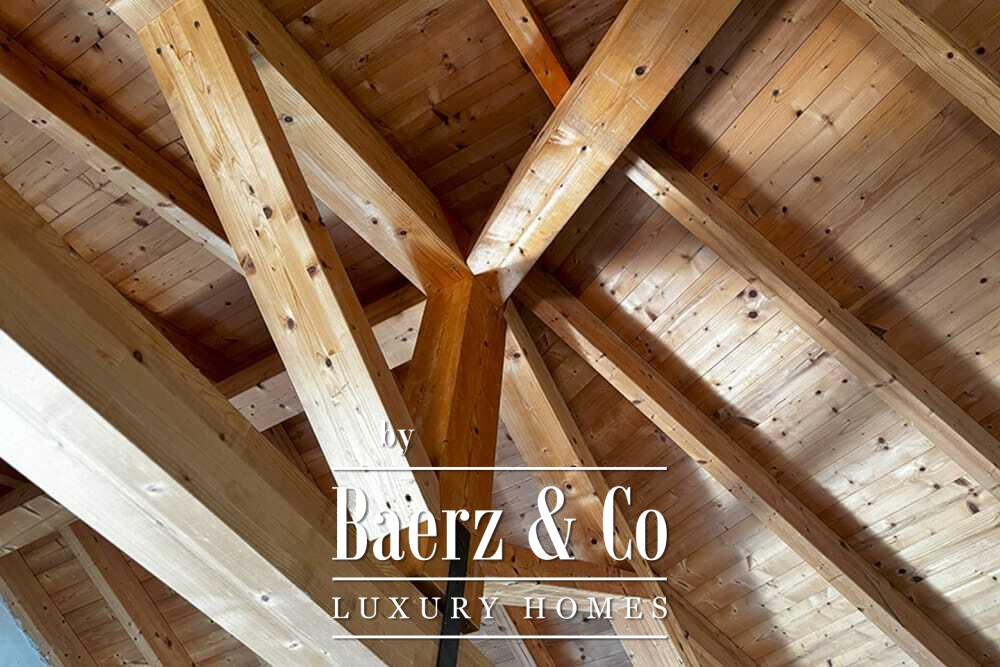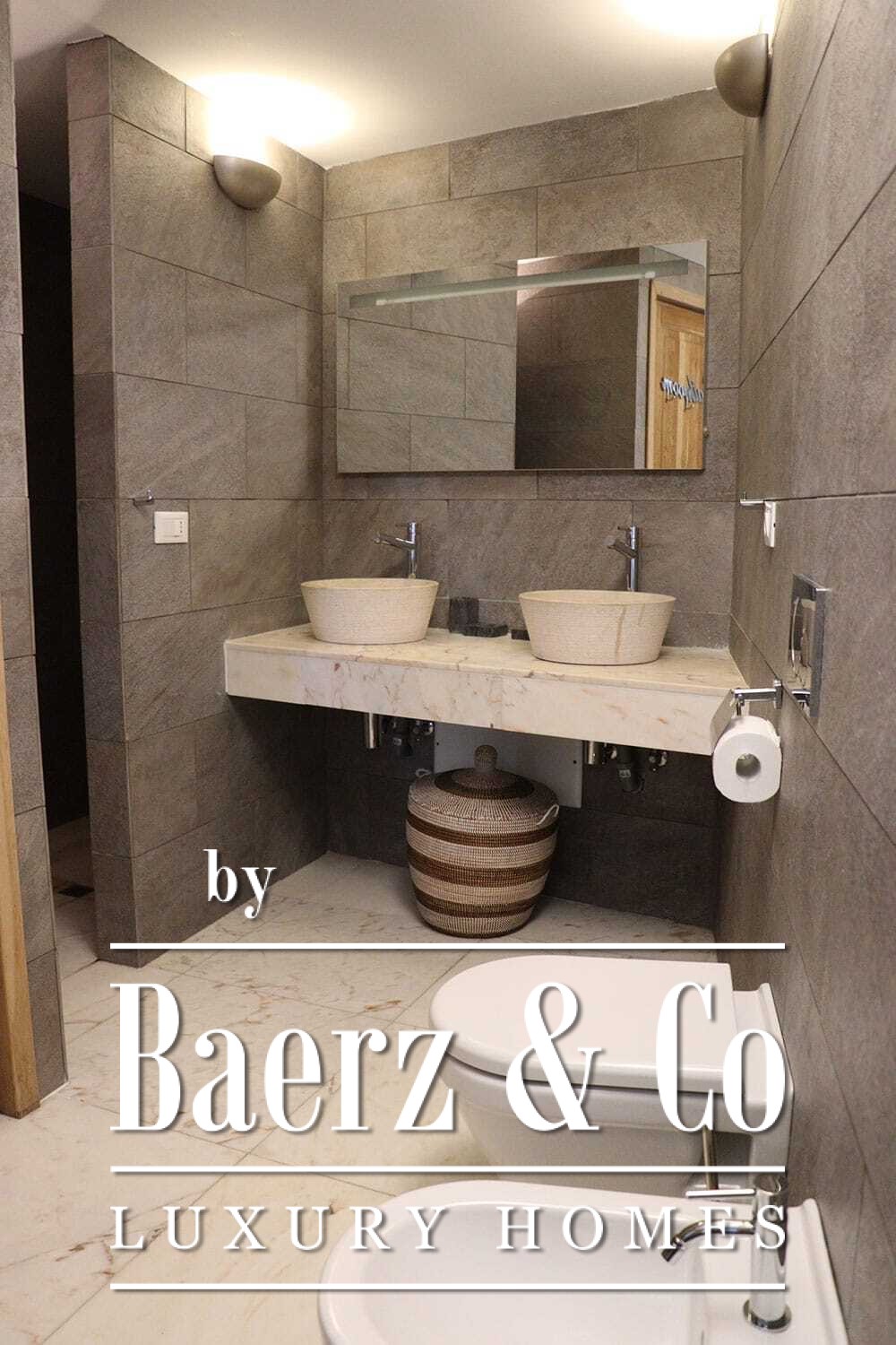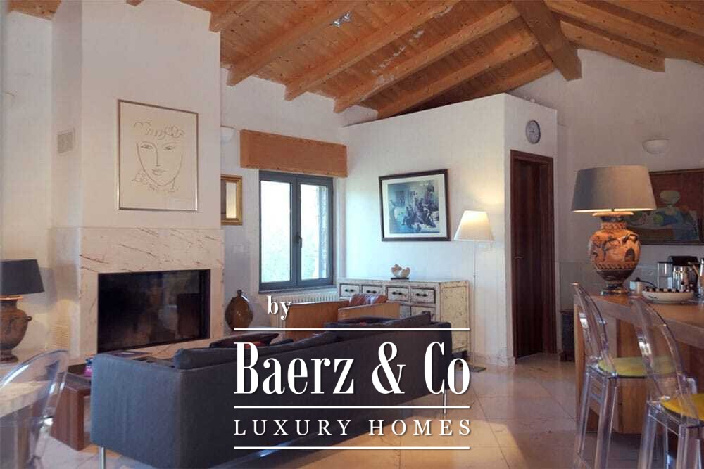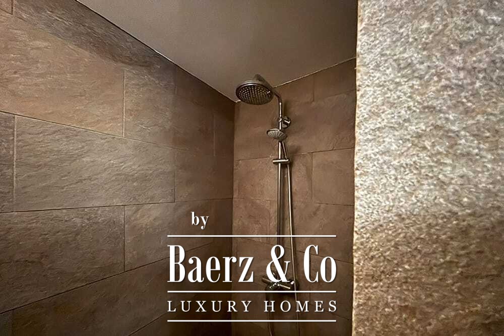 Het huis beslaat twee verdiepingen en beschikt over vier slaapkamers en vier badkamers. Drie slaapkamers op de begane grond openen via openslaande deuren naar een lager gelegen terras met uitzicht op de bergen. De master suite heeft een ruime badkamer met losstaand bad, aparte douche, dubbele marmeren wastafels en designafwerking, wat zorgt voor een sfeer van rust en privacy. De studeerkamer met eigen ingang biedt flexibele mogelijkheden voor gasten of werk. Boven grenst een woonkamer met balkenplafond en open haard aan een keuken van walnoothout en roestvrij staal, uitgerust met hoogwaardige Miele-apparatuur. Hoge glazen deuren leiden naar een lounge met tweede open haard en toegang tot terrassen met granieten tafels en Philippe Starck-stoelen.