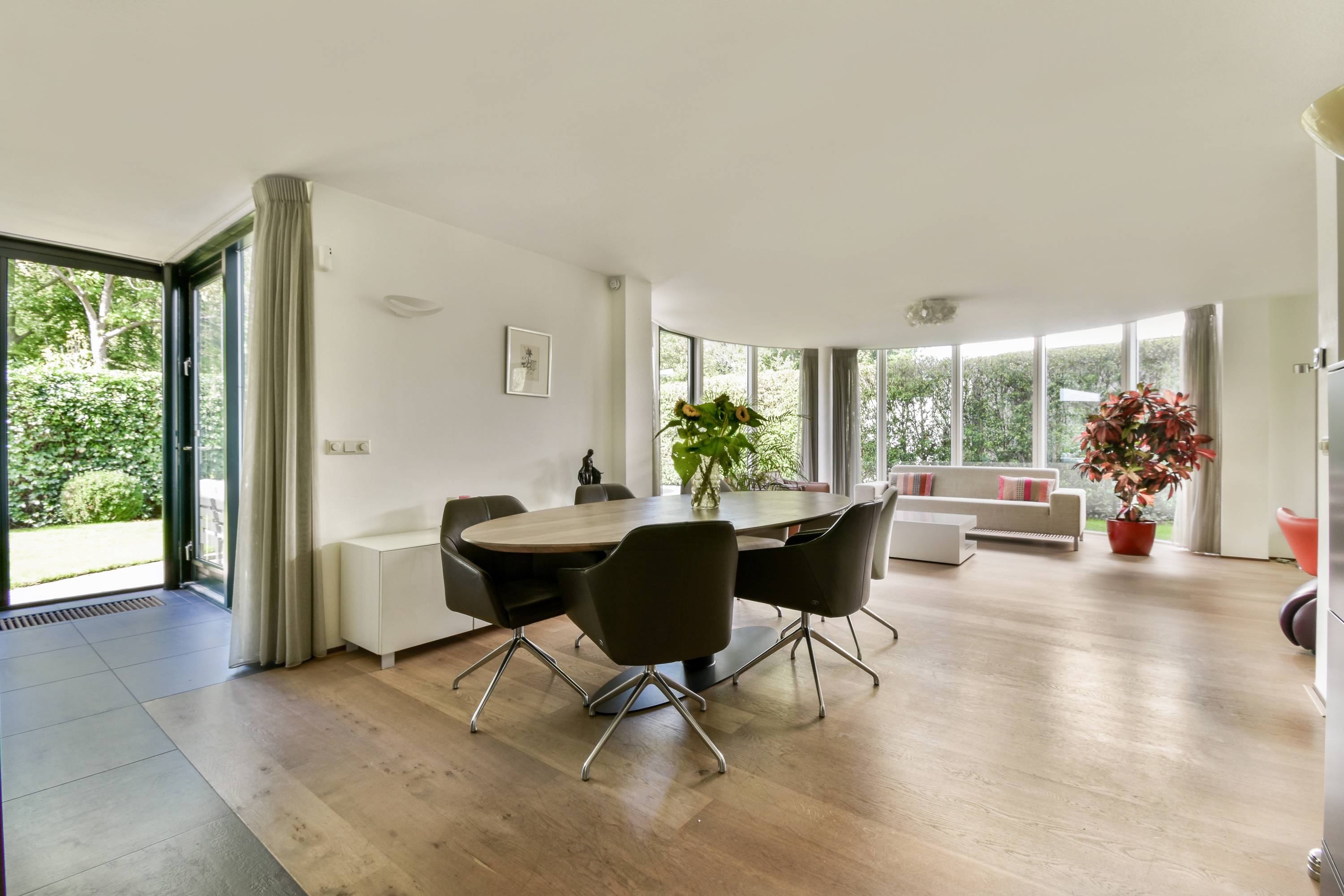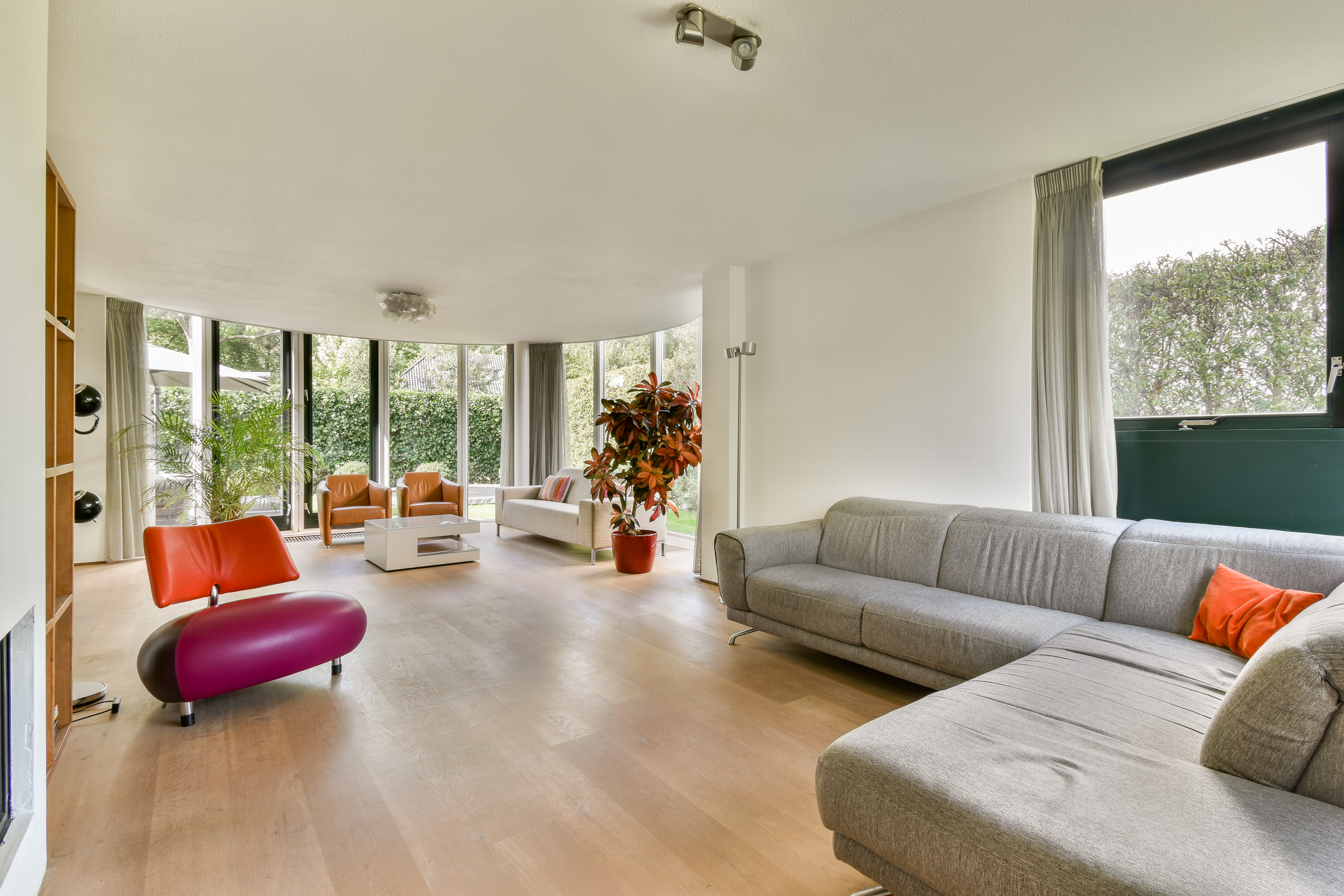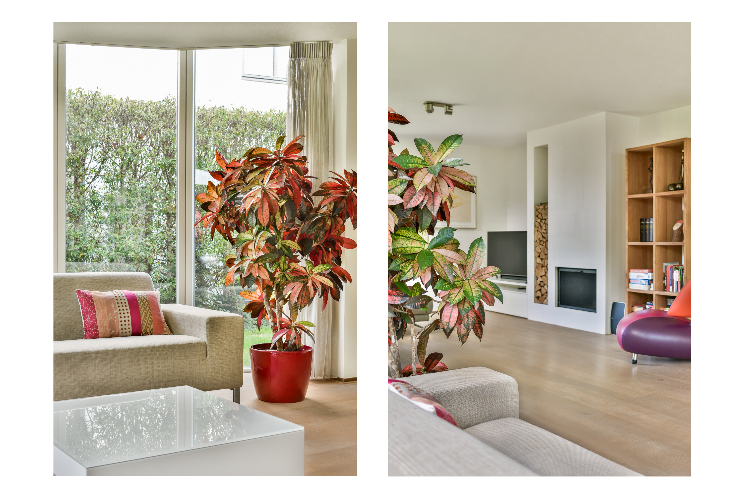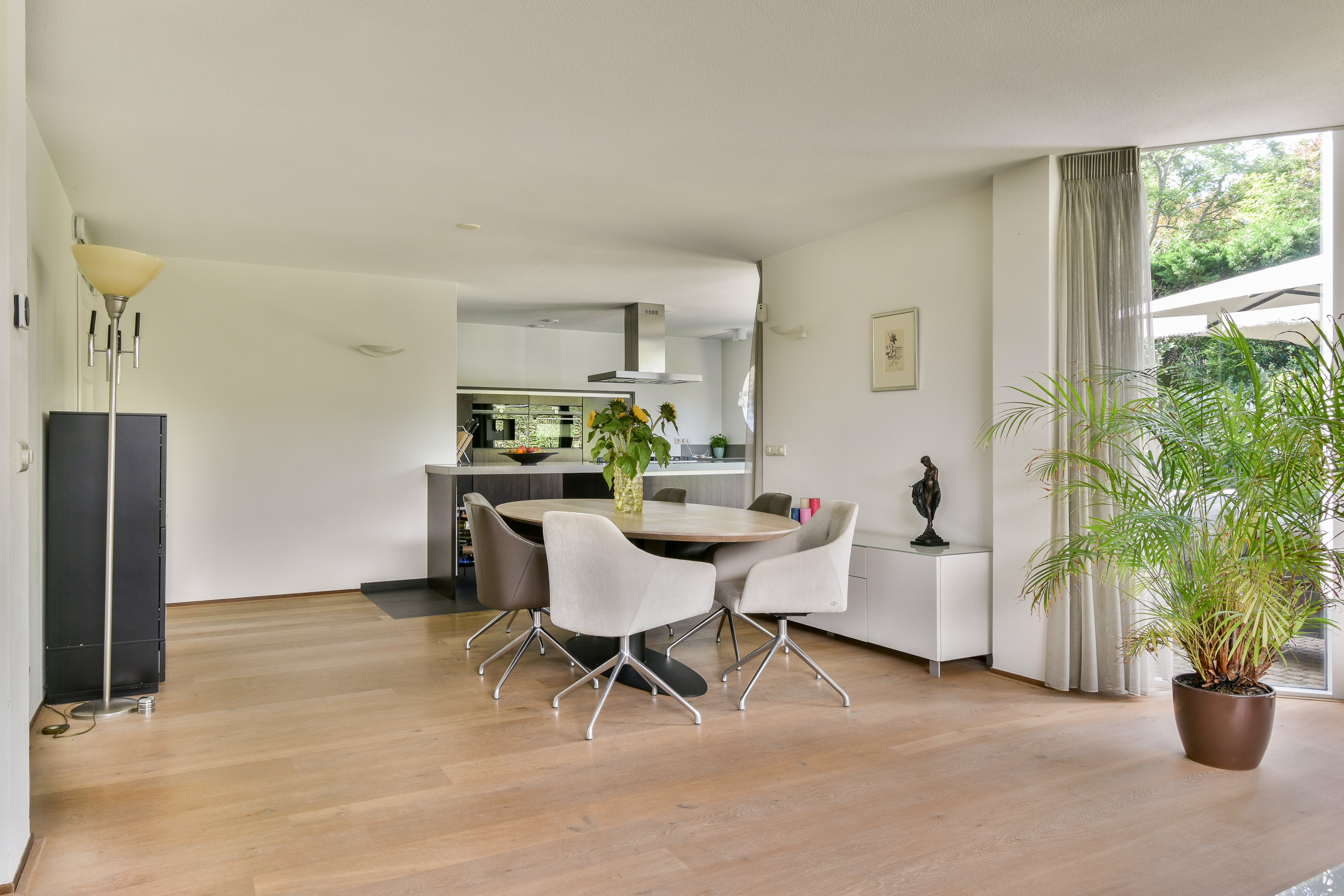 Royale living met een grote ronde erker met grote openslaande deuren naar het terras en een sfeervolle haard aan de voorzijde. Door de grote raampartijen op het westen is er een prachtige lichtinval. In de hal is een eiken parketvloer aanwezig, welke doorloopt in de woonkamer. De wanden en het plafond zijn strak afgewerkt.