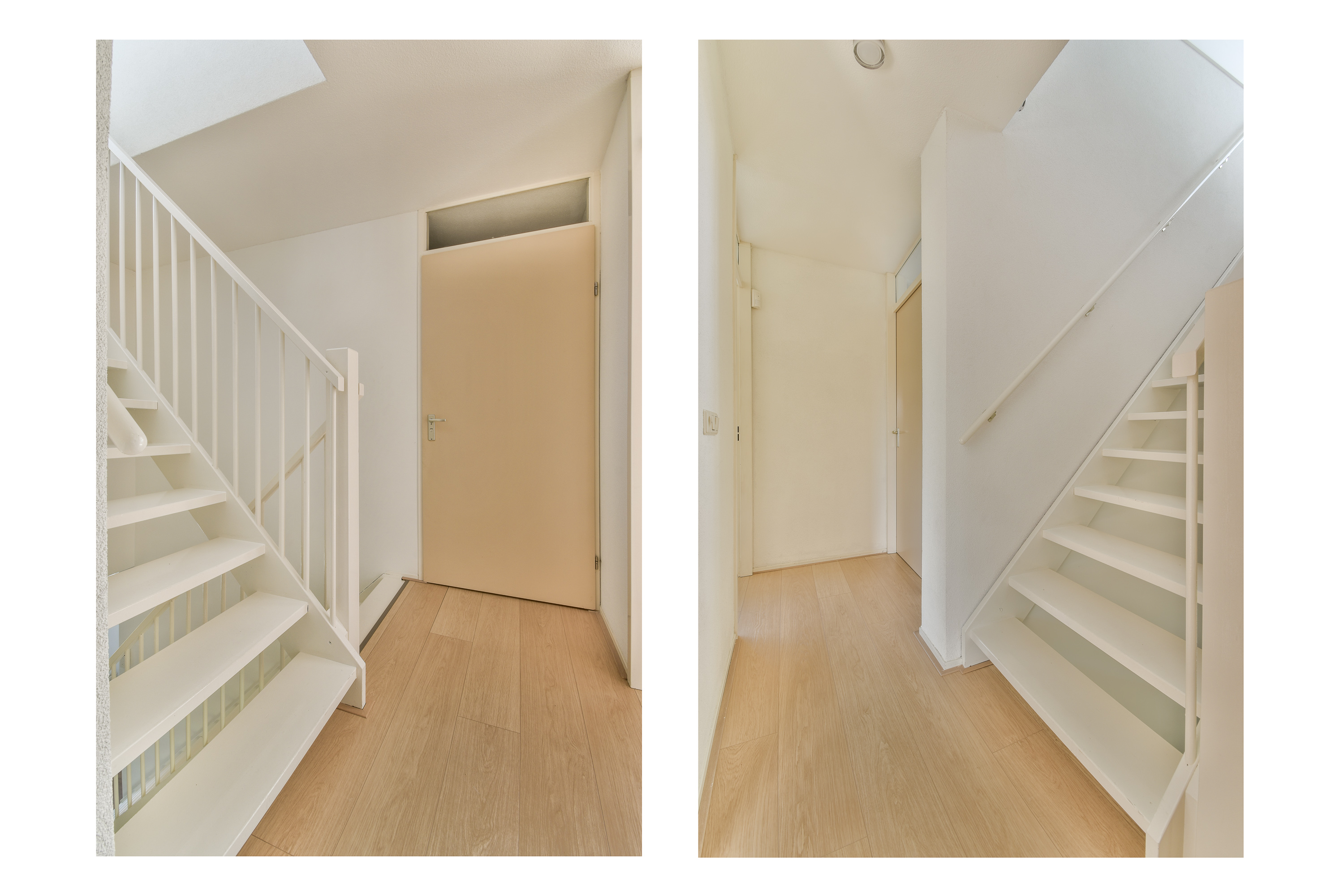 Entree in ruime hal met fraai trappenhuis en garderoberuimte. De meterkast is voorzien van een uitgebreide groepeninstallatie.