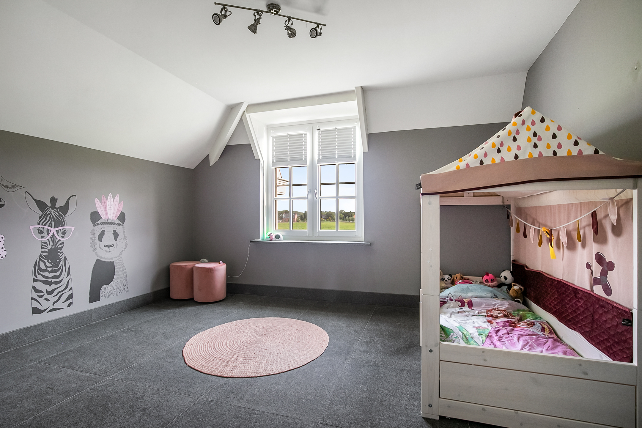 De royale overloop met vide biedt toegang tot 3 ruime slaapkamers, de badkamer, toiletruimte en de zolder. Ook is er toegang tot een charmant Frans balkon welke een fraai uitzicht biedt op de omgeving. De overloop en alle slaapkamers hebben dezelfde afwerking, natuurstenen vloer, stucwerk wanden en een stucwerk plafond.