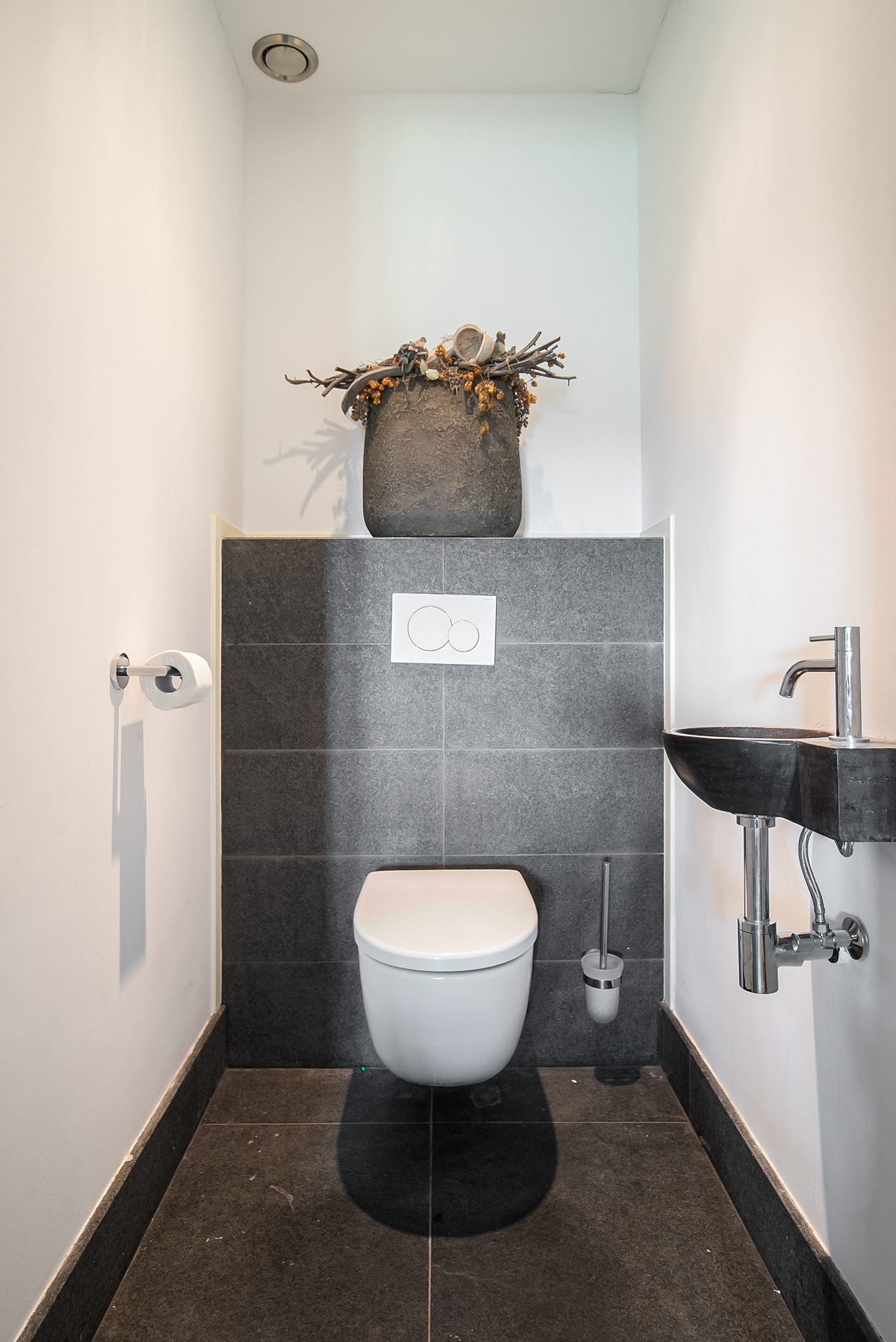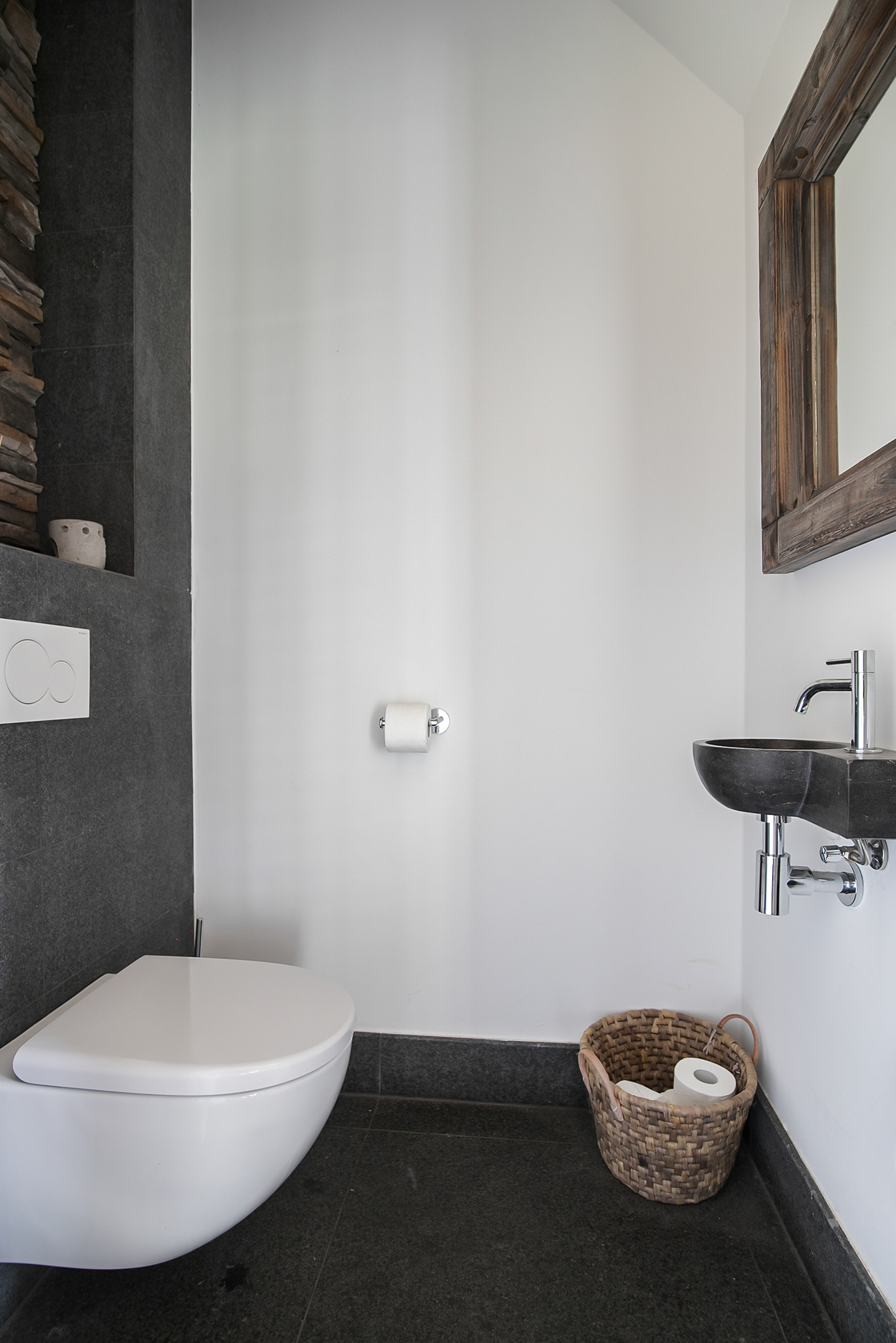 Vanuit de woonkamer is er toegang tot de logeerkamer. Deze slaapkamer is voorzien van een natuurstenen vloer, stucwerk wanden en een stucwerk plafond met inbouwverlichting. Vanuit deze kamer is er toegang tot de badkamer. Deze badkamer is afgewerkt met dezelfde natuurstenen vloer als in de rest van de ruimtes. De wanden en het plafond zijn voorzien van stucwerk. De badkamer is verder uitgerust met een ruime inloopdouche met sunshower, twee wastafels met meubel een zwevend toilet en een design radiator. Een raampartij zorgt voor natuurlijk lichtinval. Vanuit de badkamer loop je verder naar de masterbedroom.