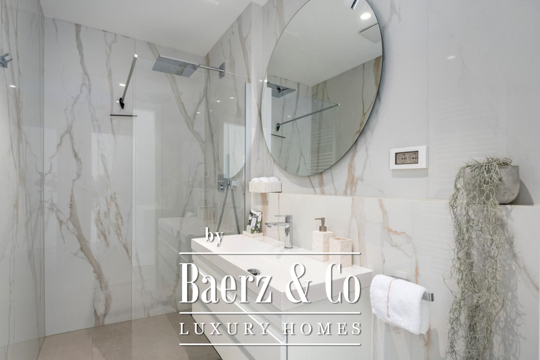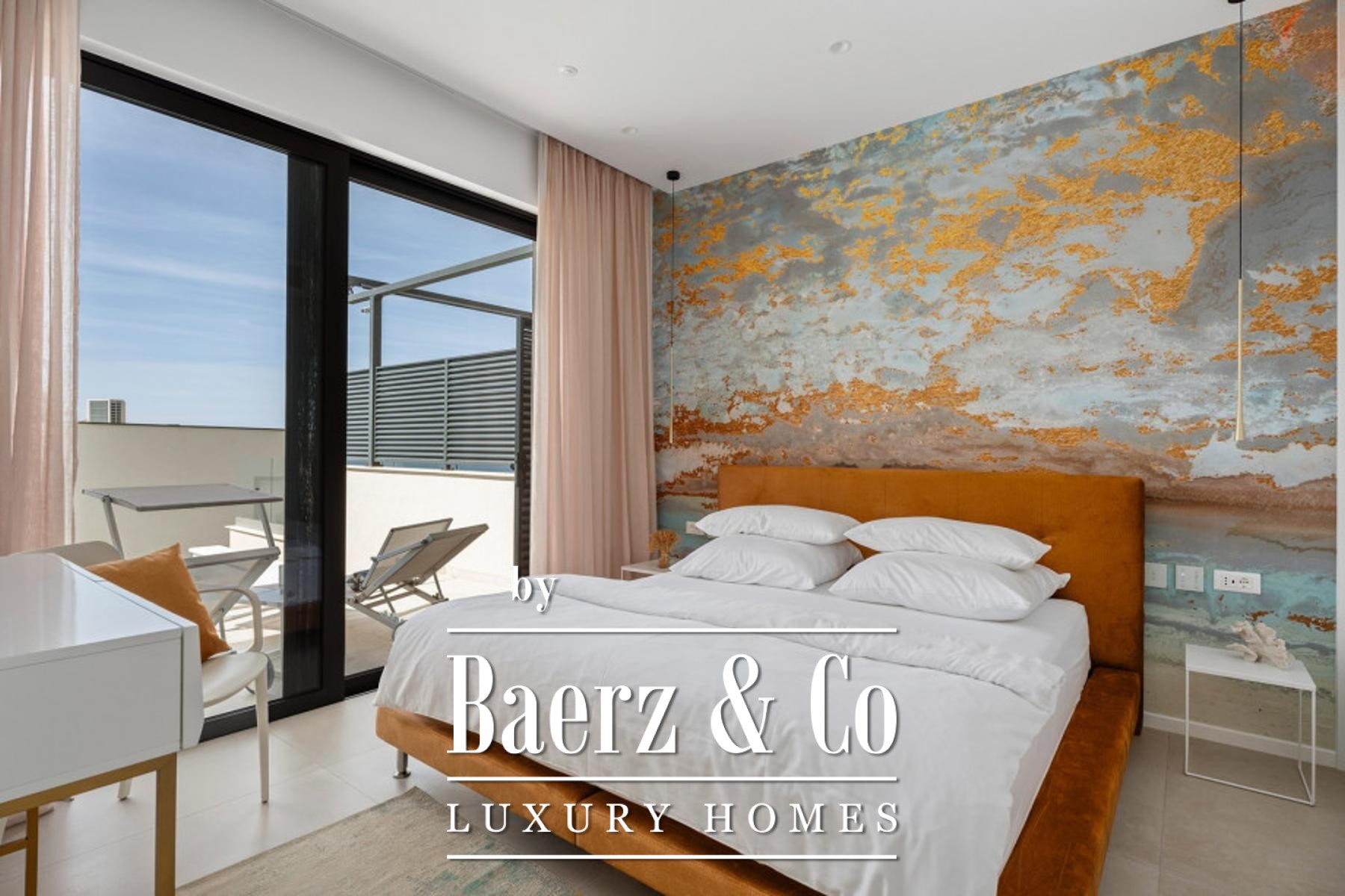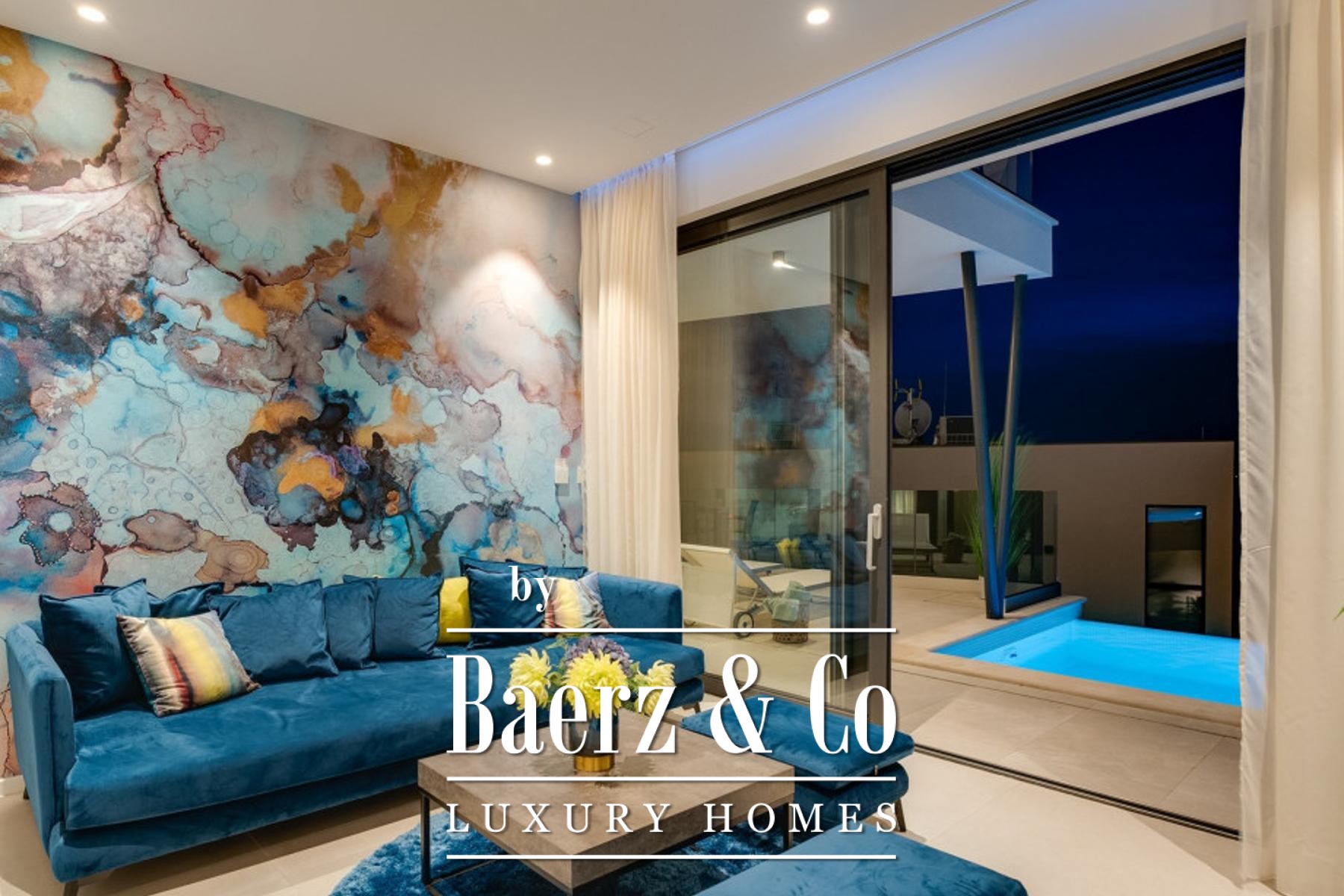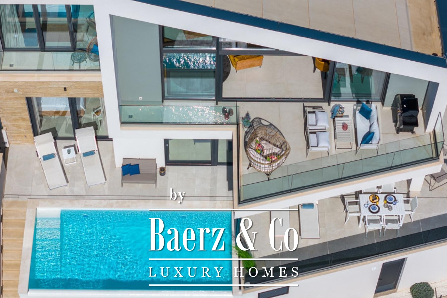 Drie slaapkamers, twee badkamers en een extra gastentoilet onderstrepen de functionele elegantie. De bovenverdieping kenmerkt zich door royale plafondhoogtes en panoramisch zeezicht vanuit het woongedeelte, wat een gevoel van ruimte en licht geeft. Door de hele woning zijn slimme huistechnologie, vloerverwarming, airconditioning en elektrisch bedienbare rolluiken geïntegreerd. Twee vaste parkeerplaatsen bieden extra gemak.