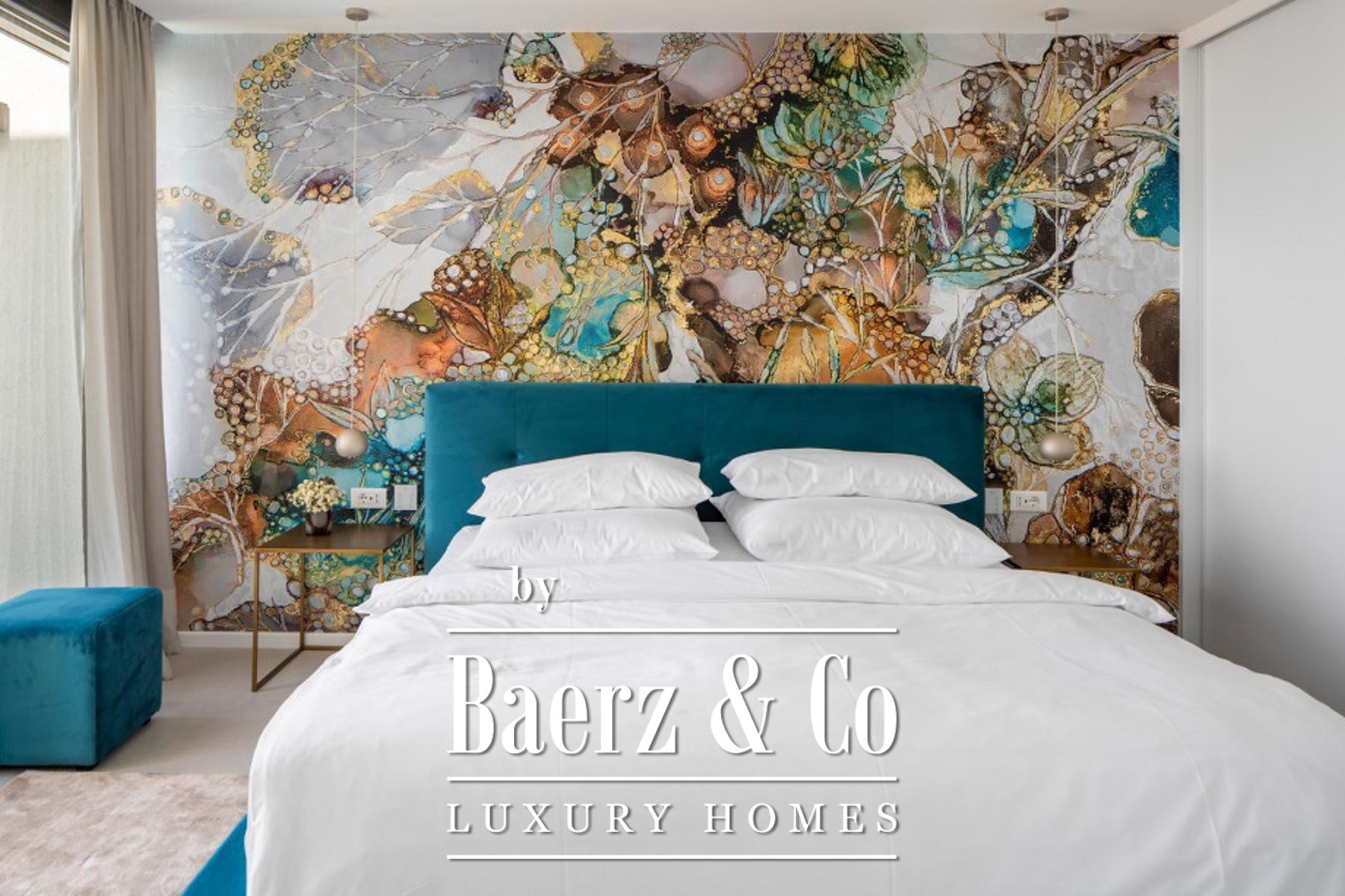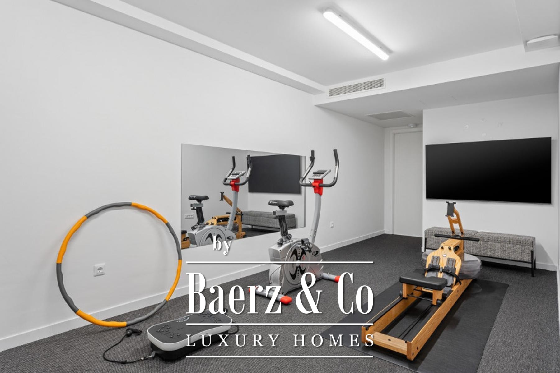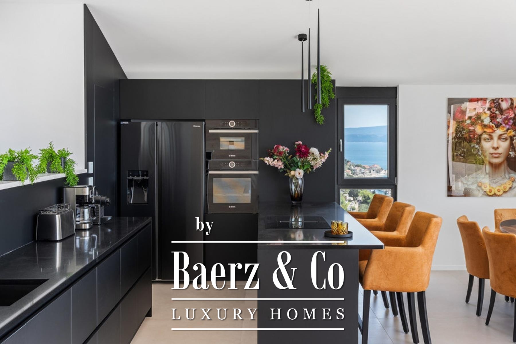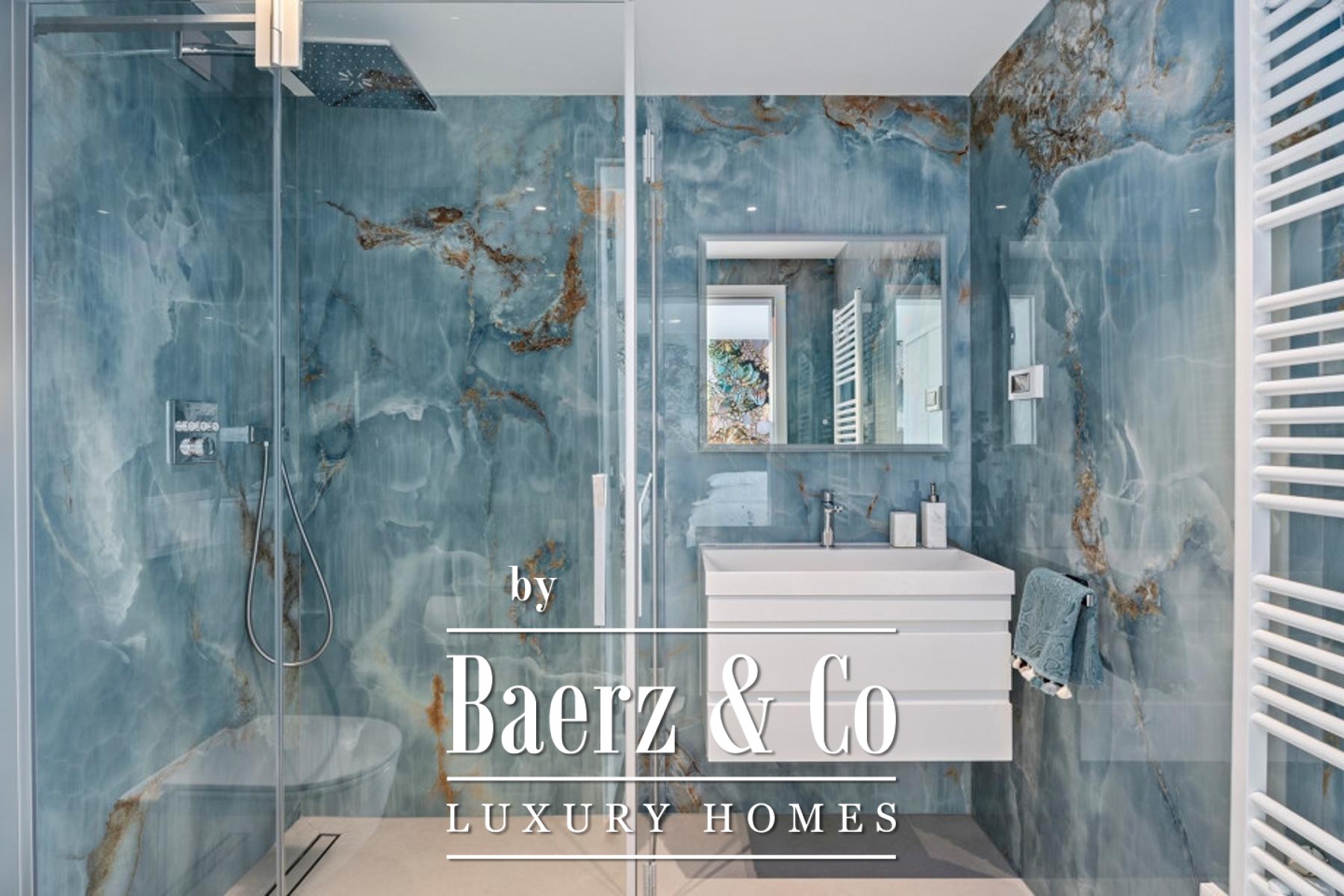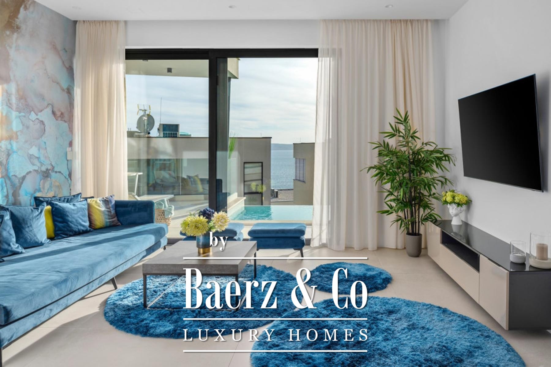 Drie slaapkamers, twee badkamers en een extra gastentoilet onderstrepen de functionele elegantie. De bovenverdieping kenmerkt zich door royale plafondhoogtes en panoramisch zeezicht vanuit het woongedeelte, wat een gevoel van ruimte en licht geeft. Door de hele woning zijn slimme huistechnologie, vloerverwarming, airconditioning en elektrisch bedienbare rolluiken geïntegreerd. Twee vaste parkeerplaatsen bieden extra gemak.