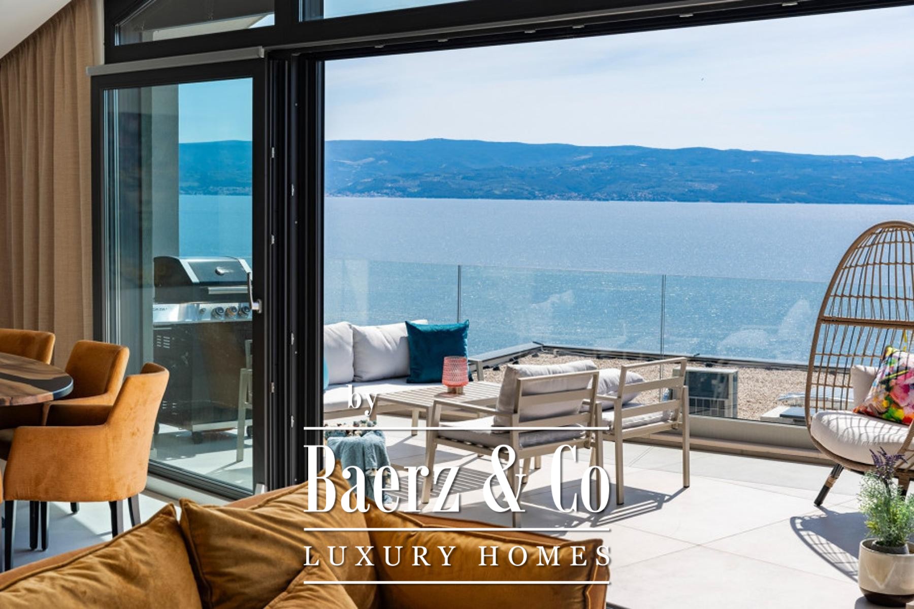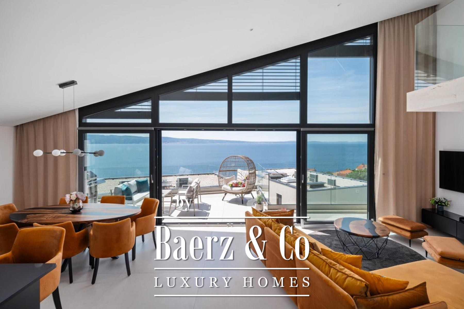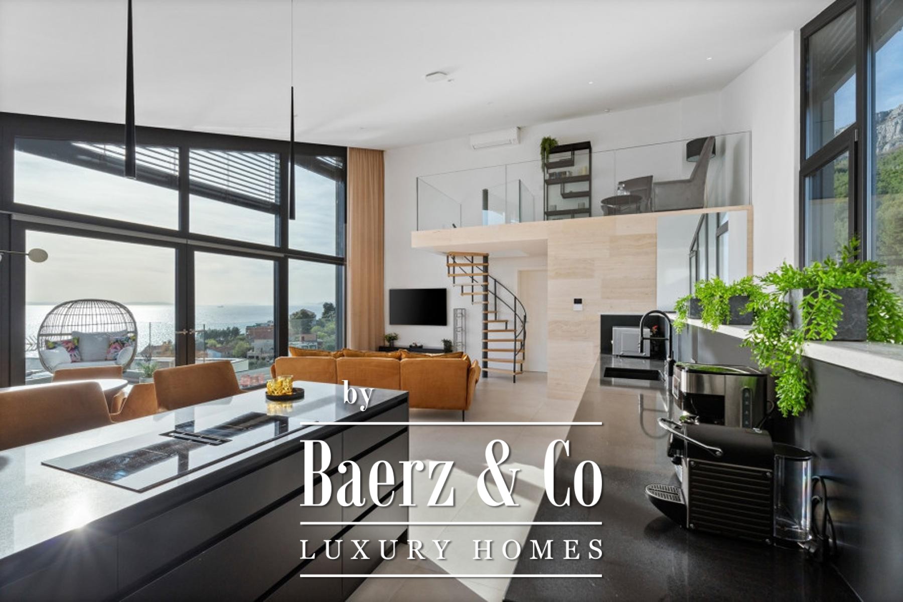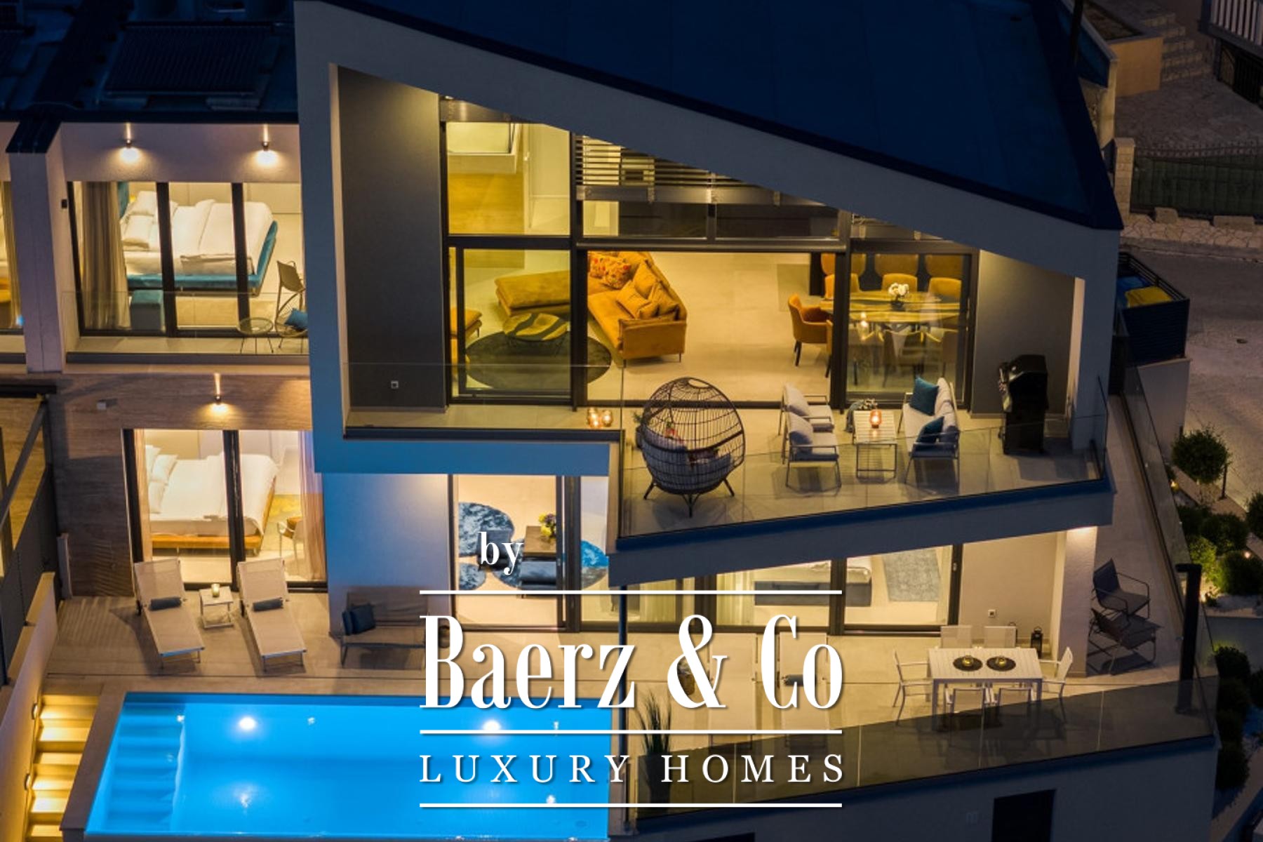 Drie slaapkamers, twee badkamers en een extra gastentoilet onderstrepen de functionele elegantie. De bovenverdieping kenmerkt zich door royale plafondhoogtes en panoramisch zeezicht vanuit het woongedeelte, wat een gevoel van ruimte en licht geeft. Door de hele woning zijn slimme huistechnologie, vloerverwarming, airconditioning en elektrisch bedienbare rolluiken geïntegreerd. Twee vaste parkeerplaatsen bieden extra gemak.
