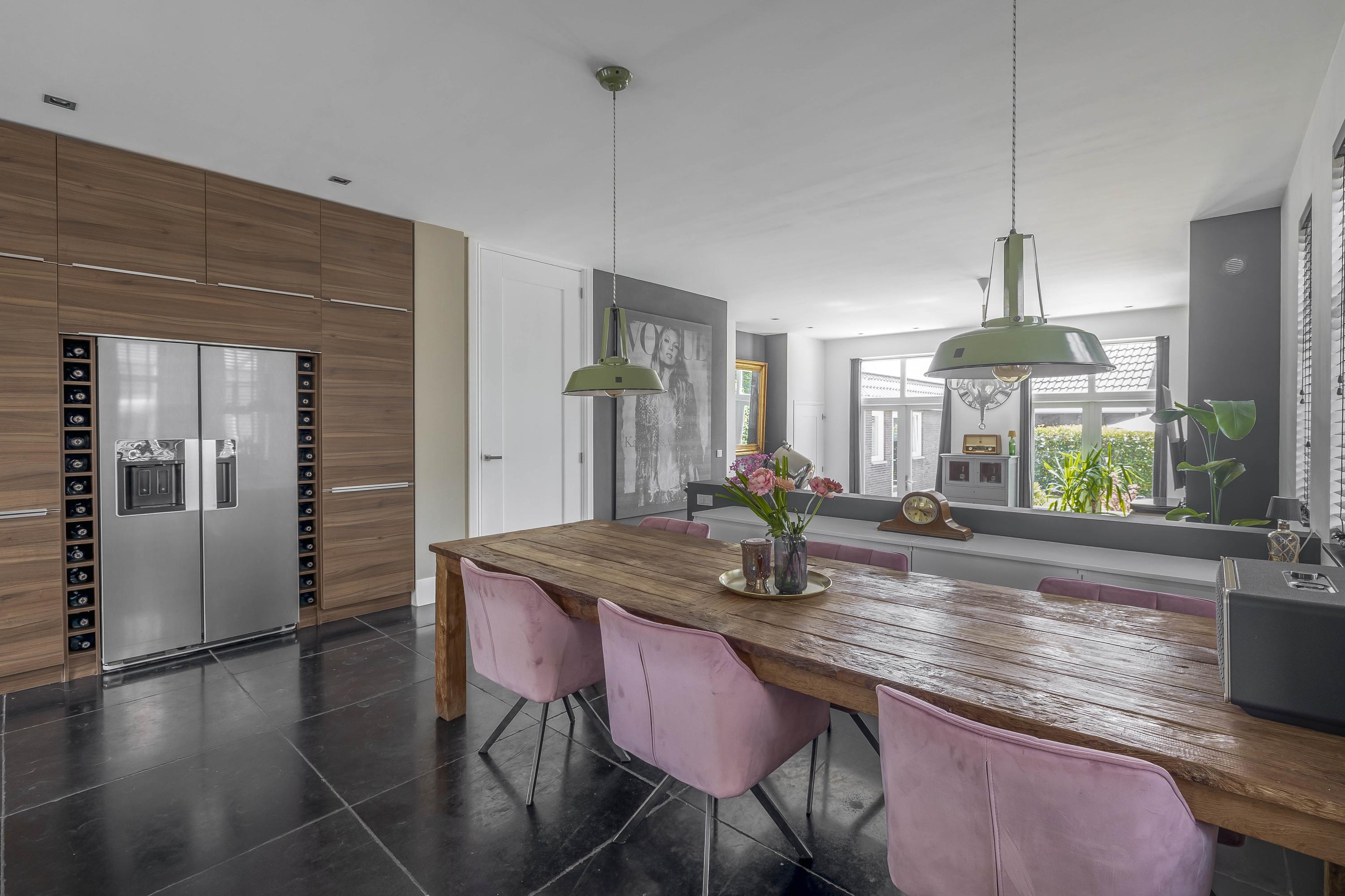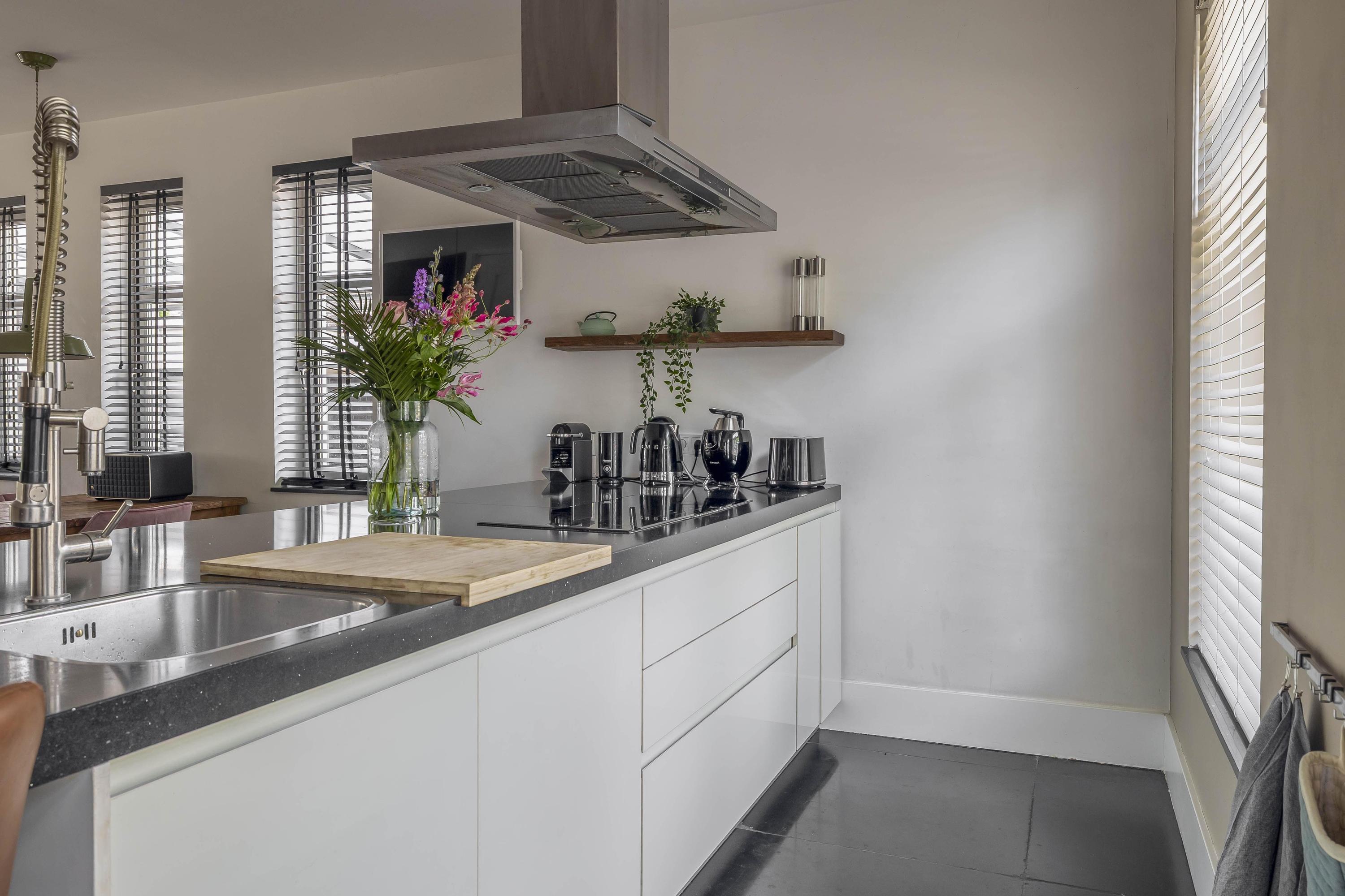 Via de ruime entree met fraaie tegelvloer, modern toilet en uitgebreide meterkast, kom je binnen in de leefkeuken aan de voorzijde van de woning. Deze stijlvolle en complete keuken is het hart van het huis en beschikt over een kookeiland, luxe apparatuur en veel werkruimte. Dankzij het verhoogde vloerniveau heb je een prachtig uitzicht over de straat.