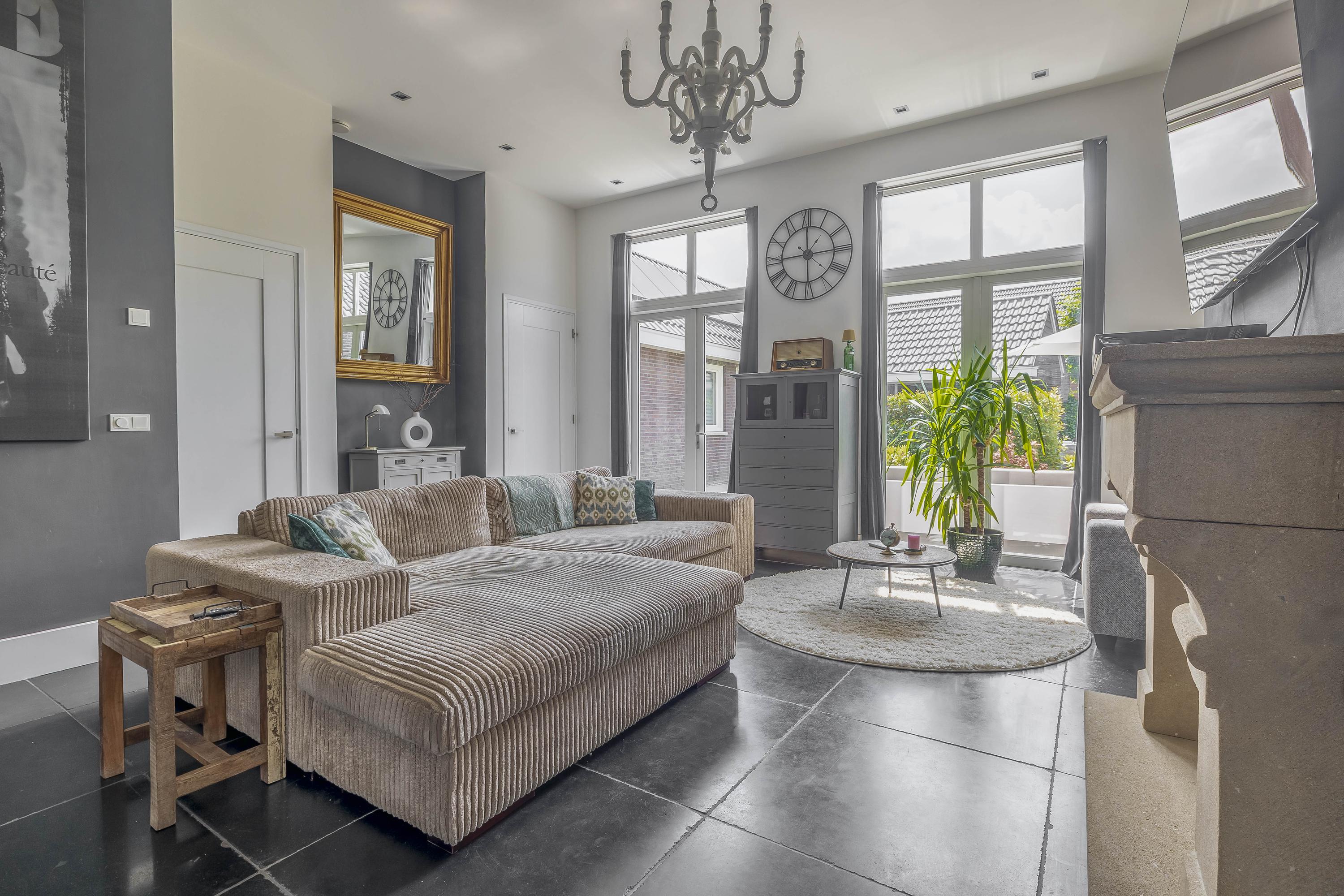 Een korte trap leidt naar de sfeervolle, royale woonkamer met indrukwekkende plafondhoogte van 3,5 meter. Grote ramen en dubbele tuindeuren zorgen hier voor een zee aan licht en directe verbinding met de tuin. Een zandstenen schouw met sierhaard maakt het plaatje compleet. Grenzend aan de woonkamer vind je een praktische speel- of werkkamer met ingebouwde kastenwand – ideaal voor kinderen of als thuiskantoor.