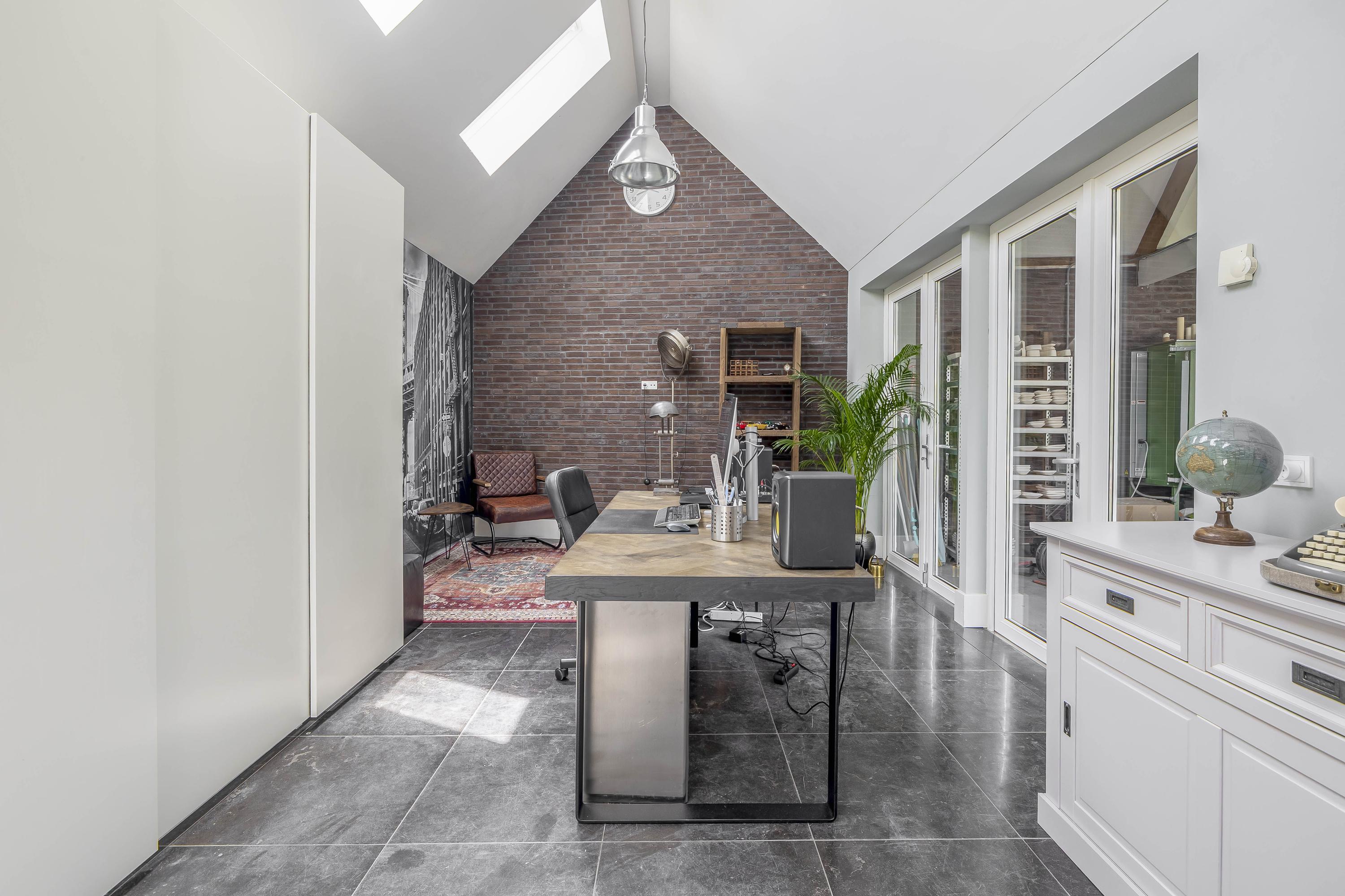 In het achterste gedeelte van het bijgebouw bevindt zich een sfeervolle kantoor- of tuinkamer. Dankzij de zichtbare nokconstructie en de vier Velux dakvensters heerst hier een heerlijk ruimtelijk en licht karakter. Dubbele openslaande deuren geven direct toegang tot de naastgelegen terrasoverkapping, wat deze ruimte ideaal maakt voor werk, ontspanning of hobby.