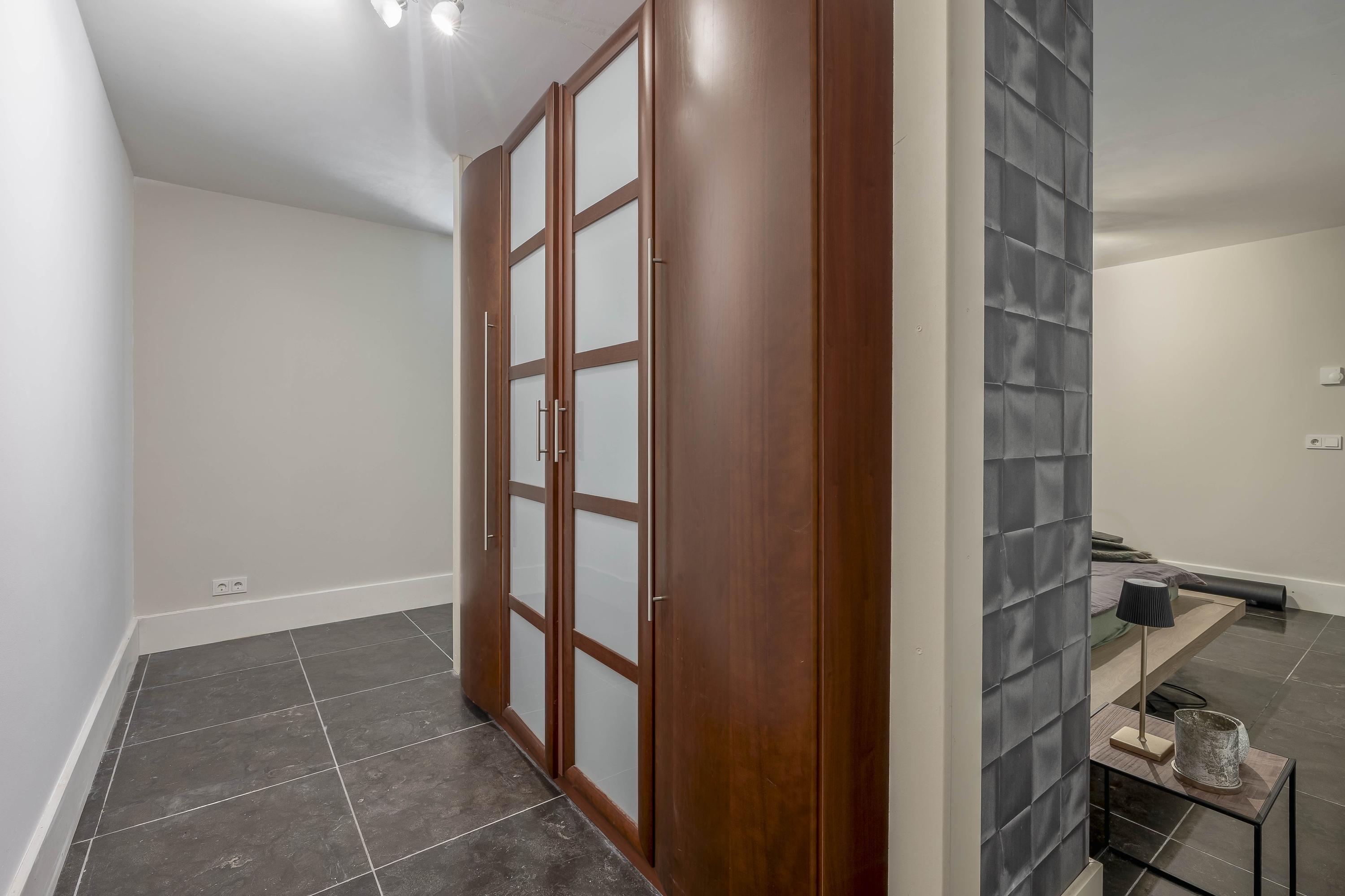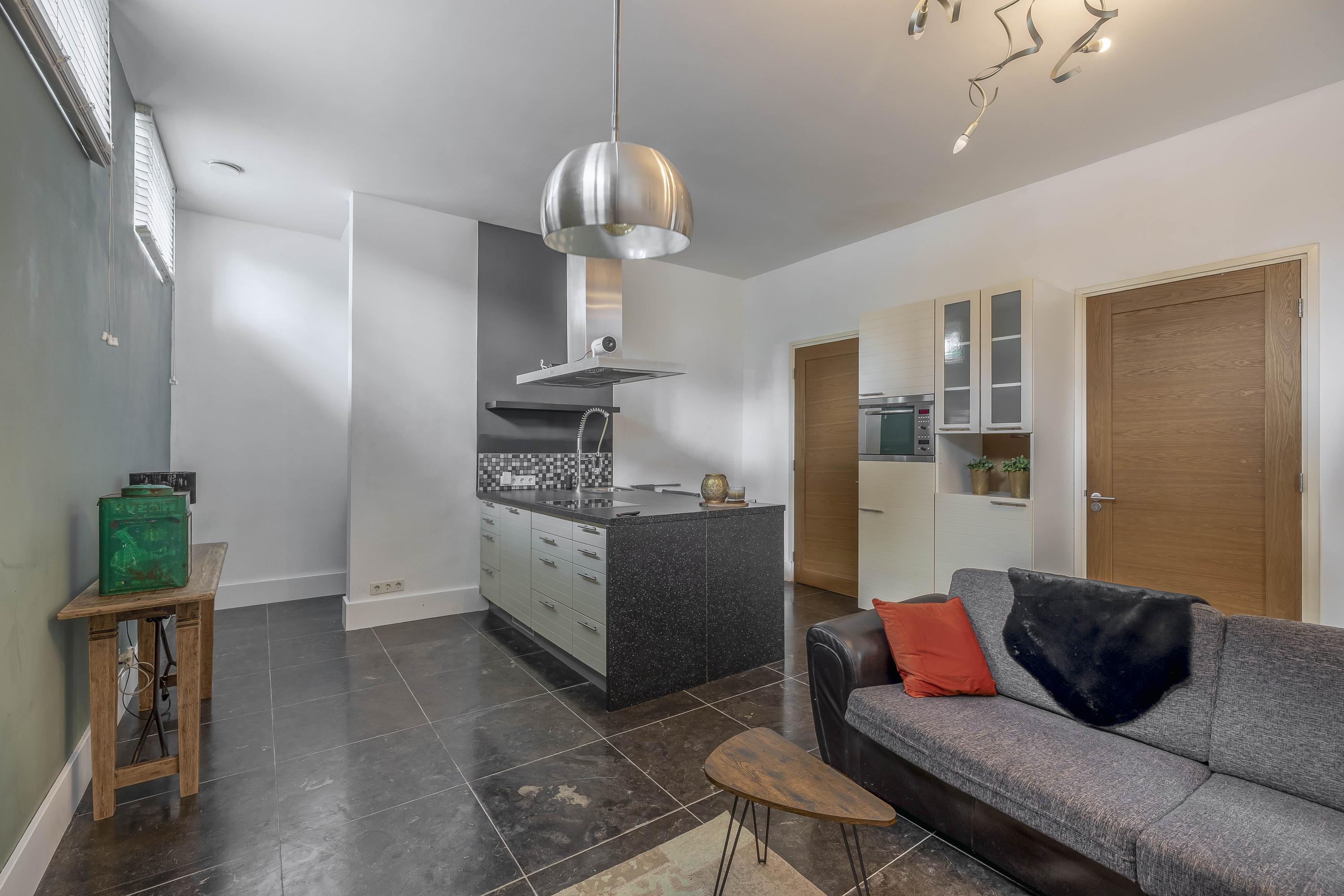 Je betreedt deze ruimte in een lichte woonkamer met open keuken, waar de indrukwekkende plafondhoogte van ruim 3 meter direct opvalt. De keuken is modern en compleet uitgerust met een inductiekookplaat, afzuigkap, vaatwasser, koelkast en combi-magnetron. In een handige nis achter de keuken bevindt zich de aansluiting voor de wasmachine.