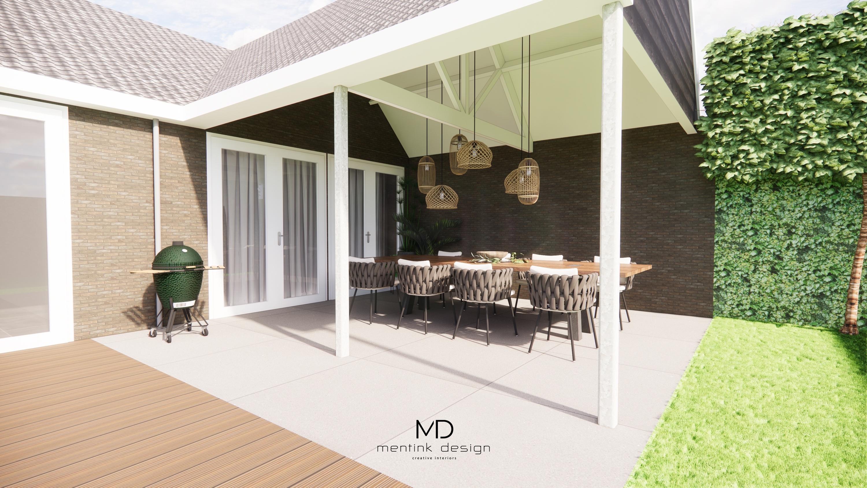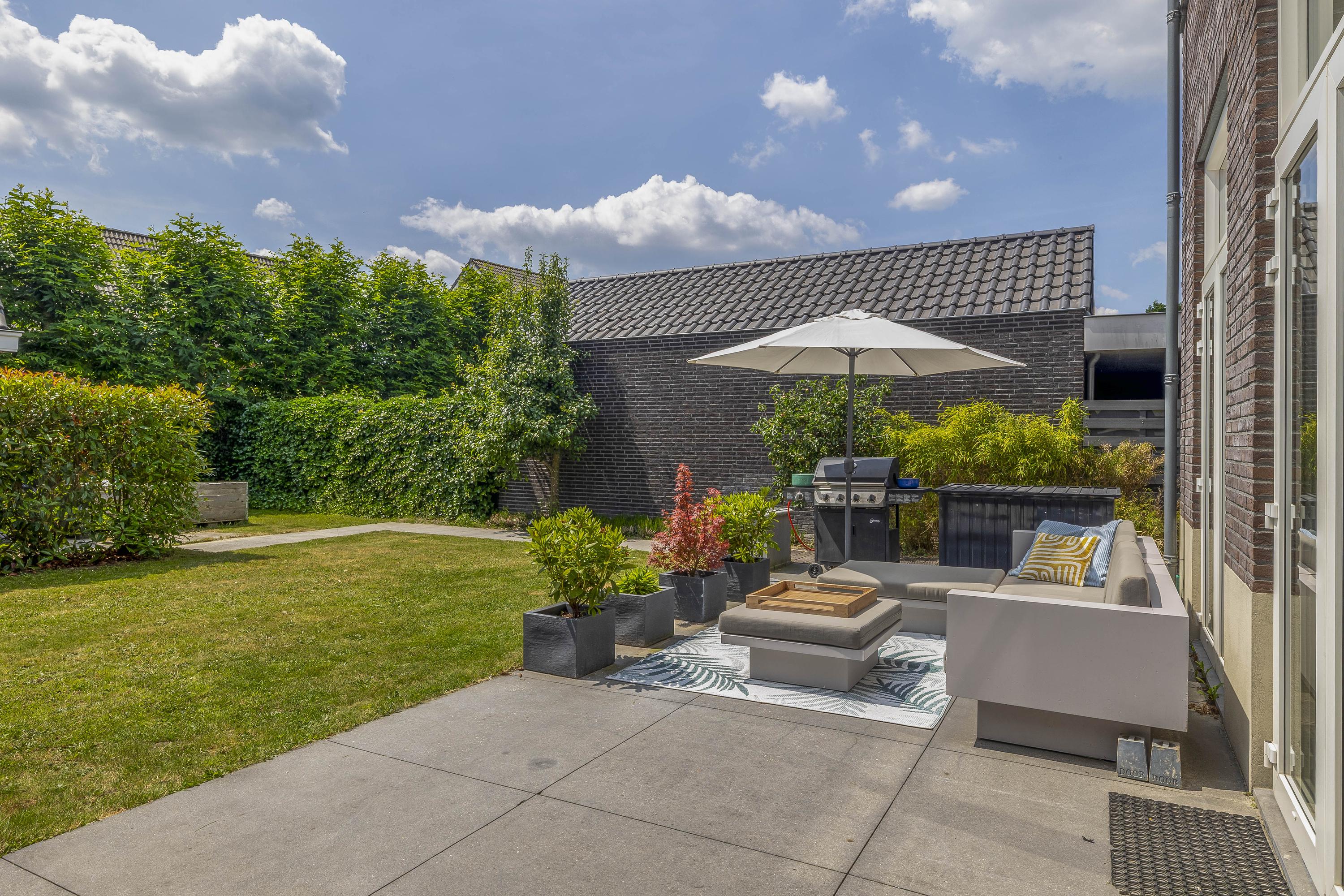 De zonnige achtertuin, gelegen op het zuiden, biedt volop privacy en is aangelegd met sierbestrating, gevarieerde beplanting en een verzorgd gazon. Direct grenzend aan het bijgebouw bevindt zich een royale terrasoverkapping met betonnen vloer – de ideale plek om tot in de avond van de zon te genieten. Hier is tevens alle ruimte om een sfeervolle buitenkeuken te realiseren.