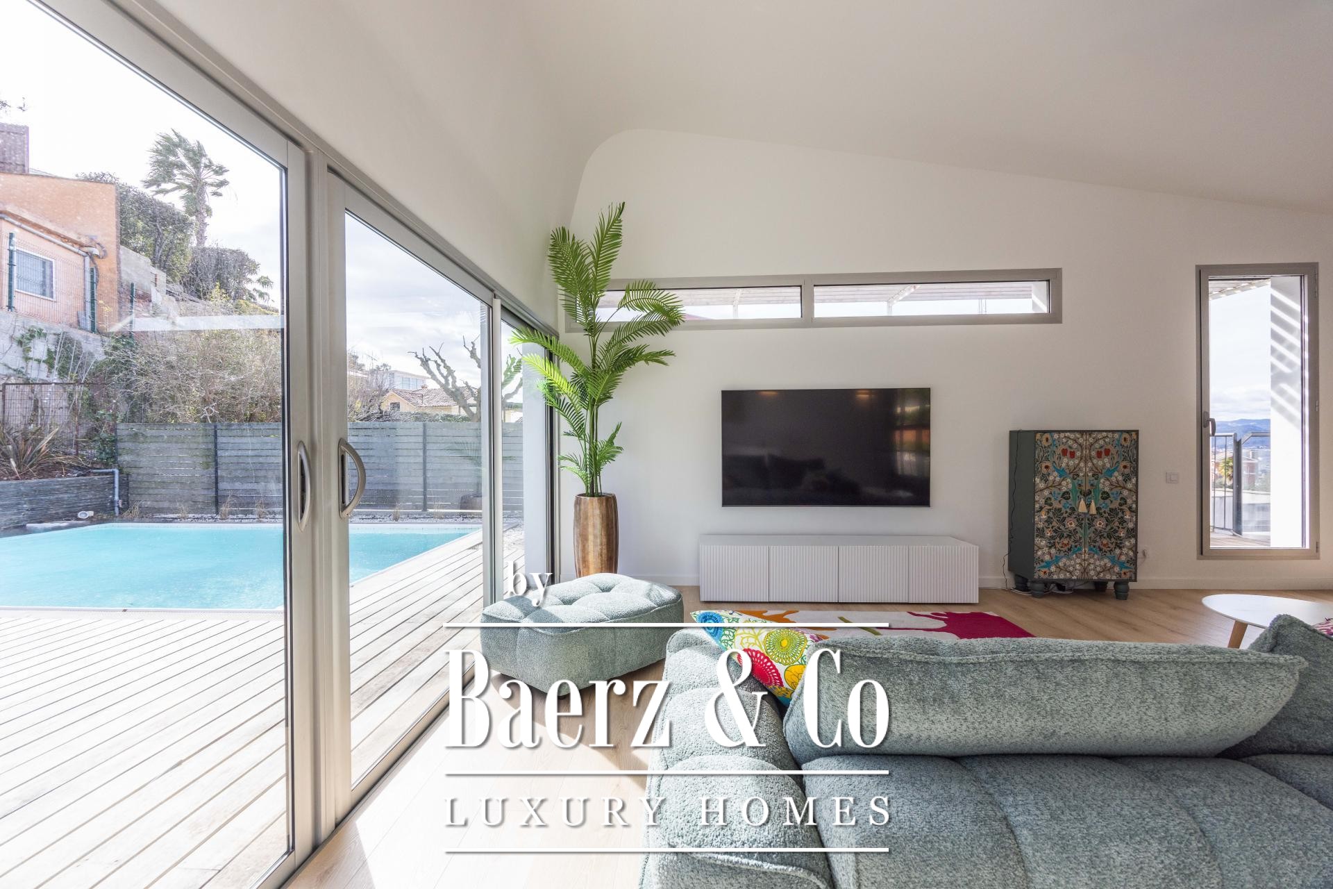 Vier aangelegde terrassen, omgeven door palmen en bananenbomen, vormen een oase in de open lucht. Het zwembad van 7 x 5 m, omringd door een zonnig houten terras, biedt volop privacy en ontspanning. De pergola en buitenkeuken staan in het teken van mediterraanse gastvrijheid. Zes slaapkamers zijn aanwezig, waaronder een master suite met inloopkast, eigen houten terras en een badkamer in spa-stijl die uitkijkt op rustige vergezichten, zoals een privé toevluchtsoord. Twee extra tweepersoonsslaapkamers delen een stijlvol afgewerkte badkamer. Op de bovenste verdieping bieden de kantoren inspirerende ruimtes met zicht op de stad.