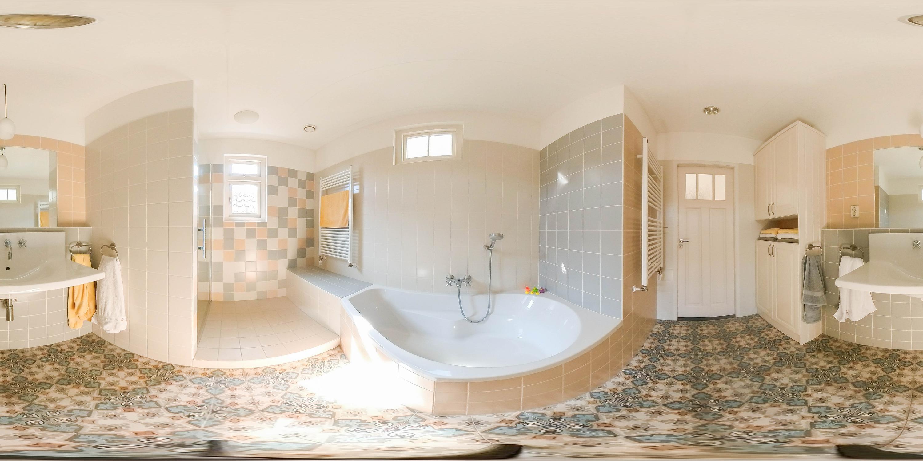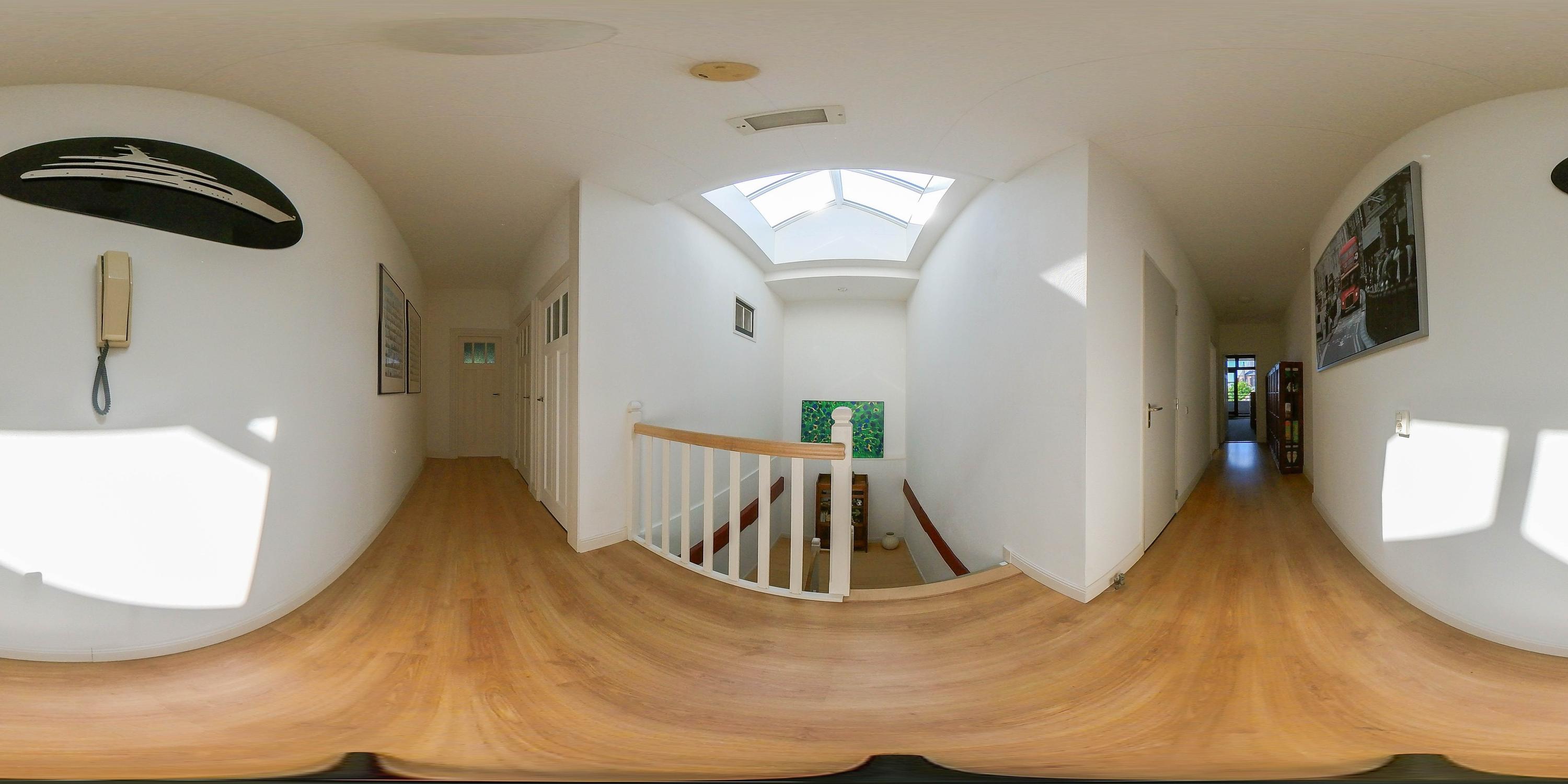 royale overloop met lichtstraat, laminaat, toiletruimte (met zwevend toilet en fonteintje), lichte badkamer met inloopdouche, ligbad, wastafel, ramen, geheel betegeld en designradiator