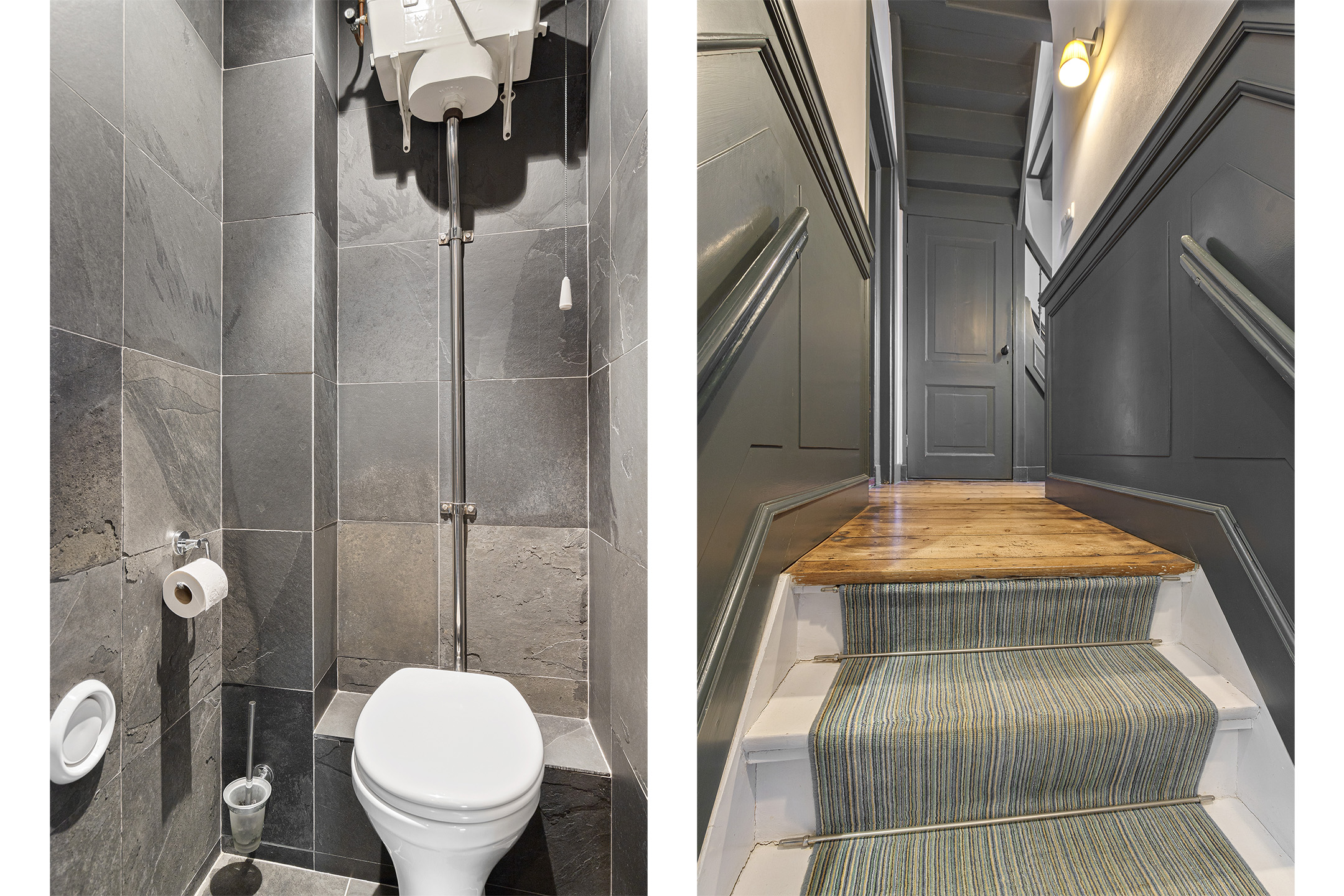 Naast de en-suite met openslaande deuren op de bel-etage, biedt de derde verdieping twee royale slaapkamers met een luxe badkamer. Deze verdieping ademt charme met zichtbare balken onder een prachtig nieuw afgetimmerd dak. Het souterrain biedt extra leefruimte met een knusse slaapkamer, een en-suite badkamer en een walk-in closet – ideaal voor gasten of een au pair.