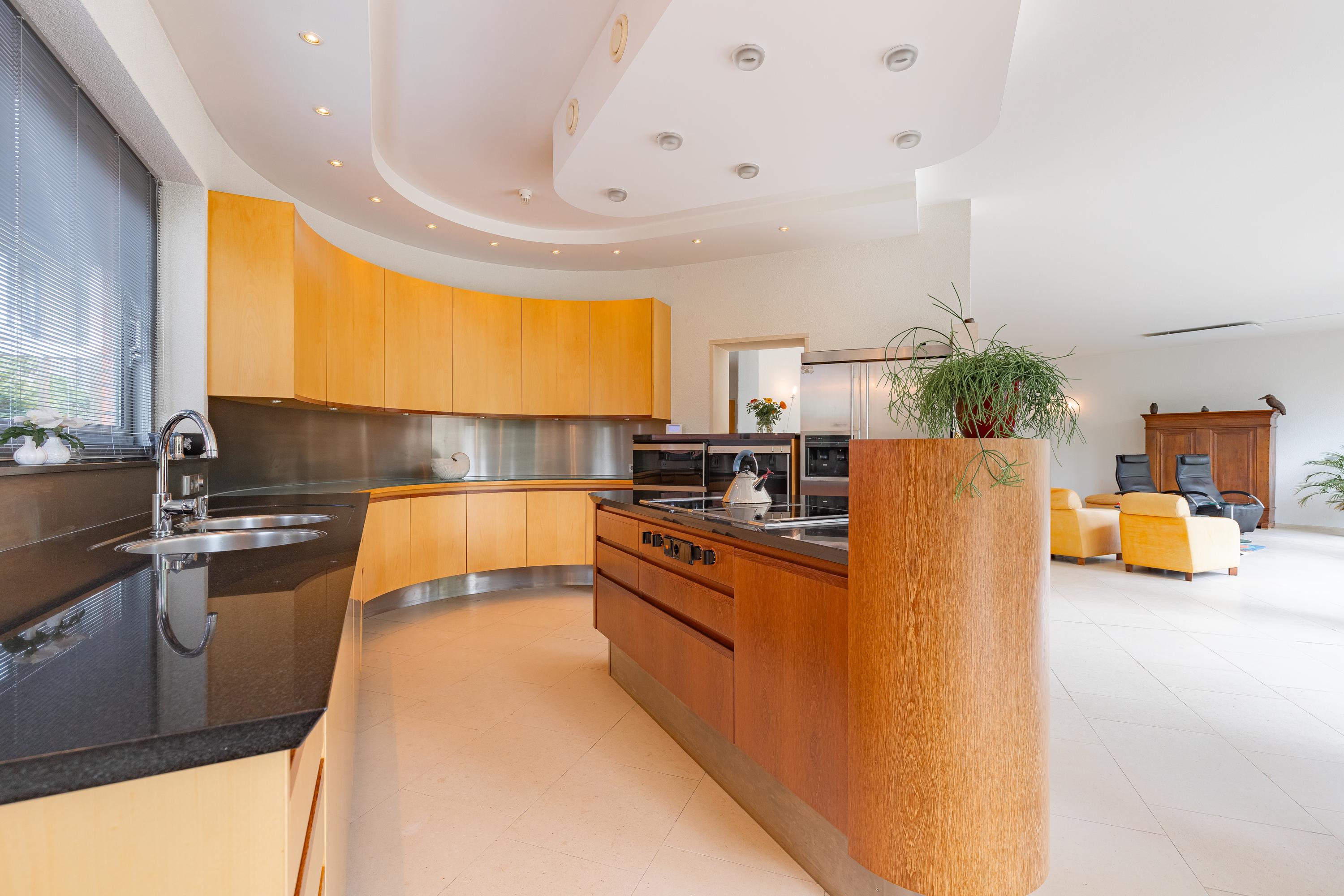 De semi open keuken is voorzien van een fraaie keukeninstallatie in ronde opstelling langs de wand en een centraal geplaatst kookeiland. Voorzien van zwarte granieten werkblad en van de navolgende inbouwapparatuur: heteluchtoven, keramische kookplaat met geïntegreerde dubbele afzuigkap, vaatwasser en een koel- vriescombinatie. De keuken is voorzien van sfeervolle inbouwverlichting in het plafond.