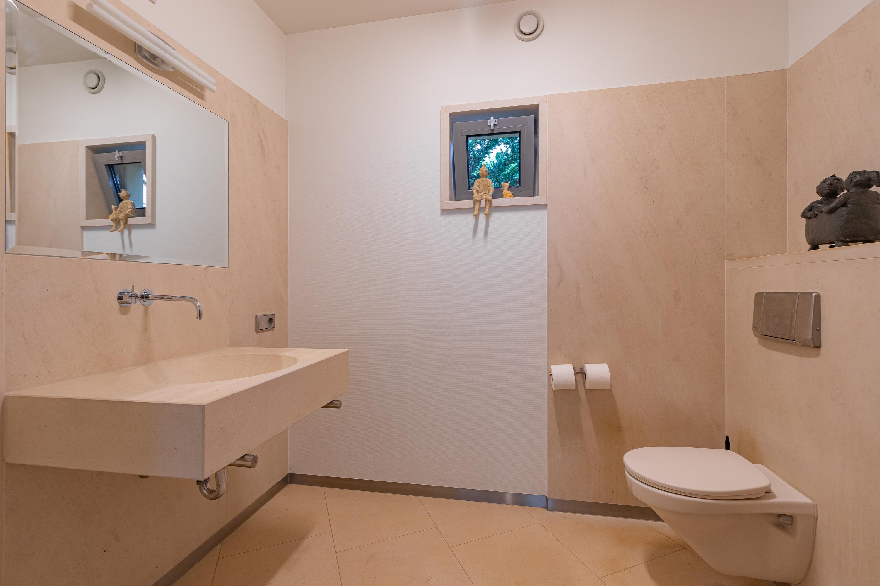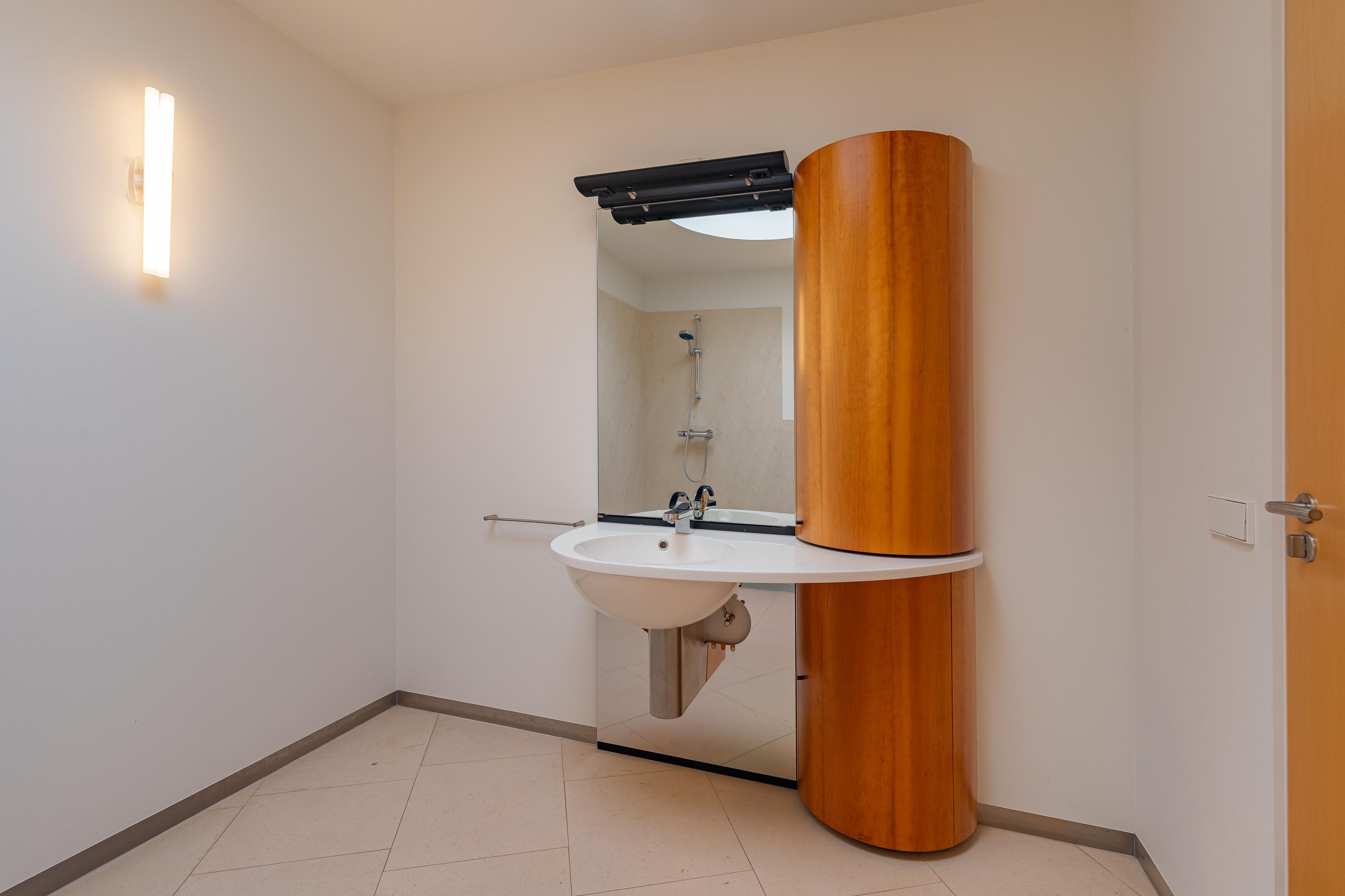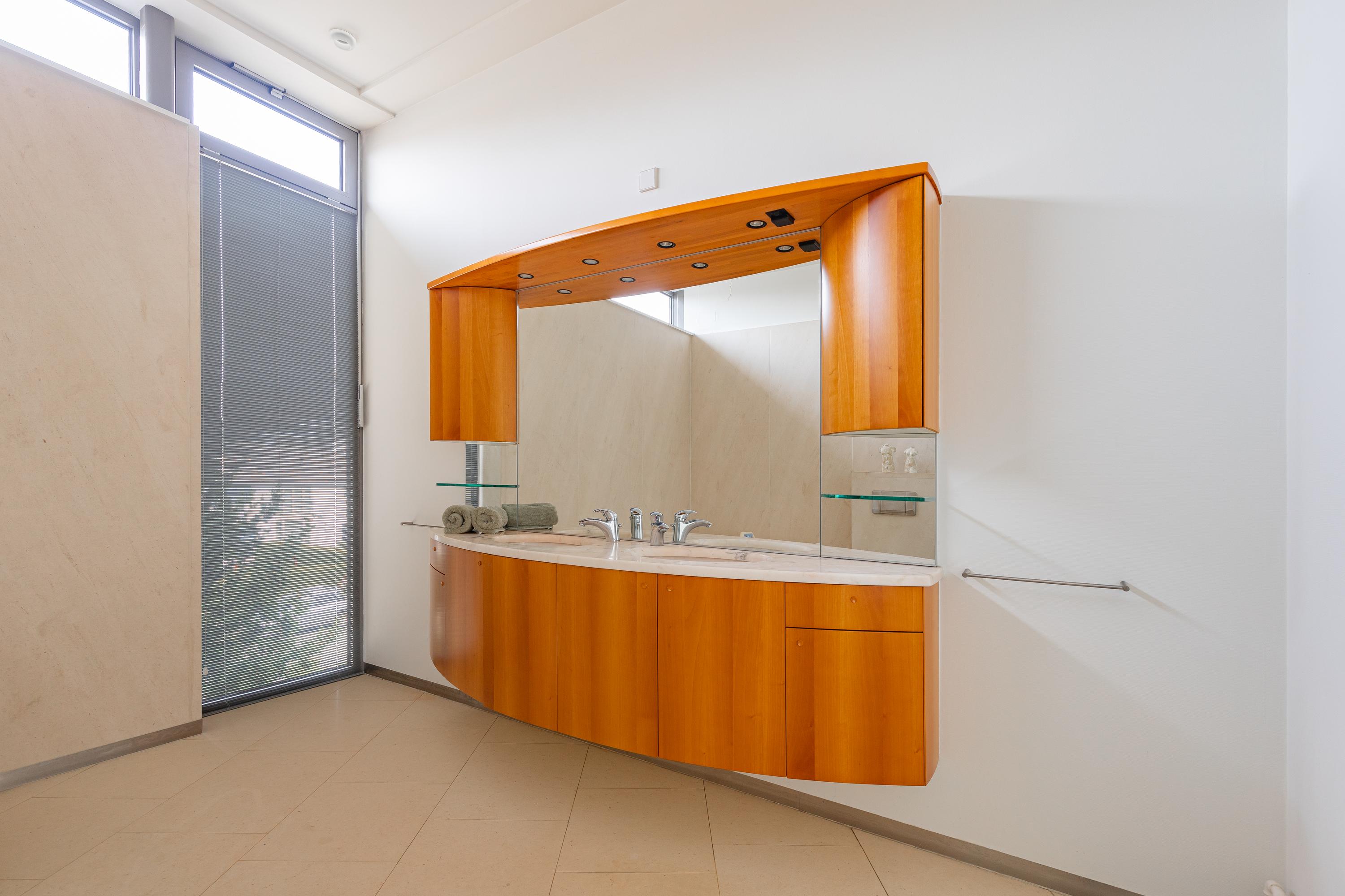 Royale overloop met optimale lichtinval door de centrale lichtkoepel. Vanuit de overloop toegang tot de drie zeer royale slaapkamers en fraaie badkamer voorzien van inloopdouche, badkamermeubel en zwevend toilet. De badkamer is voorzien van een daglichtkoepel. De vloer- en wandafwerkingen zijn uitgevoerd in een lichte kleur van Portugese leisteen. De hoofdslaapkamer, met grote aluminium schuifpui naar het zonnig gelegen terras, biedt veel ruimte voor zowel garderobe als slaapruimte. Direct grenzend aan deze kamer bevindt zich de hoofdbadkamer. Bereikbaar via hardglazen deur met jacuzzi hoekbad, douche-/ stoomcabine, zwevend toilet en badkamermeubel met twee wastafels.