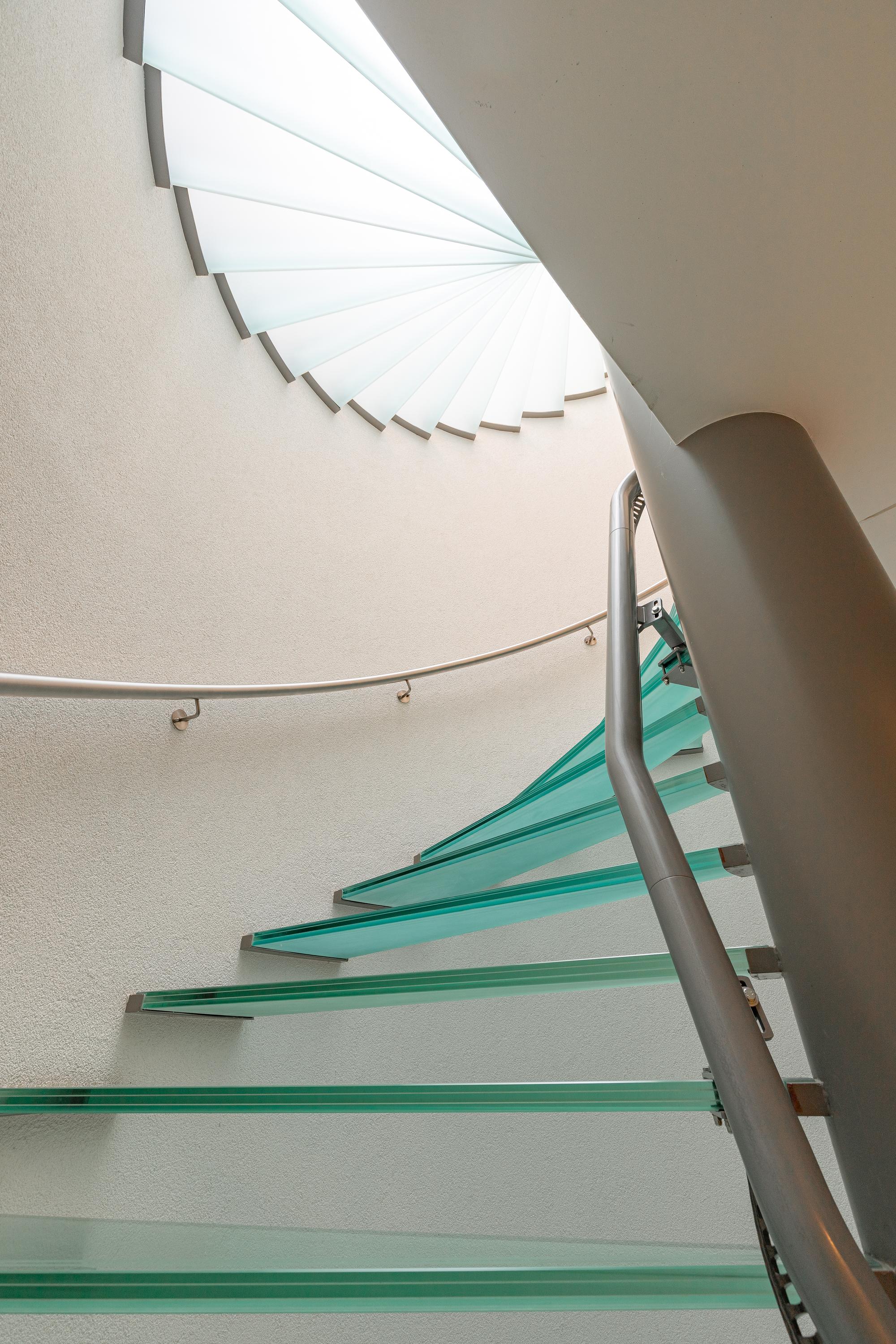 Het imposante trappenhuis is in een ronde vorm gebouwd en loopt vanuit het souterrain tot de overloop op de eerste verdieping. De stalen koker centraal dient als waskoker en voor de bevestiging van de hardglazen traptreden.