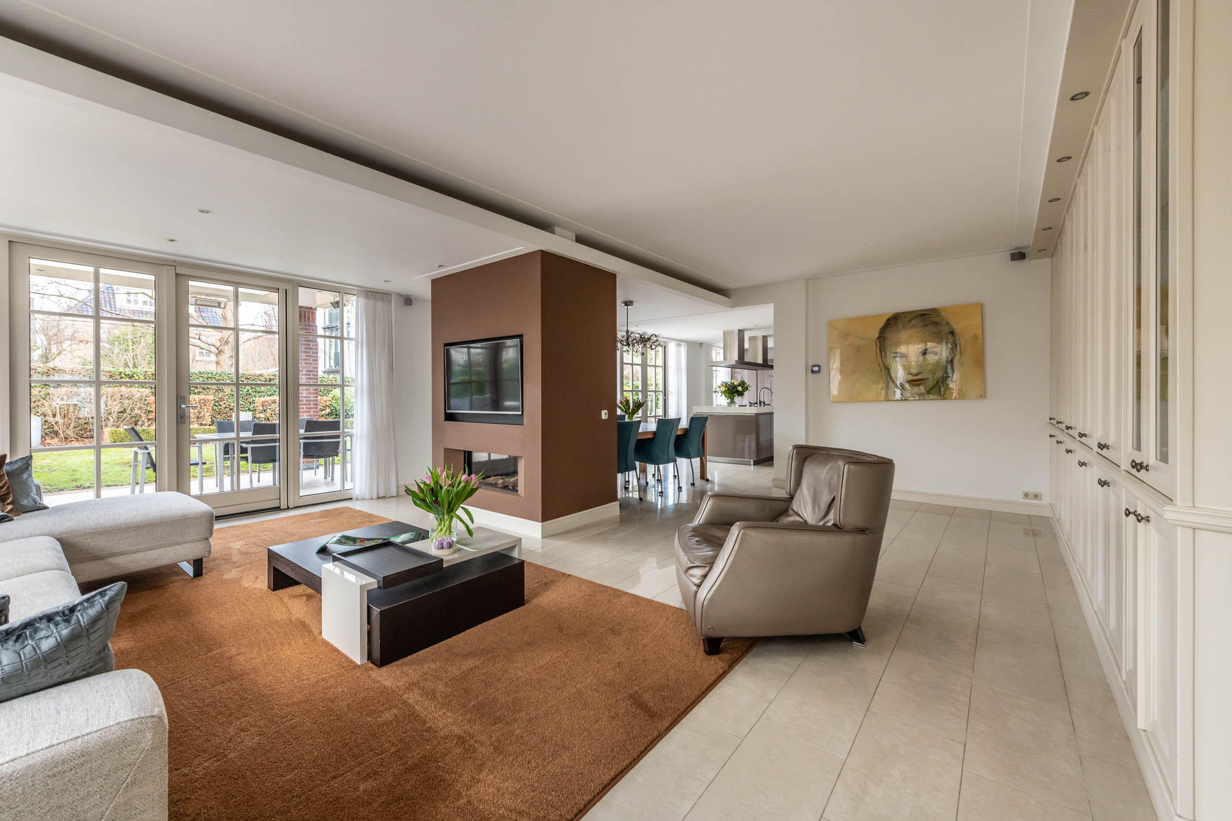 Begane grond: Entree, grote L-vormige hal met garderobekast en wc. Vanuit de hal is toegang tot de garage aan de rechterzijde en toegang tot de woonkamer aan de linkerzijde. Aan de voorzijde van het huis is de eetkamer en een kantoorruimte. Via de schuifdeuren van de eetkamer bereik je de achterzijde met een sfeervolle zitkamer met (gas-) open haard, een brede kastenwand en dubbele openslaande deuren naar de achtertuin. De royale moderne SieMatic woonkeuken staat in open verbinding met de zitkamer en heeft een groot kookeiland met o.a. een ingebouwde teppanyaki plaat en een inductie-wok. Er is een wand met diverse moderne keukenapparatuur. In de bijkeuken, bereikbaar via de garage en de keuken, is de wasmachine aansluiting en een keukenblok met spoelbak. De dubbele openslaande deuren geven toegang tot de prachtige, brede tuin met een -deels- overdekt terras, meerdere zitmogelijkheden en een stijlvol tuinhuis..