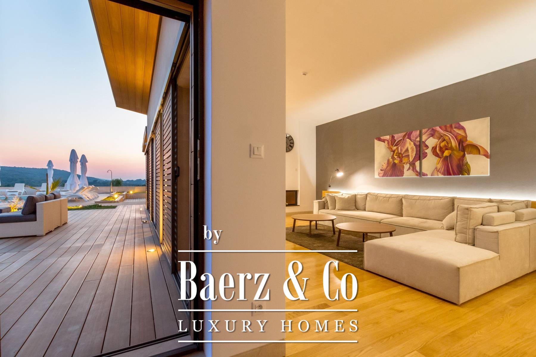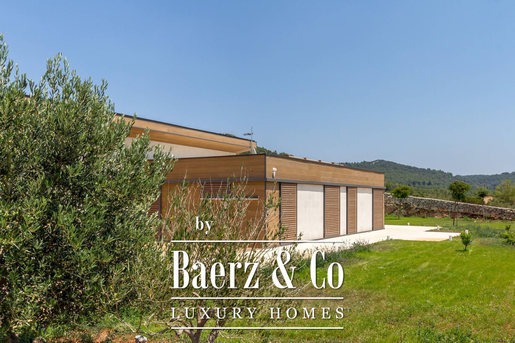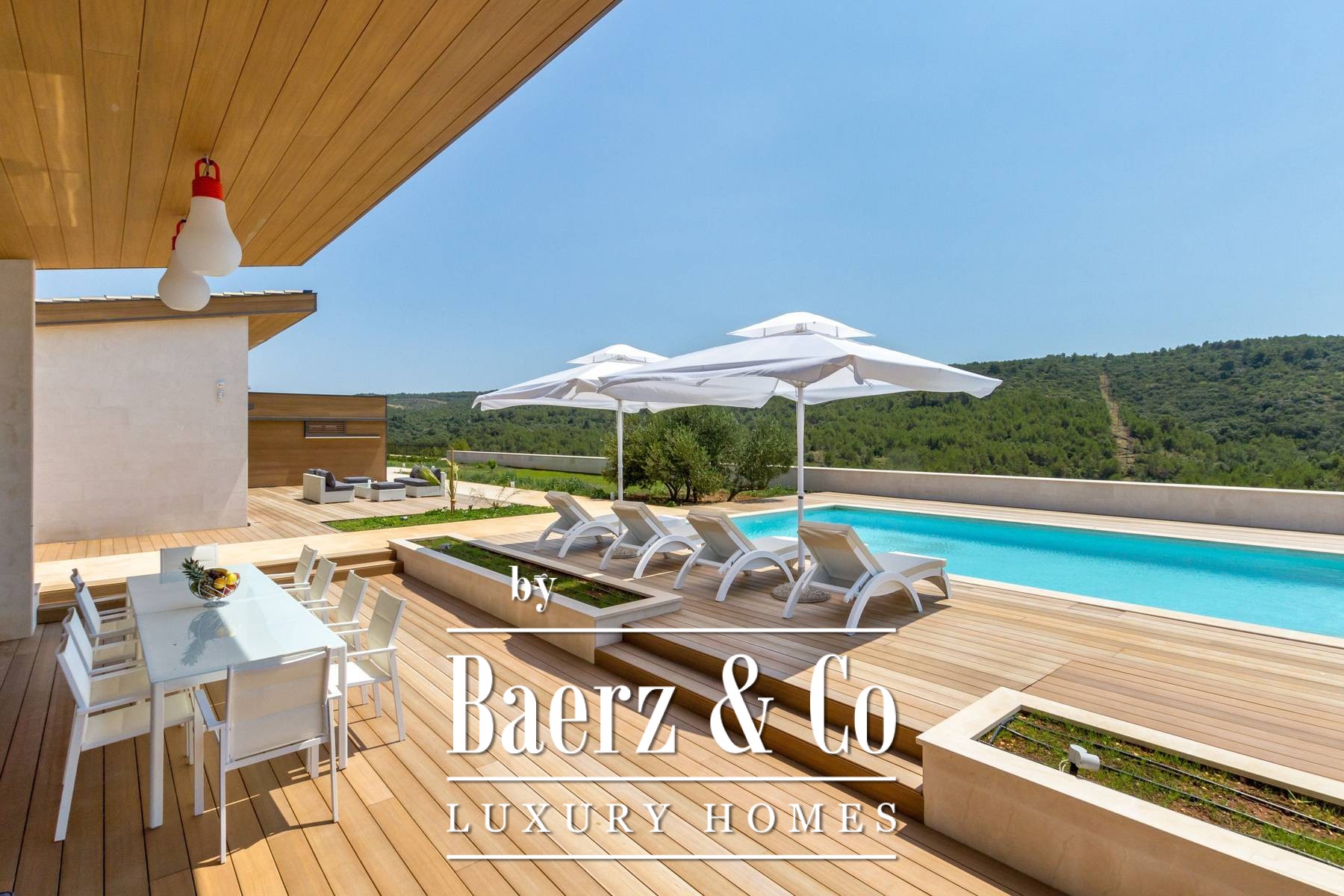 This amazing villa was built in 2014 and is located in a secluded location in the village of Zastražišće on the island of Hvar. It is positioned on a plot of 33,409 m2, while the total land area is 148,083 m2. In addition to complete peace, a view of the sea and untouched nature, it also offers an outdoor pool, tennis court, barbecue, hot tub, wine cellar, sauna and gym - in short, everything you could want for complete rest and enjoyment.The ground floor of the building consists of a living room, a kitchen with a dining room,