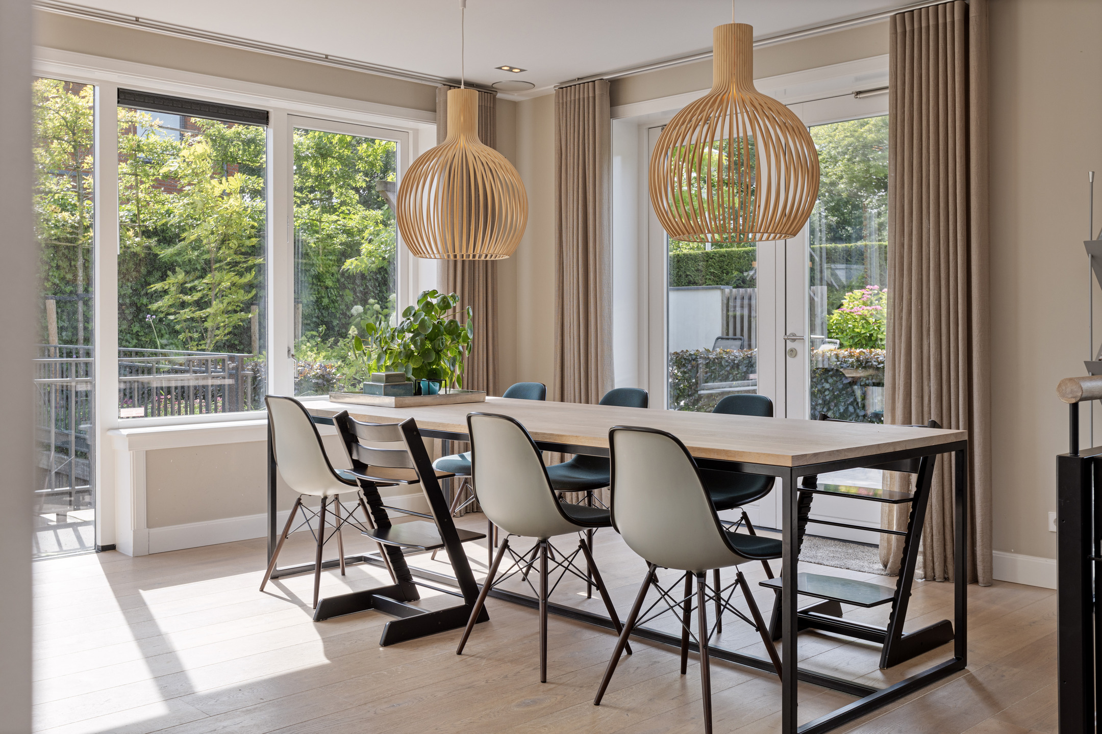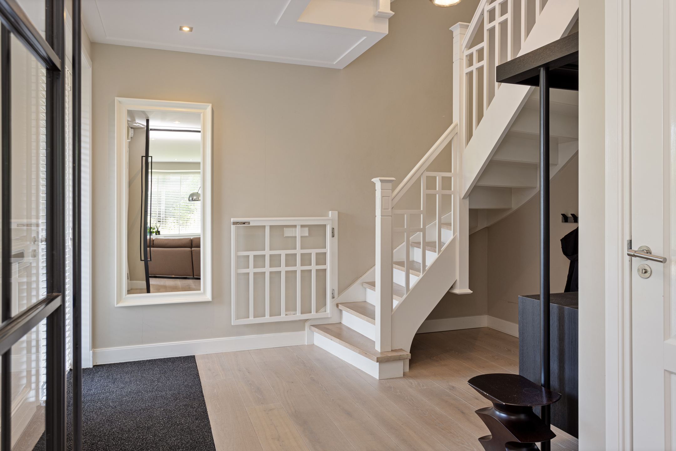 Bij binnenkomst is er een royale lichte entree met fraai trappenhuis en toiletruimte. Via de stalen deur komen we in de royale, zeer lichte woonkamer met werkhoek en openslaande deuren naar de fraaie tuin. Aan de achterzijde van de woning is een grote moderne woonkeuken met kook/spoeleiland en eetbar; genoeg ruimte voor gezellige diners met vrienden en familie. Ook hier zorgen grote ramen voor een overvloed aan licht. Een bijkeuken ontbreekt natuurlijk niet, hier staat ook de wasapparatuur.