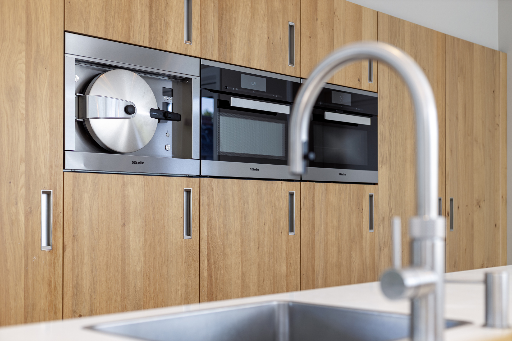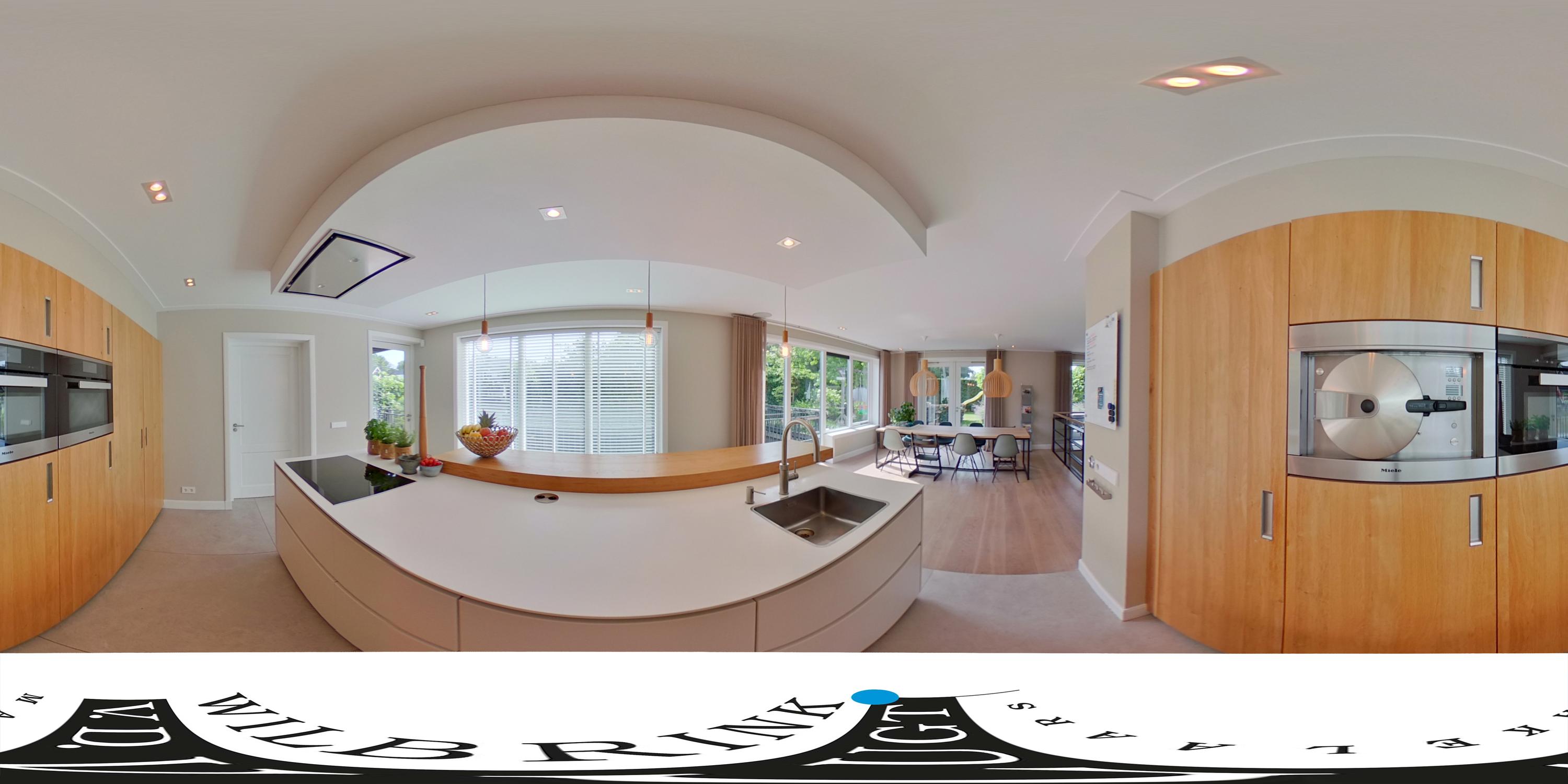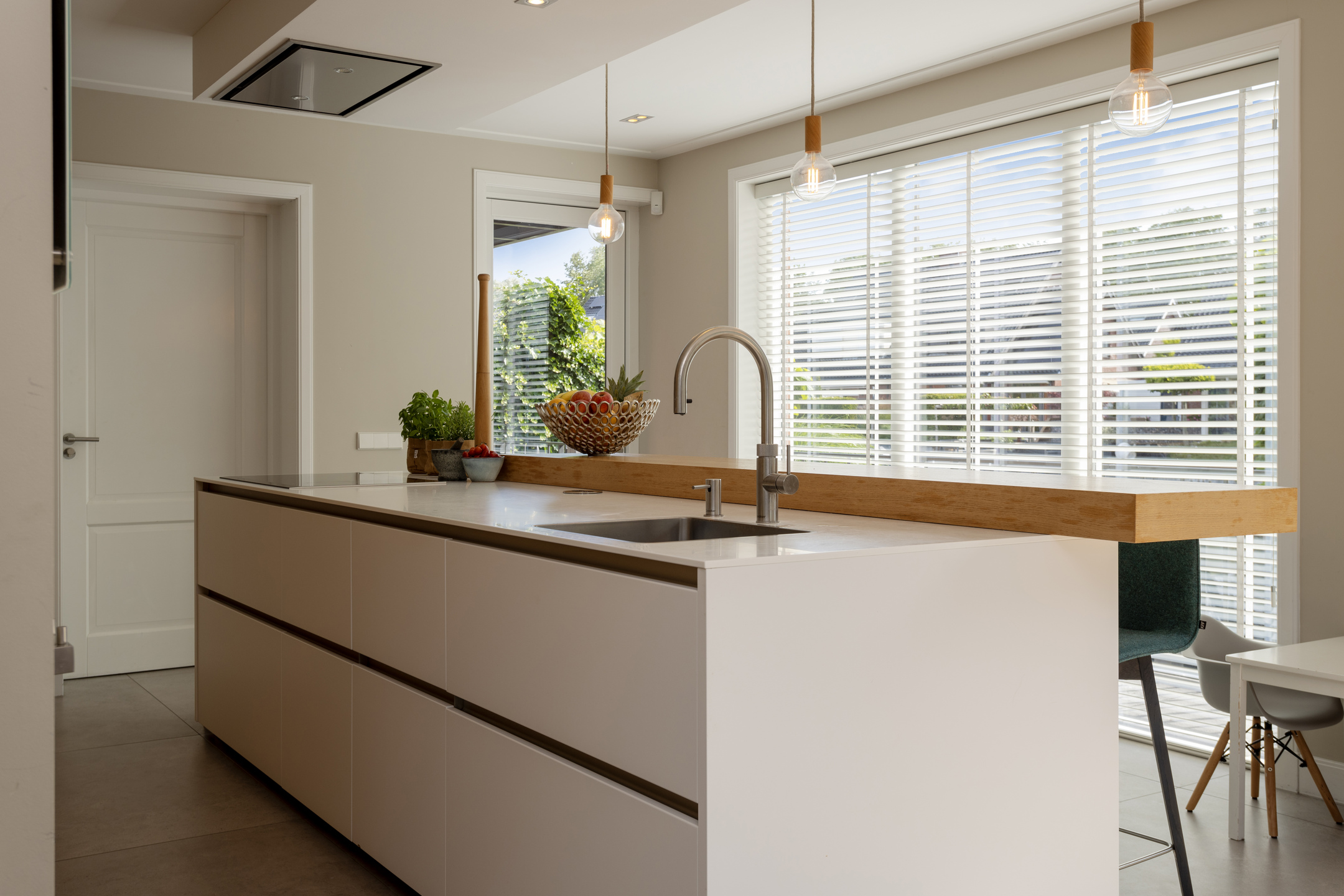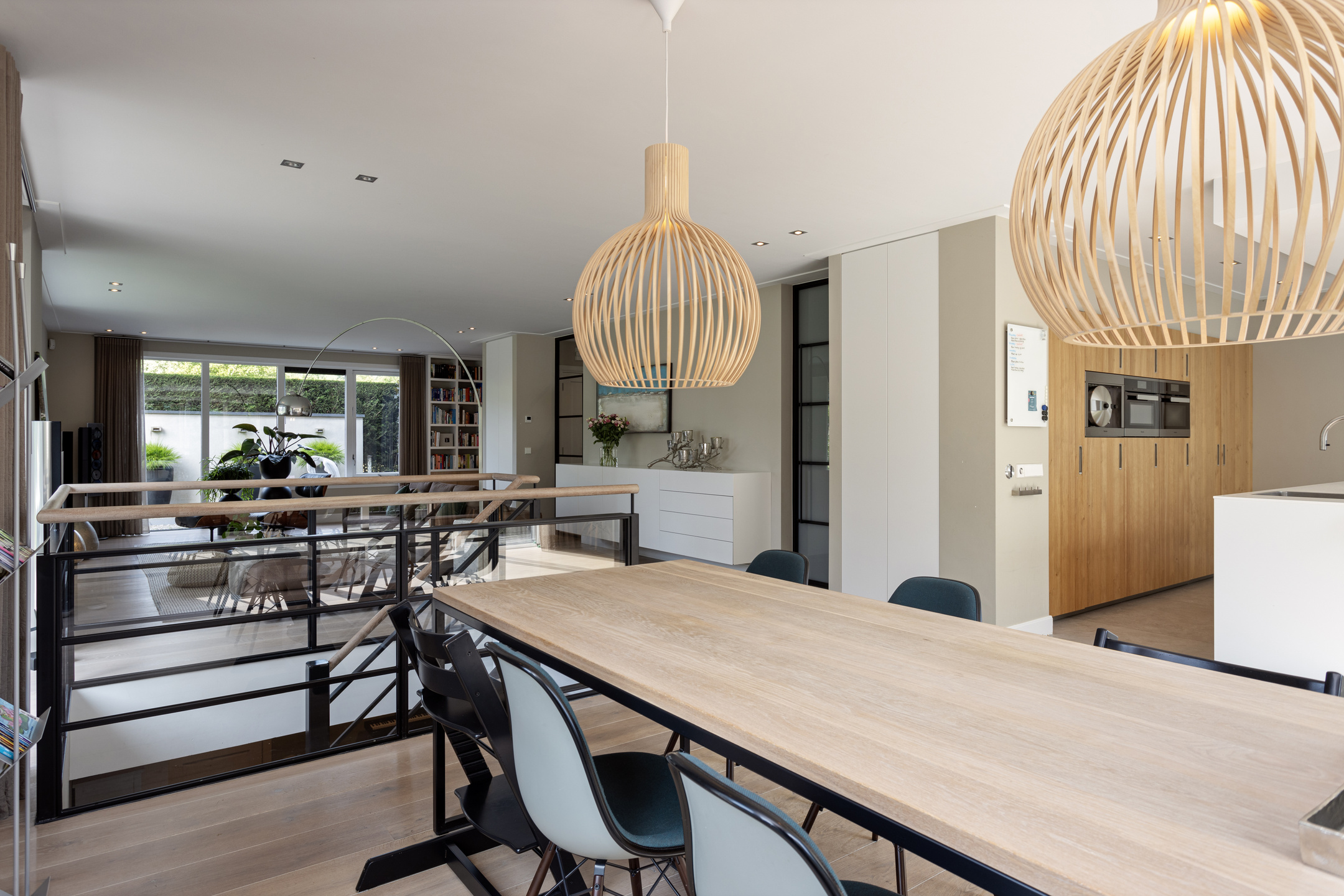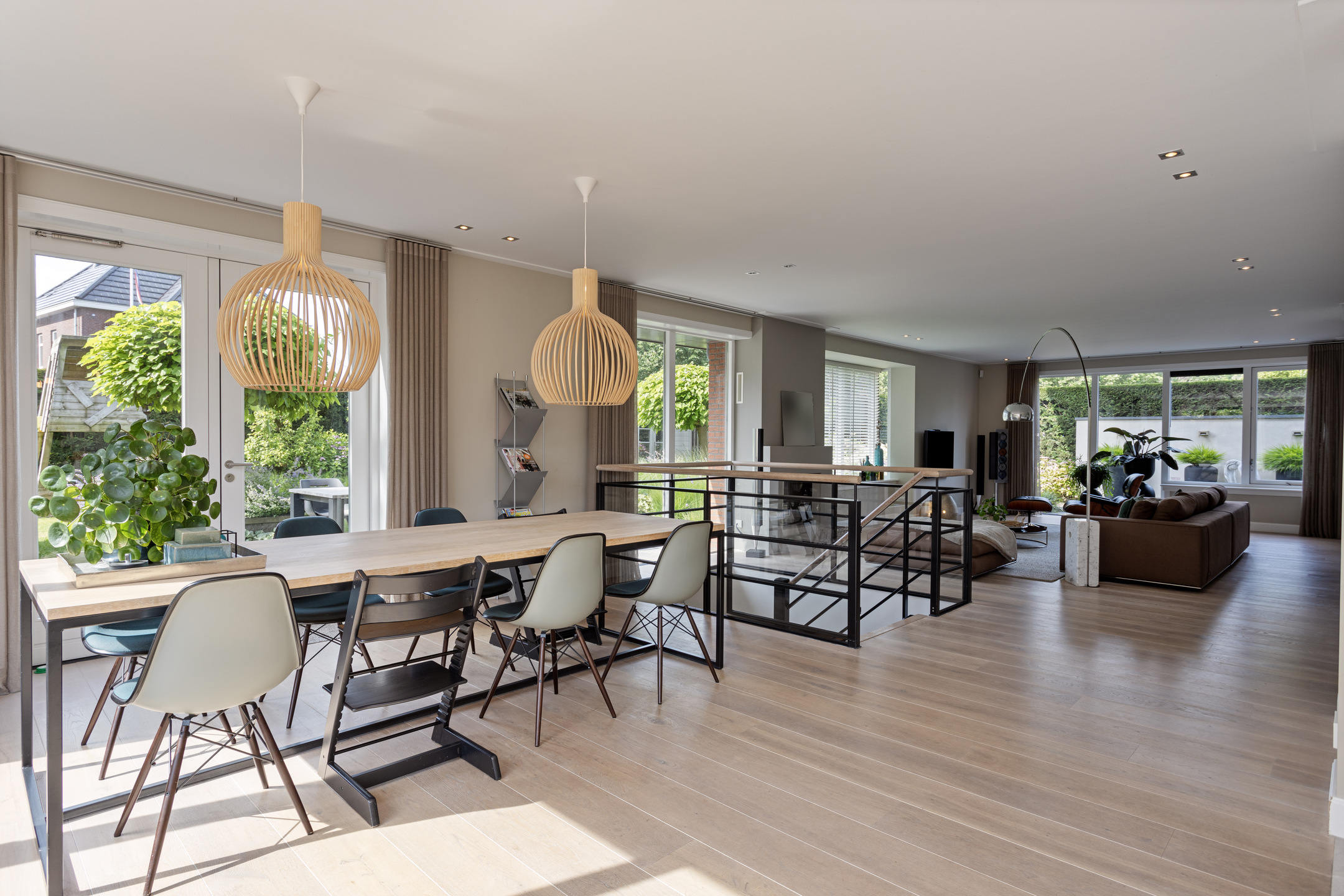 De woonkamer heeft een eikenhouten vloer met white wash finish en in de keuken ligt een lichte tegelvloer.