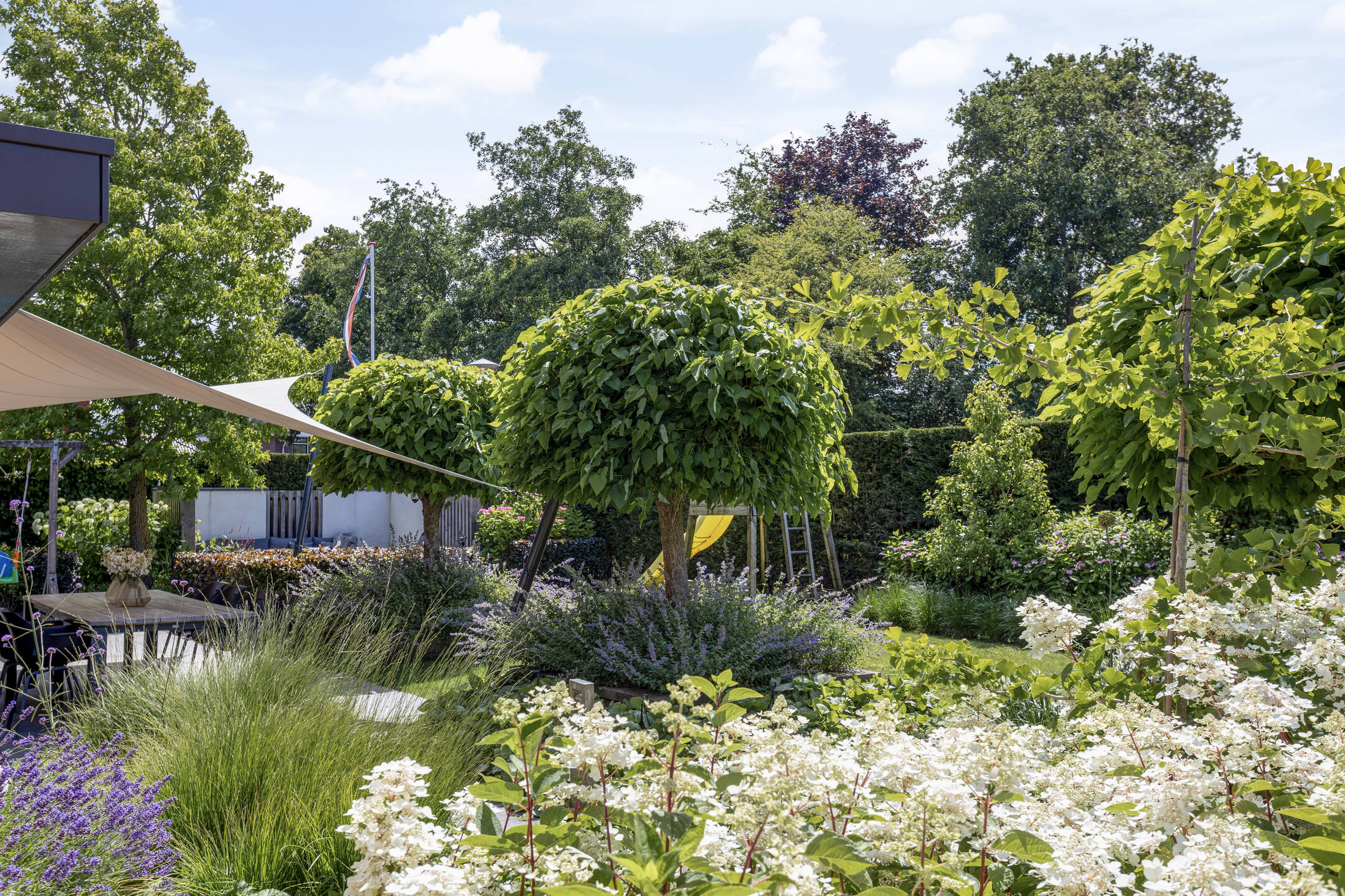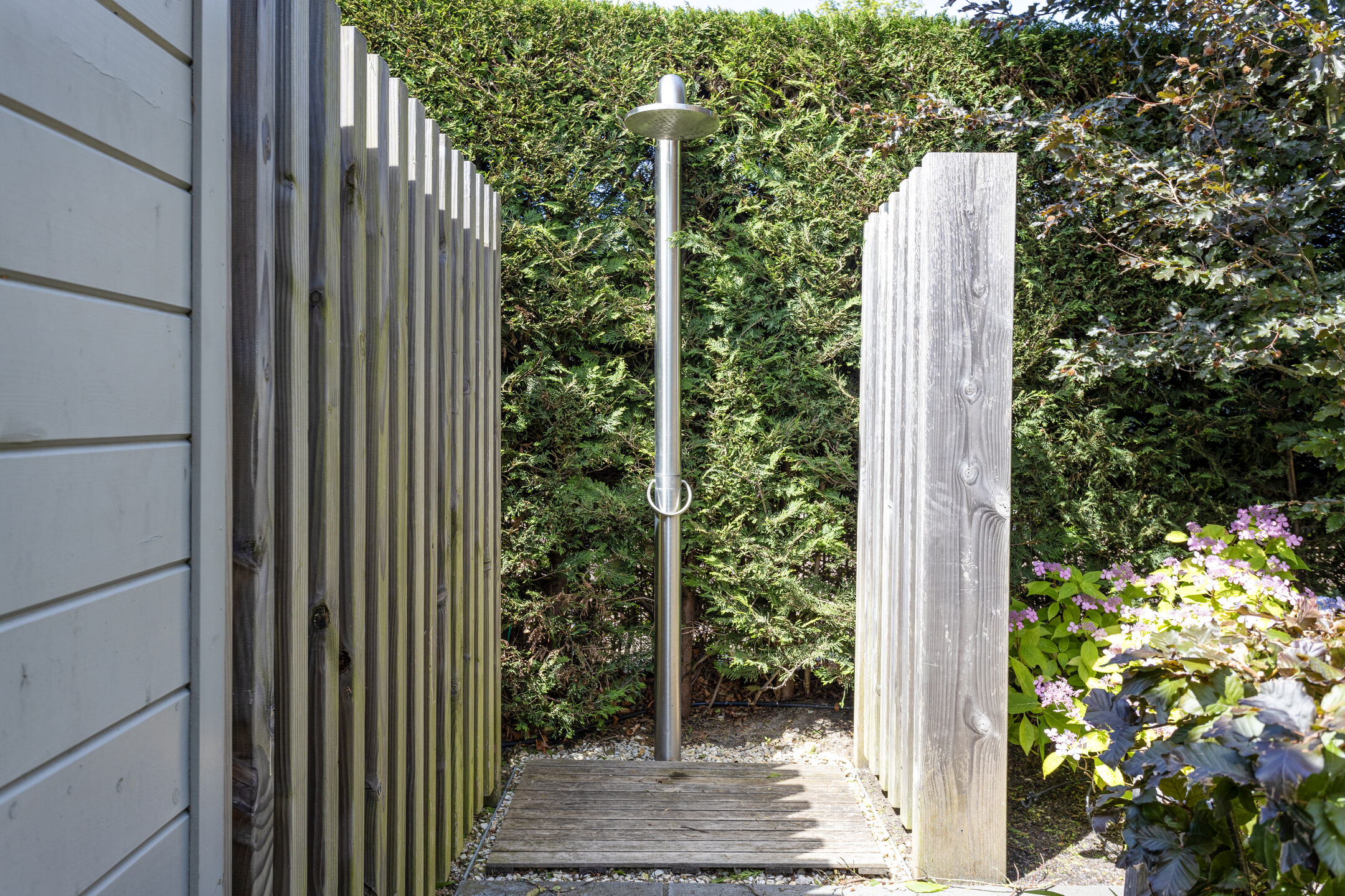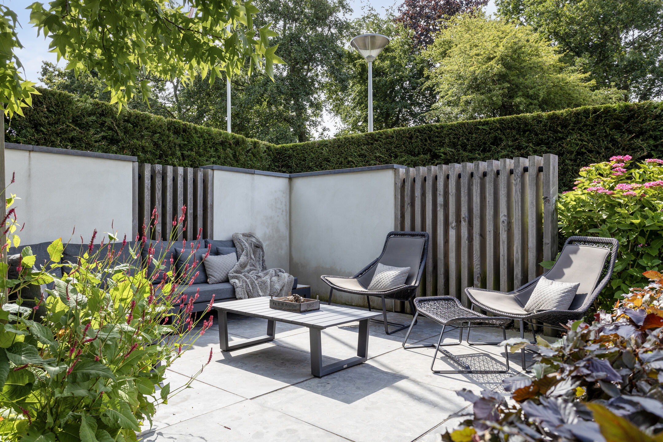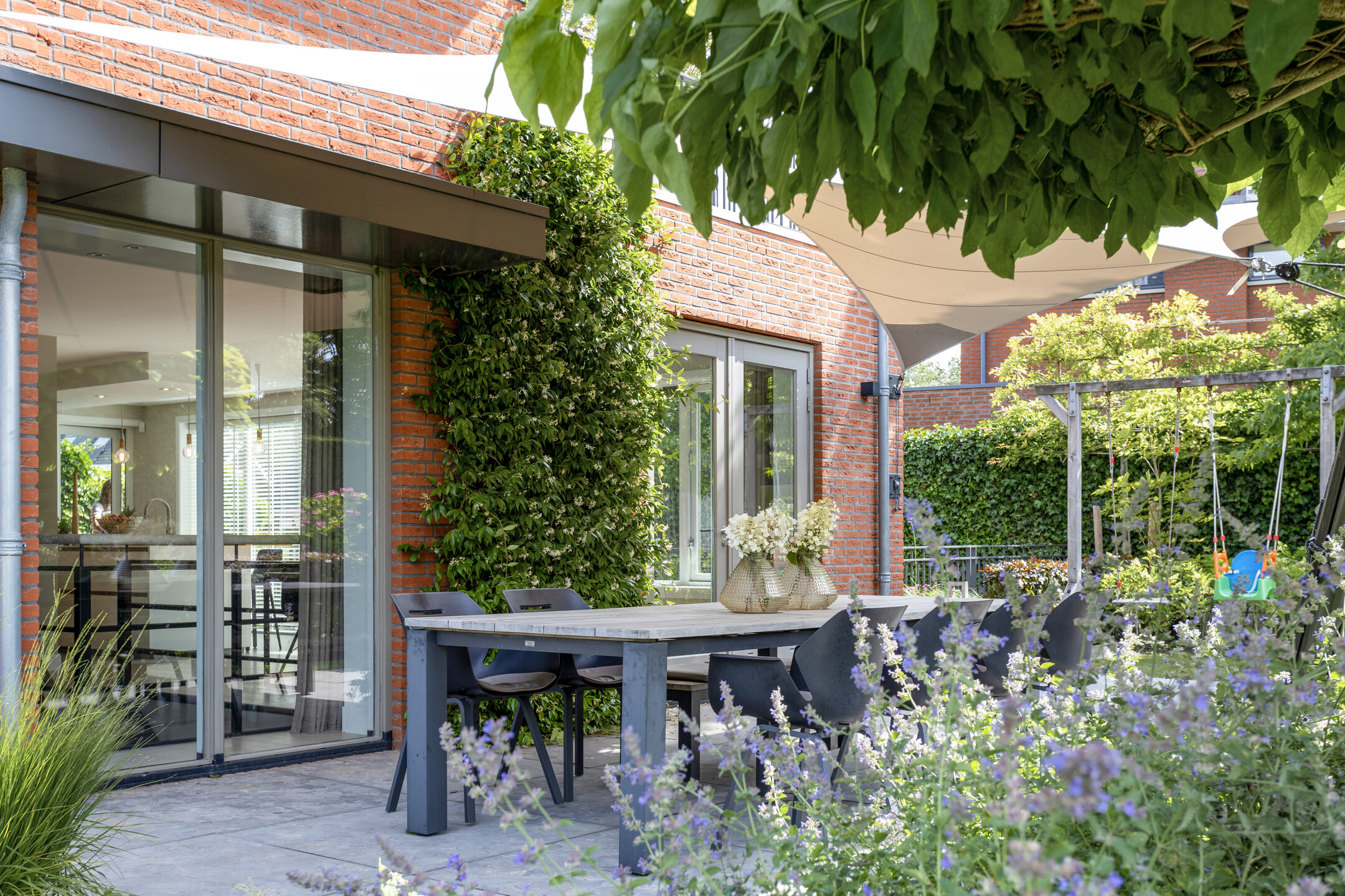 De fraai aangelegde tuin heeft diverse terrassen, gras, plantenbakken, bloemborders, hagen en een buitendouche. Het ruime terras aan de woonkamer (Z) is voorzien van een groot zonnedoek. De tuin is omringd door een prachtige groene haag en af te sluiten met een elektrisch bedienbaar sierhek, wat niet allen voor privacy zorgt maar ook voor extra veiligheid.