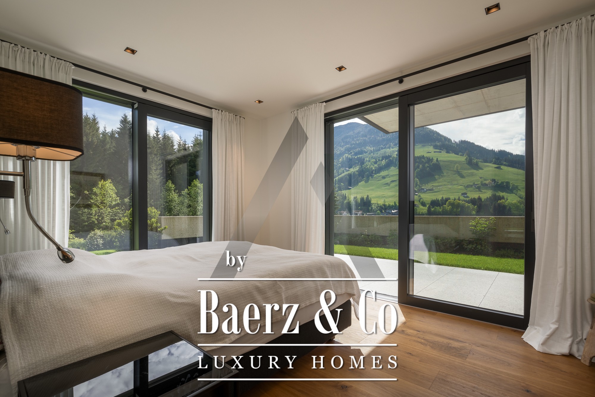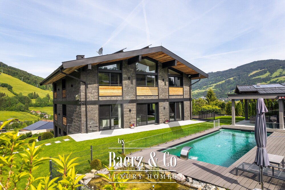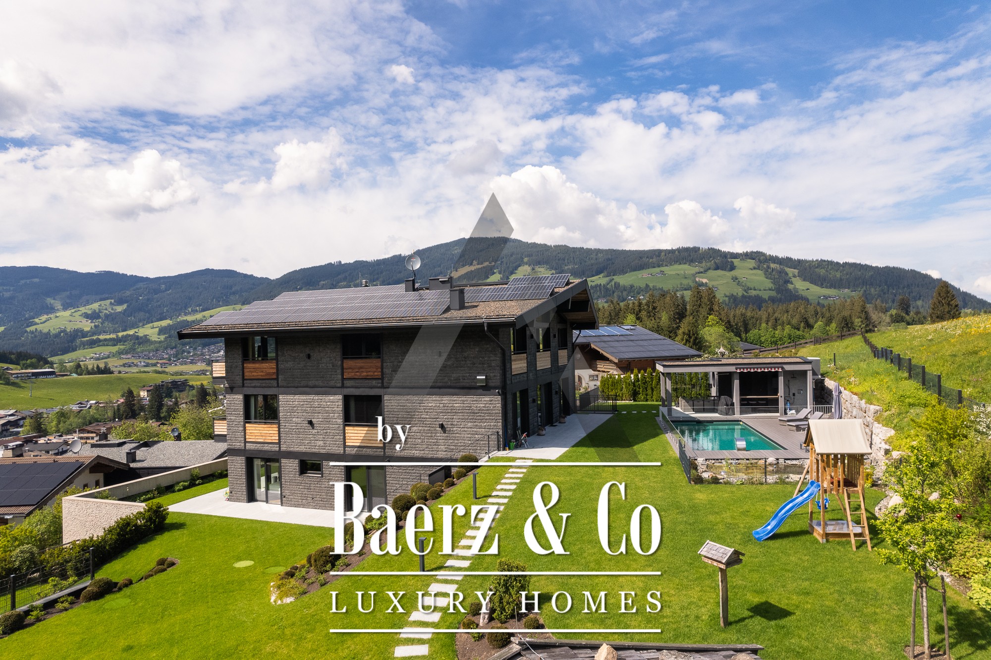 Villa Kirchberg in Tirol bevindt zich op een uitzonderlijk rustige en zonnige locatie op een perceel van 1.971 m² aan de rand van het dorp, met grenzen die uitlopen op weilanden en bossen aan de zuid- en oostzijde. Vanuit dit perspectief ontvouwt zich een ononderbroken panorama van de Gaisberg en Hohe Salve tot aan Kirchberg en de Kitzbüheler Horn, waarbij het samenspel van seizoenslicht en de helderheid van de Alpen wordt gevangen.