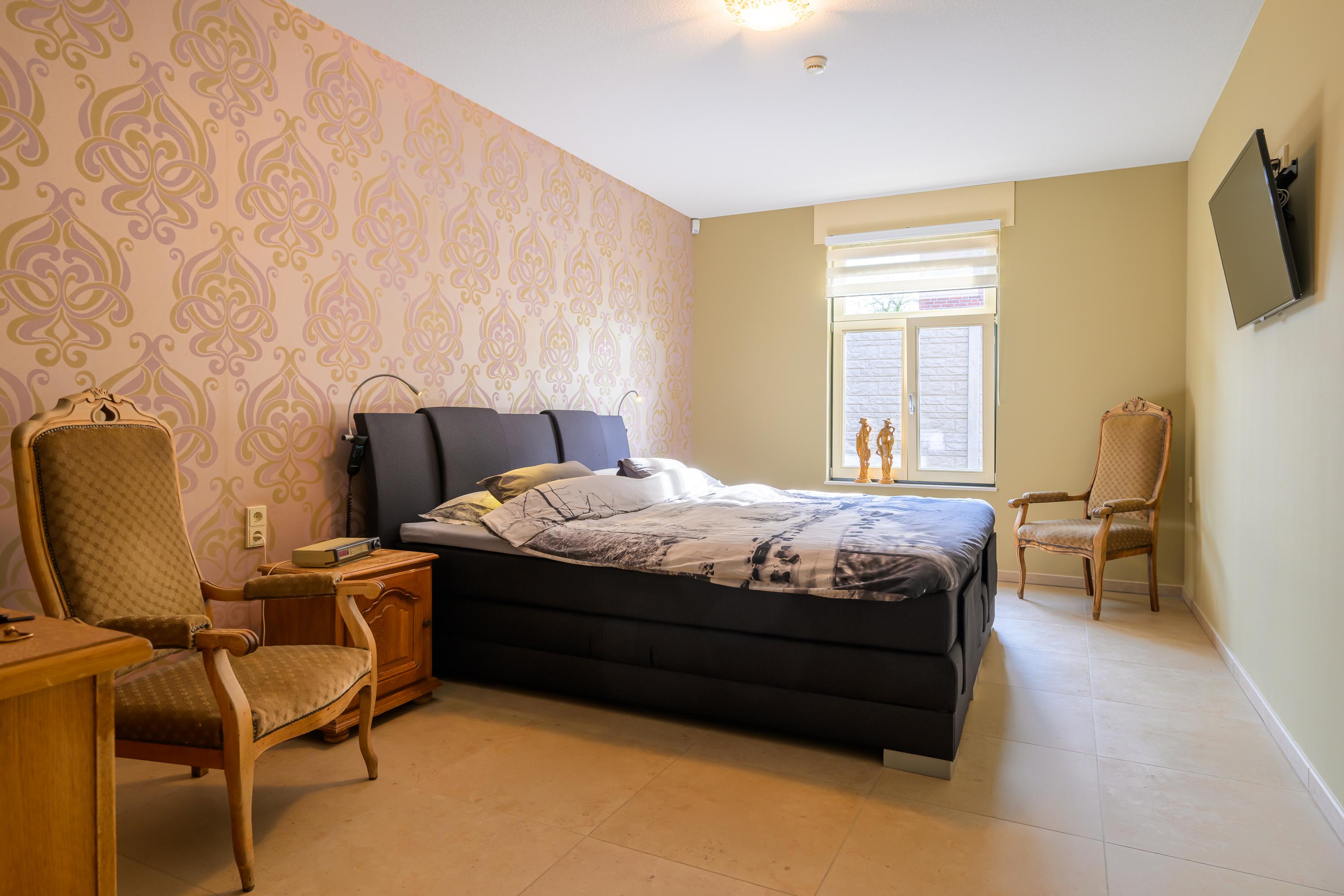 De eerste verdieping is toegankelijk via zowel de binnen- als de buitentrap. Ook hier is de ruimte verdeeld in twee delen. Het ene deel bevat een royale overloop, technische ruimte, zeer ruime slaapkamer en een bergzolder. Aan de andere kant bevindt zich een zelfstandig appartement, compleet uitgerust voor autonoom wonen. Via de buitentrap komen we binnen in een hal met toilet. Vanuit hier bereiken we de royale woon-/eetkamer. Deze is voorzien van een luxe keuken. De badkamer is uitgerust met: een wastafel, inloopdouche en witgoedaansluitingen. De slaapkamer heeft een handige schuifdeurenkast. Ook deze verdieping beschikt over vloerverwarming en profiteert van veel daglicht door de dakramen.