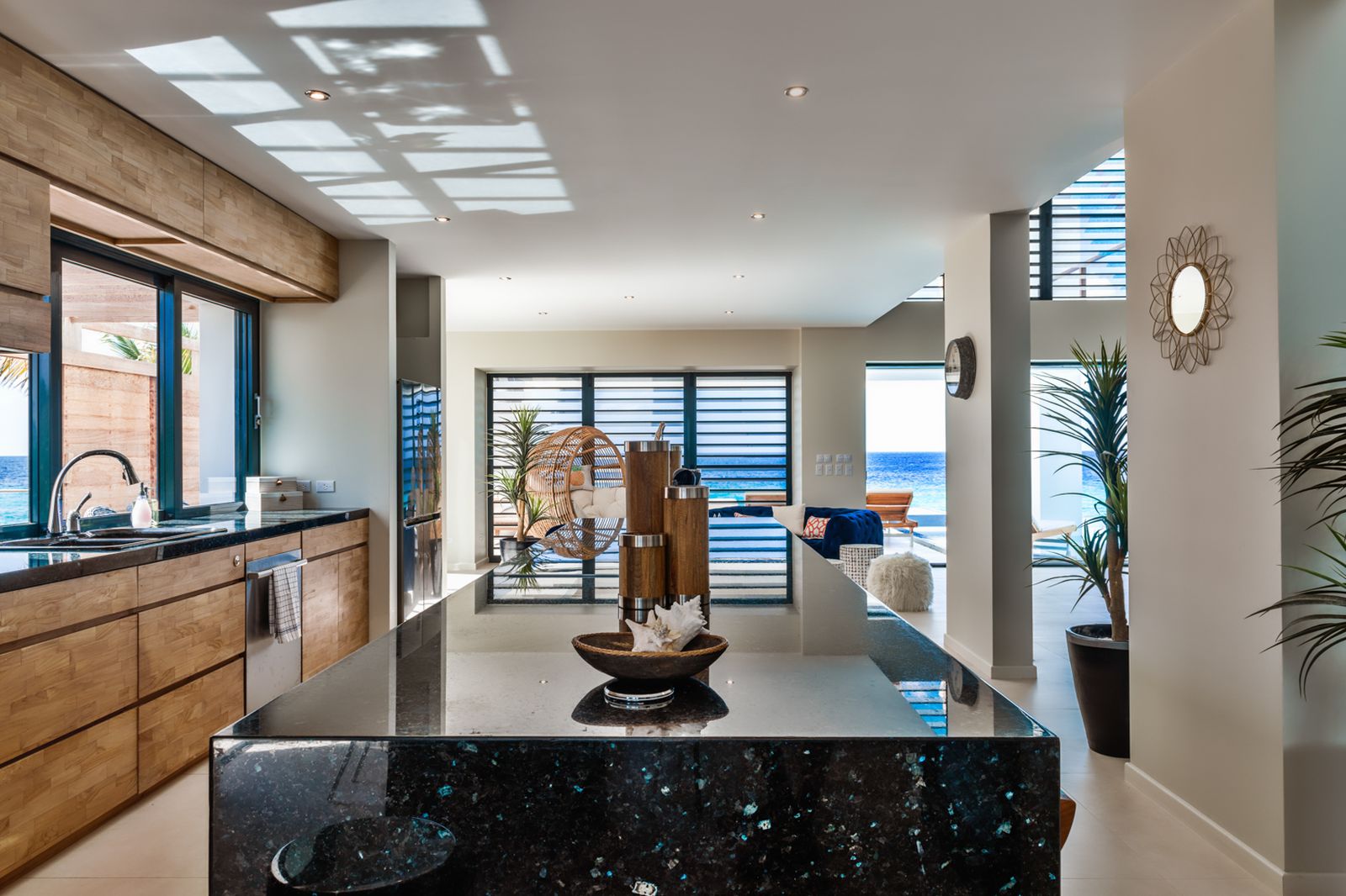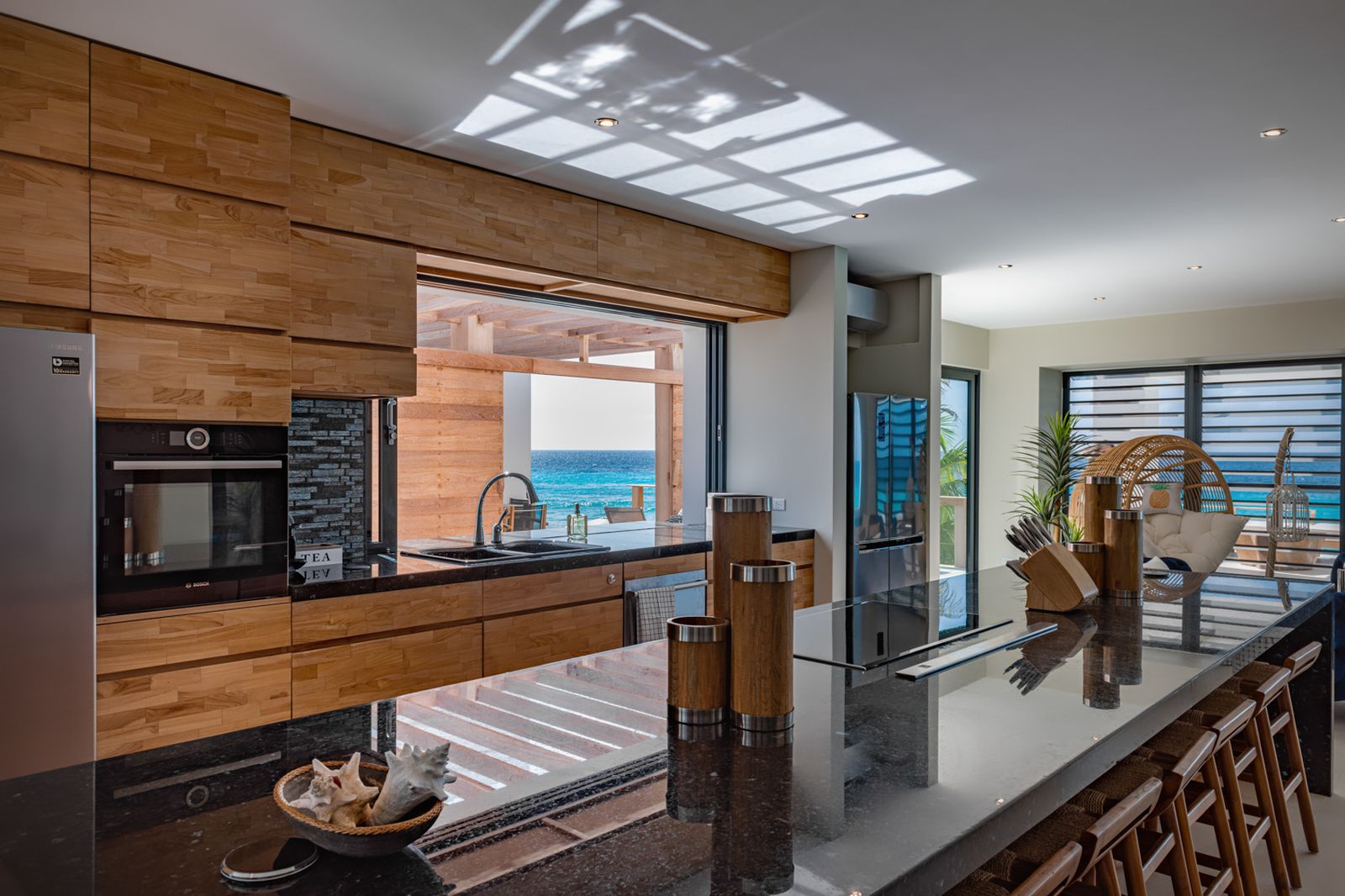 Vanaf het moment dat je binnenstapt, wordt je blik automatisch naar de diepblauwe Caribische Zee geleid.