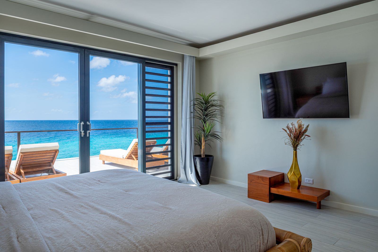 De master suite, met uitzicht over zee en een luxe vrijstaand bad, vormt een intieme en ontspannen retreat, perfect om te genieten van de wereldberoemde zonsondergangen van Bonaire.