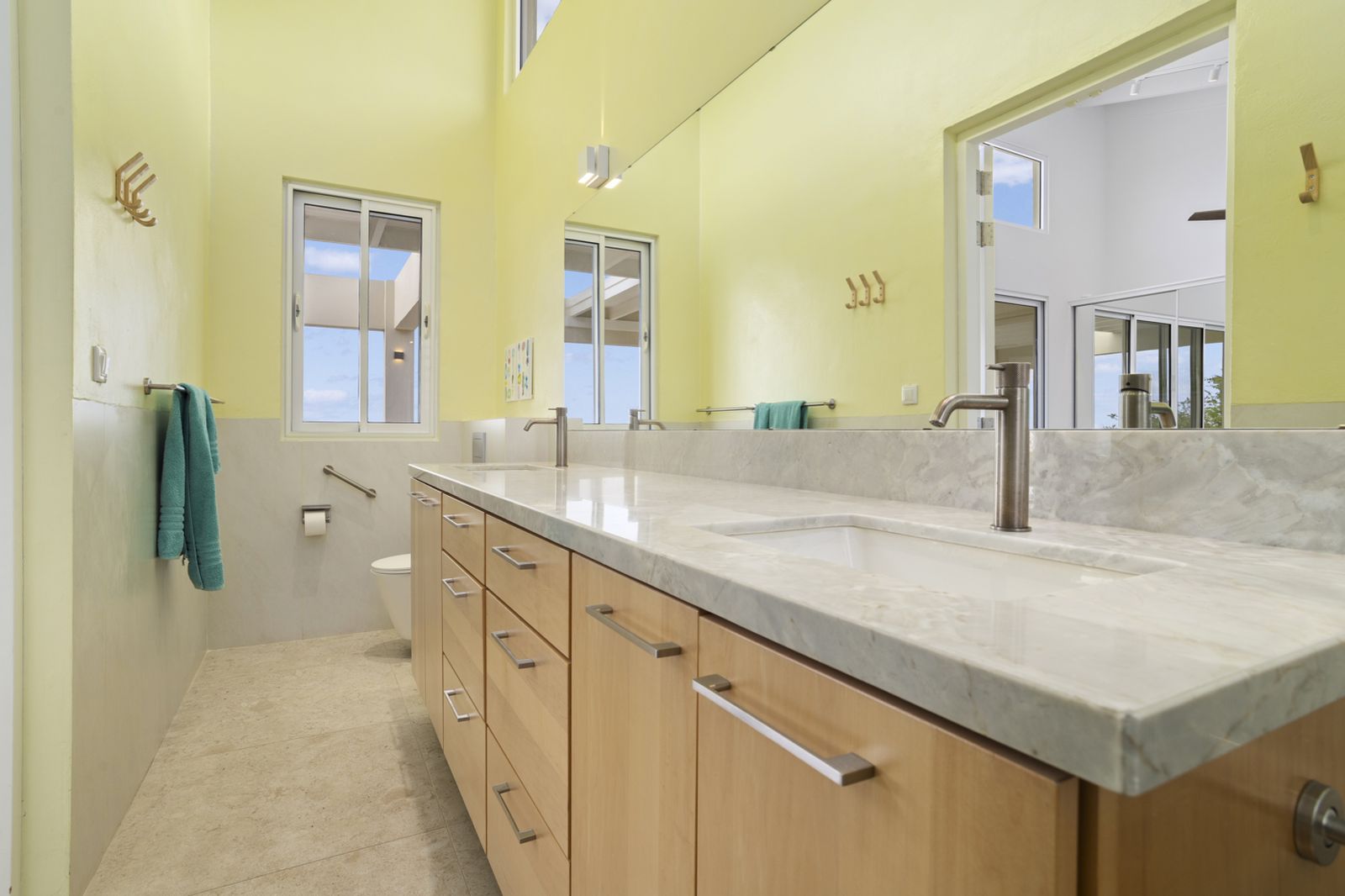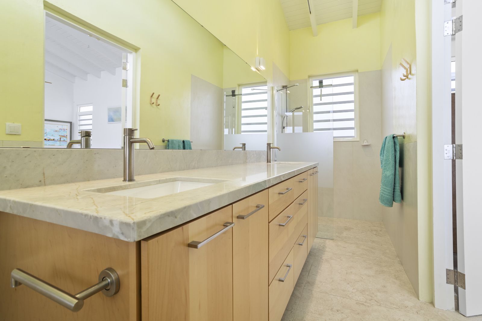 De ruime master bedroom kijkt uit over de Caribische Zee en beschikt over een verfijnde ensuite badkamer met dubbele wastafel en inloopdouche. De keuken met dubbel kookeiland is perfect voor wie graag gasten ontvangt, met veel werkruimte en een open verbinding naar de bar en het buitenterras. Daarnaast beschikt de woning over een grote, afsluitbare bergruimte voor watersportmateriaal, een zeldzame luxe op Bonaire.