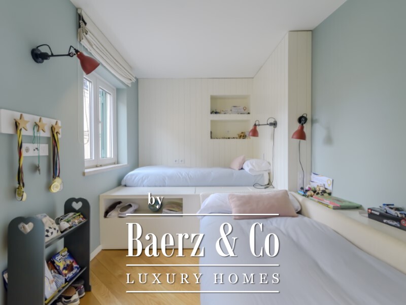 De slaapverdieping biedt een master suite van 22,1 m² met een eigen badkamer van 6,1 m², twee extra slaapkamers van 11,5 m² en 14,9 m², een tweede badkamer en een inloopkast. In het souterrain bevindt zich een lichte tv-kamer of werkkamer van 18 m², twee extra slaapkamers en nog een volledige badkamer. Volledige airconditioning en verfijnde Bosch-apparatuur tillen het dagelijkse comfort naar een hoger niveau.