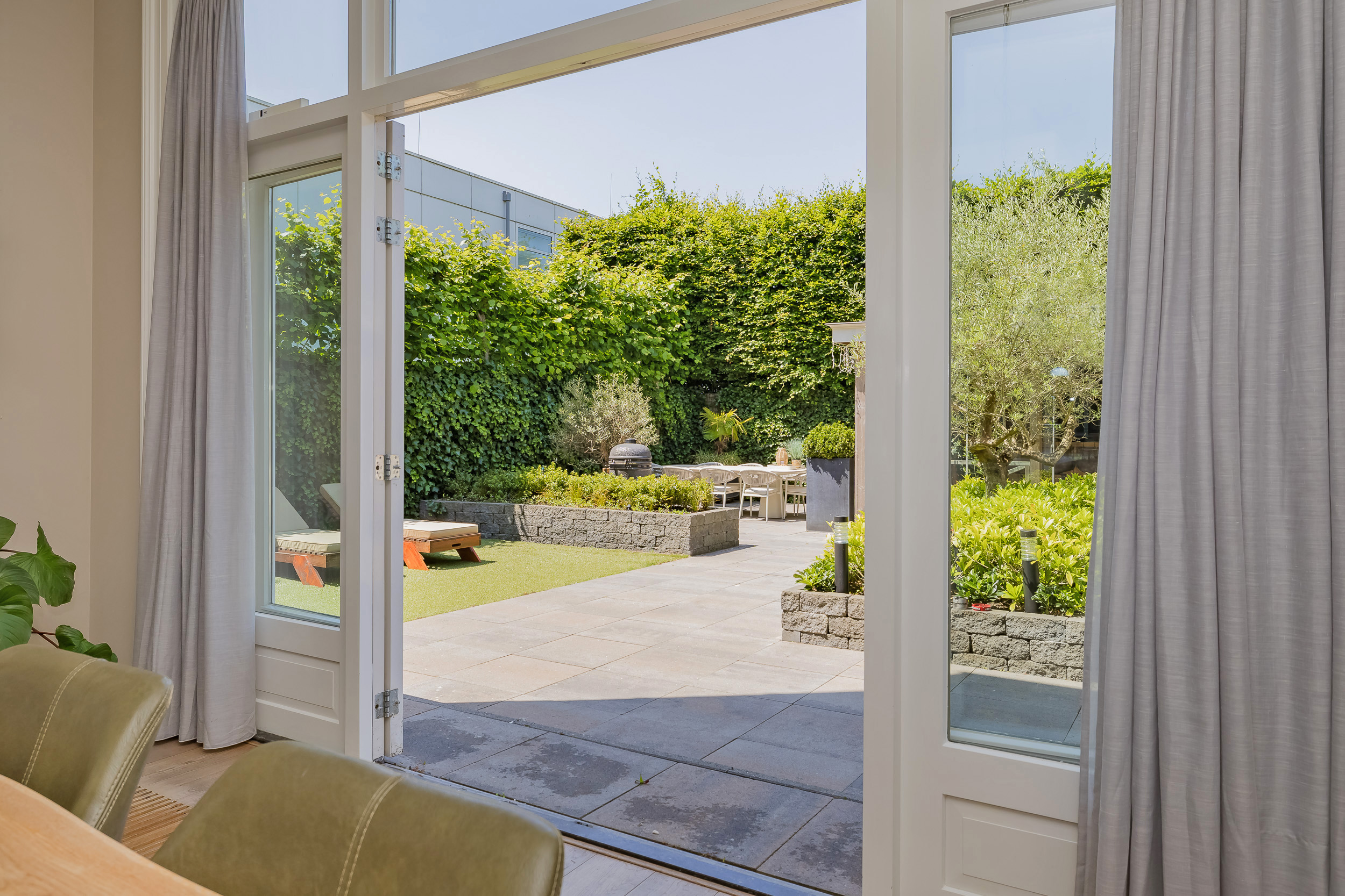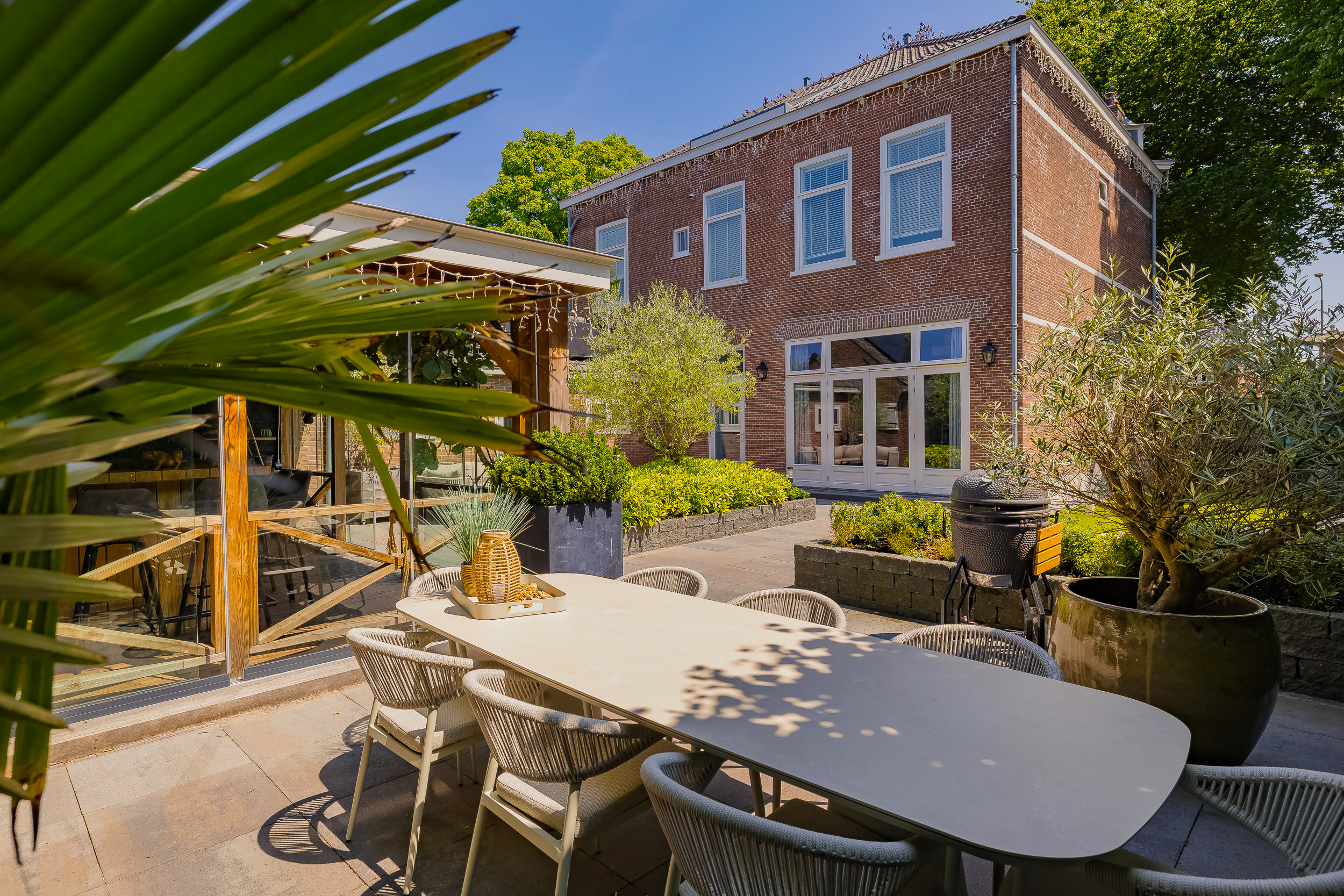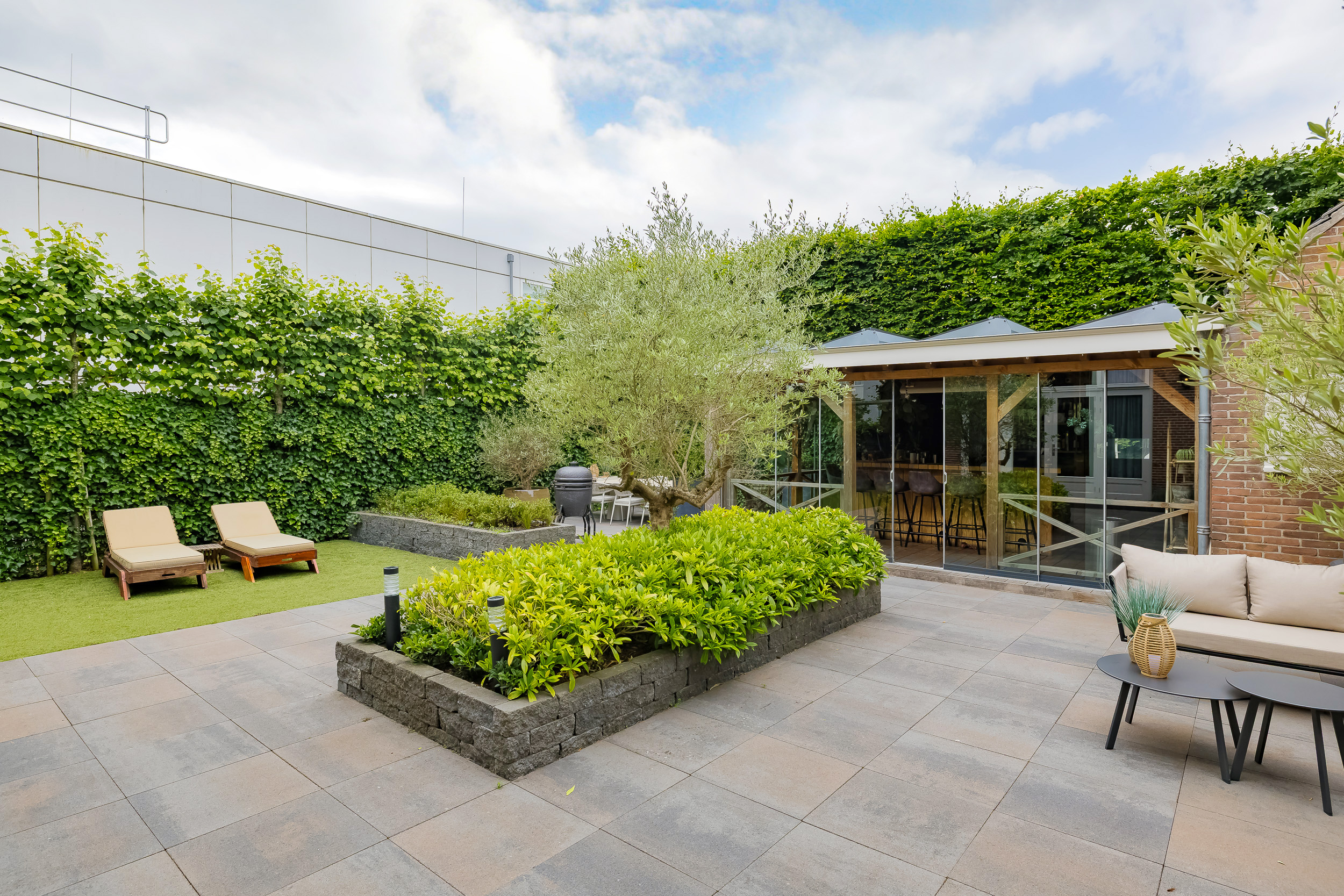 De prachtig aangelegde tuin ligt rondom de woning en heeft o.a. een nieuw in authentieke stijl smeedijzeren hek, verlichting en beregening. De zeer zonnige achtertuin van 13 meter diep en 7.5 meter breed biedt veel privacy en is o.a. voorzien van een grote veranda waarin het ook in de koudere maanden goed toeven is.