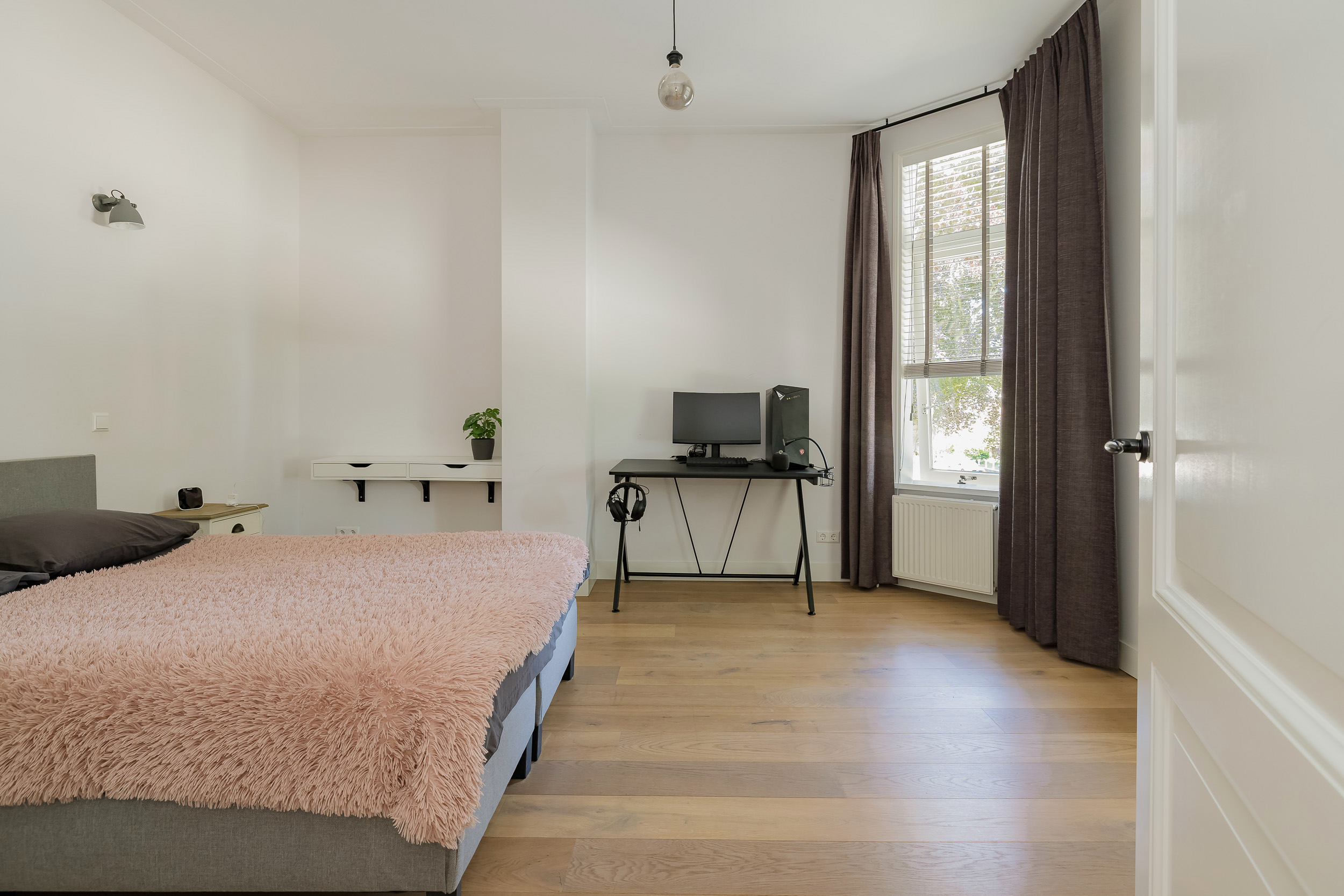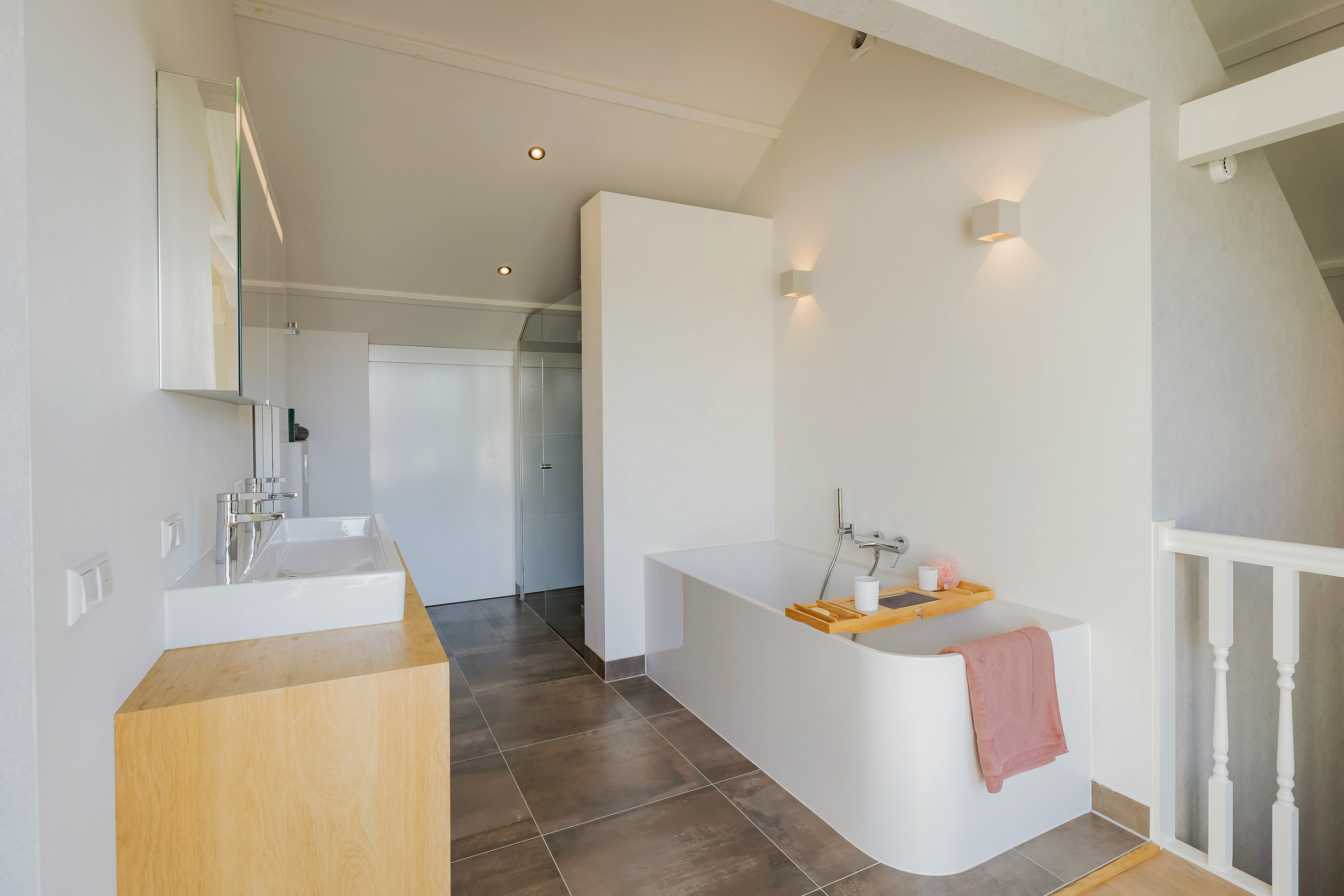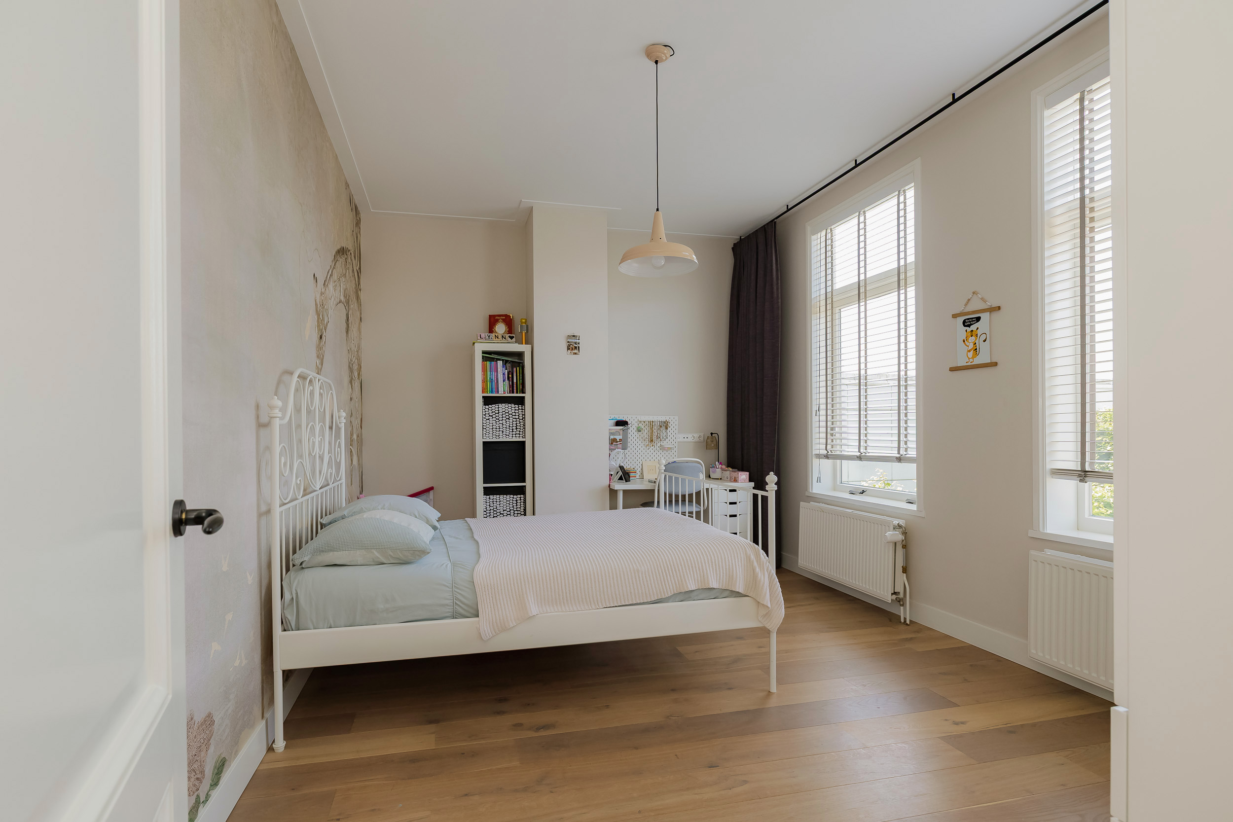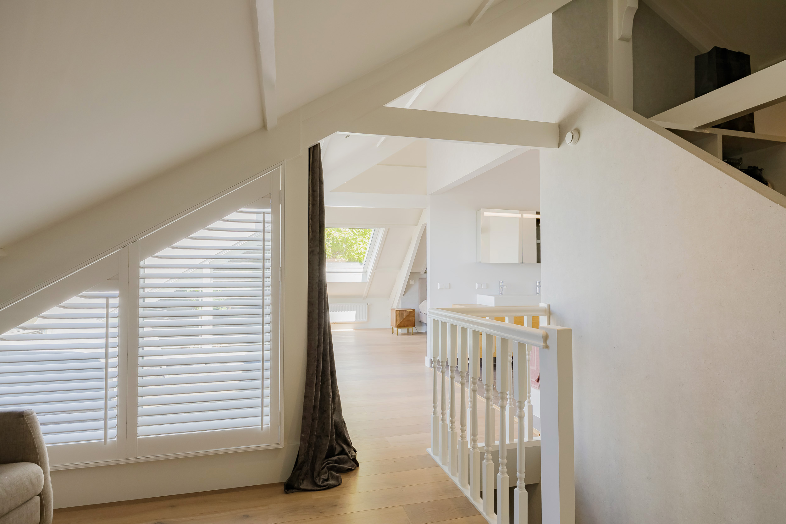 De hoofdslaapkamer bestrijkt de gehele etage en is voorzien van een inpandig balkon/loggia op het westen, inloopgarderobe en een luxe badkamer met ligbad, inloopdouche, 3e toilet en brede wastafel met twee kranen op houten meubel.