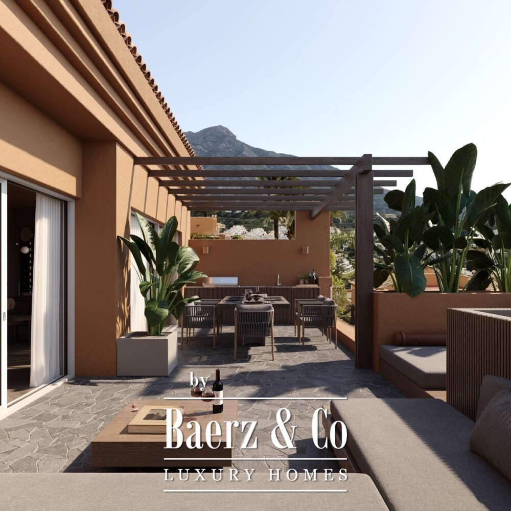 Dit duplex penthouse appartement in Marbella is een toonbeeld van verfijnde moderniteit en biedt 305 m² volledig heringerichte leefruimte, gerealiseerd met compromisloze aandacht voor vakmanschap. De renovatie combineert invloeden uit het midden van de vorige eeuw met hedendaags design; donker eikenhout en parketvloeren zorgen voor warmte, opgelicht door kleinformaat tegels in olijf- en koningsgroen. Vanaf het terras verbinden zee- en bergzicht de woning met het befaamde landschap van Nueva Andalucía.