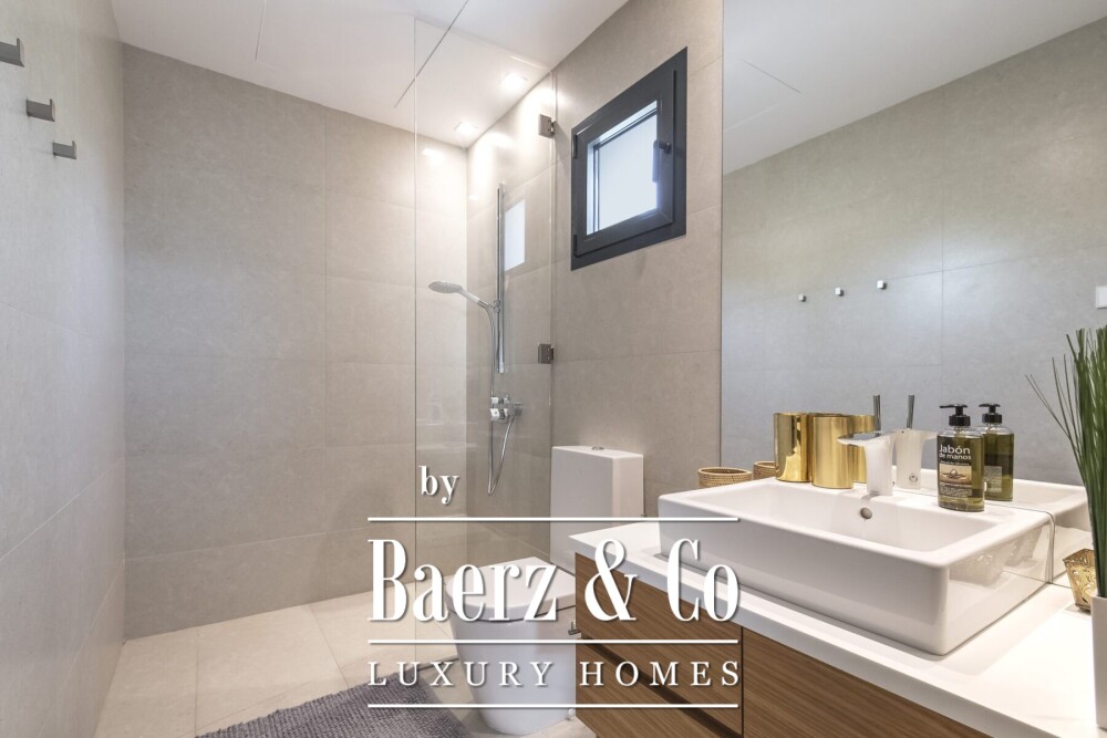 Op de eerste verdieping ligt de master suite met dubbele inbouwkasten, een en-suite badkamer en toegang tot het terras. Twee extra slaapkamers delen een terras en een badkamer. Het dakterras biedt panoramisch uitzicht, een pergola en een rooftop gym. In het souterrain bevinden zich twee natuurlijke verlichte slaapkamers, een wellnessruimte met jacuzzi, sauna, stoombad en praktische berging. Elke verdieping is bereikbaar via een lift en eikenhouten trap met glazen balustrades. Deze villa beschikt over zowel een woonvergunning (LPO) als verhuurlicentie, en ligt op korte afstand van de golfbanen en voorzieningen van Marbella, voor een ongeëvenaarde levensstijl direct aan de Middellandse Zee.