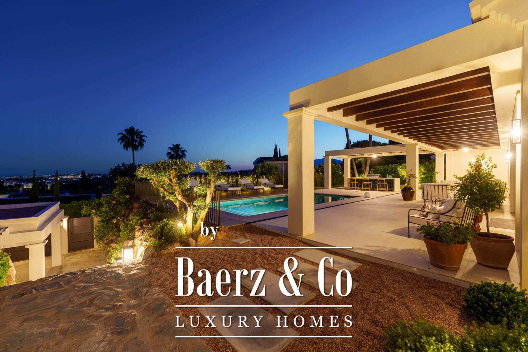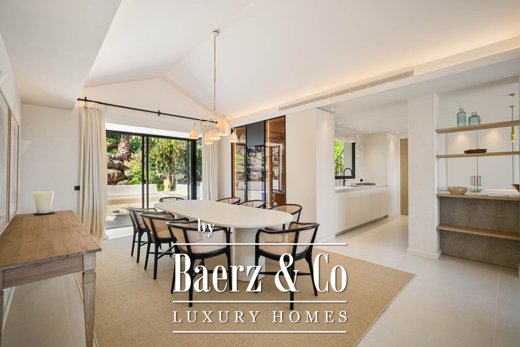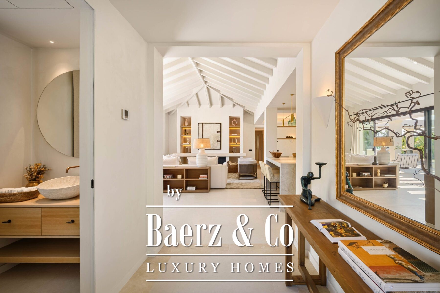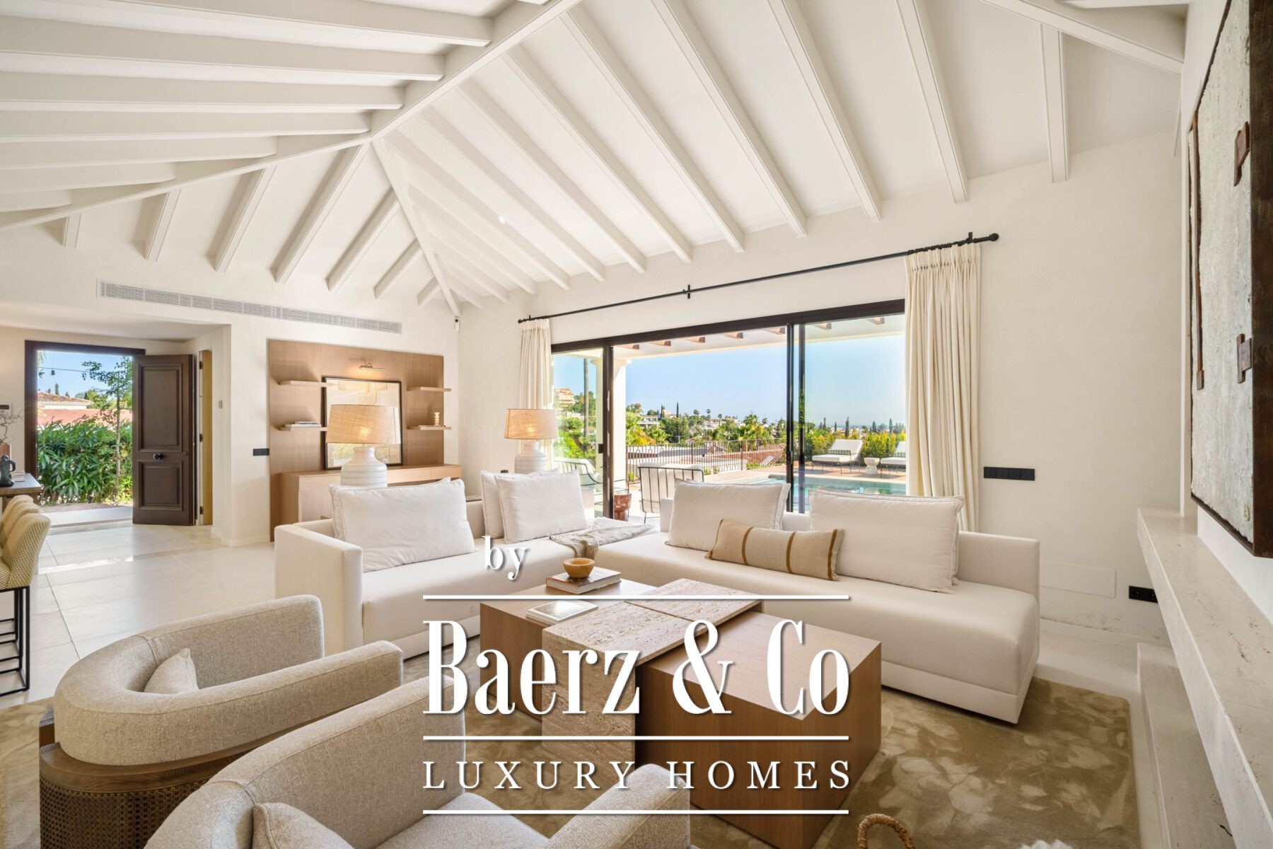 Villa Marbella met zee- en bergzicht bevindt zich in alle rust in Nueva Andalucía, op enkele minuten van de Los Naranjos Golf en nabij de befaamde stranden en restaurants van Marbella. Deze volledig gerenoveerde gelijkvloerse villa biedt 241 m² woonoppervlak op een verhoogd perceel van 855 m² en ademt de mediterrane levensstijl. Het leefgedeelte kenmerkt zich door een open indeling, hoge gewelfde plafonds en een palet aan zachte natuurlijke tinten. Daglicht stroomt vrij door de kamer dankzij schuifpuien van vloer tot plafond, die uitkomen op een royaal terras waar het infinity-zwembad lijkt te zweven boven het dal. Zowel vanuit de woning als vanaf het dakterras strekken panoramische vergezichten zich uit over de vallei tot aan de zee.