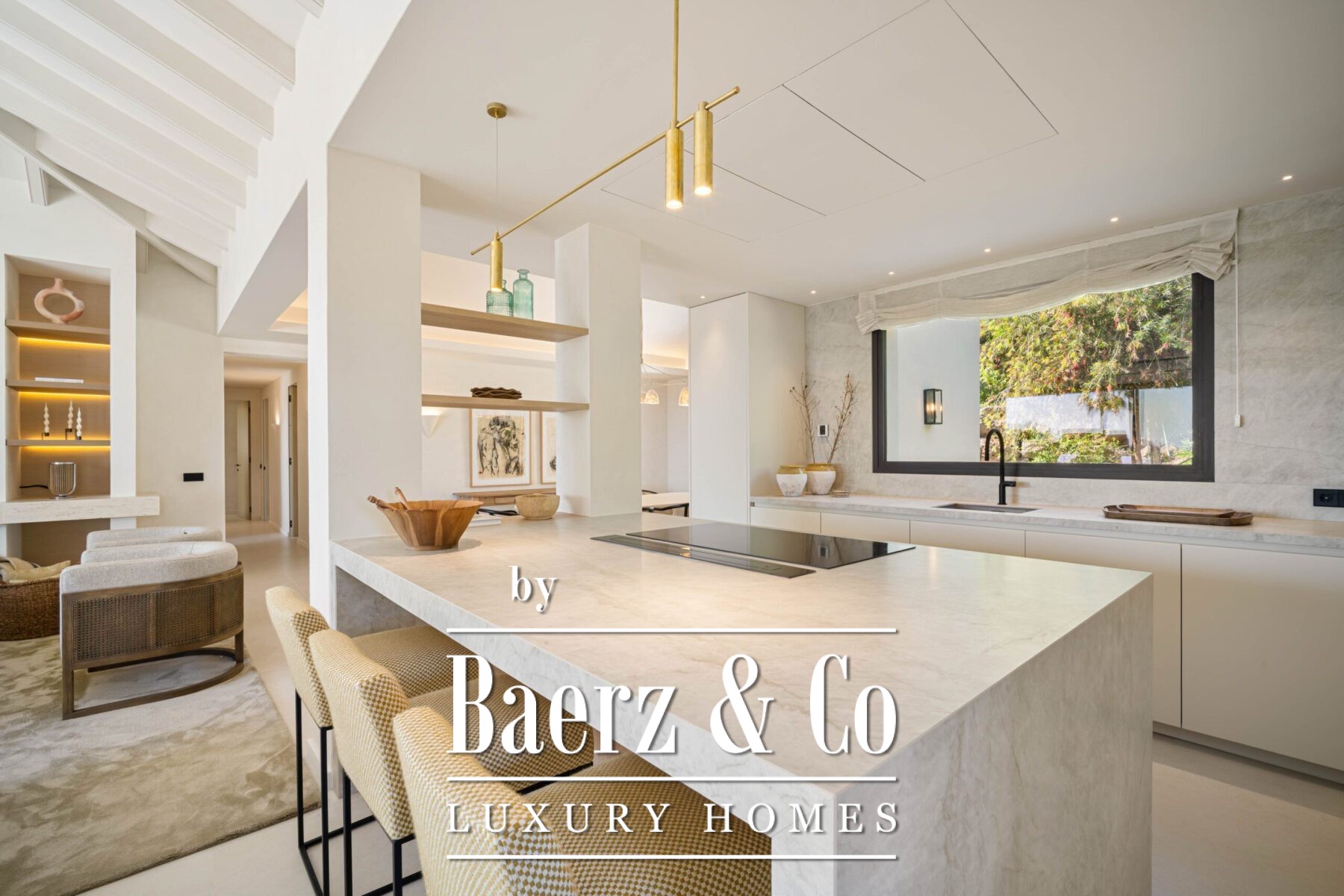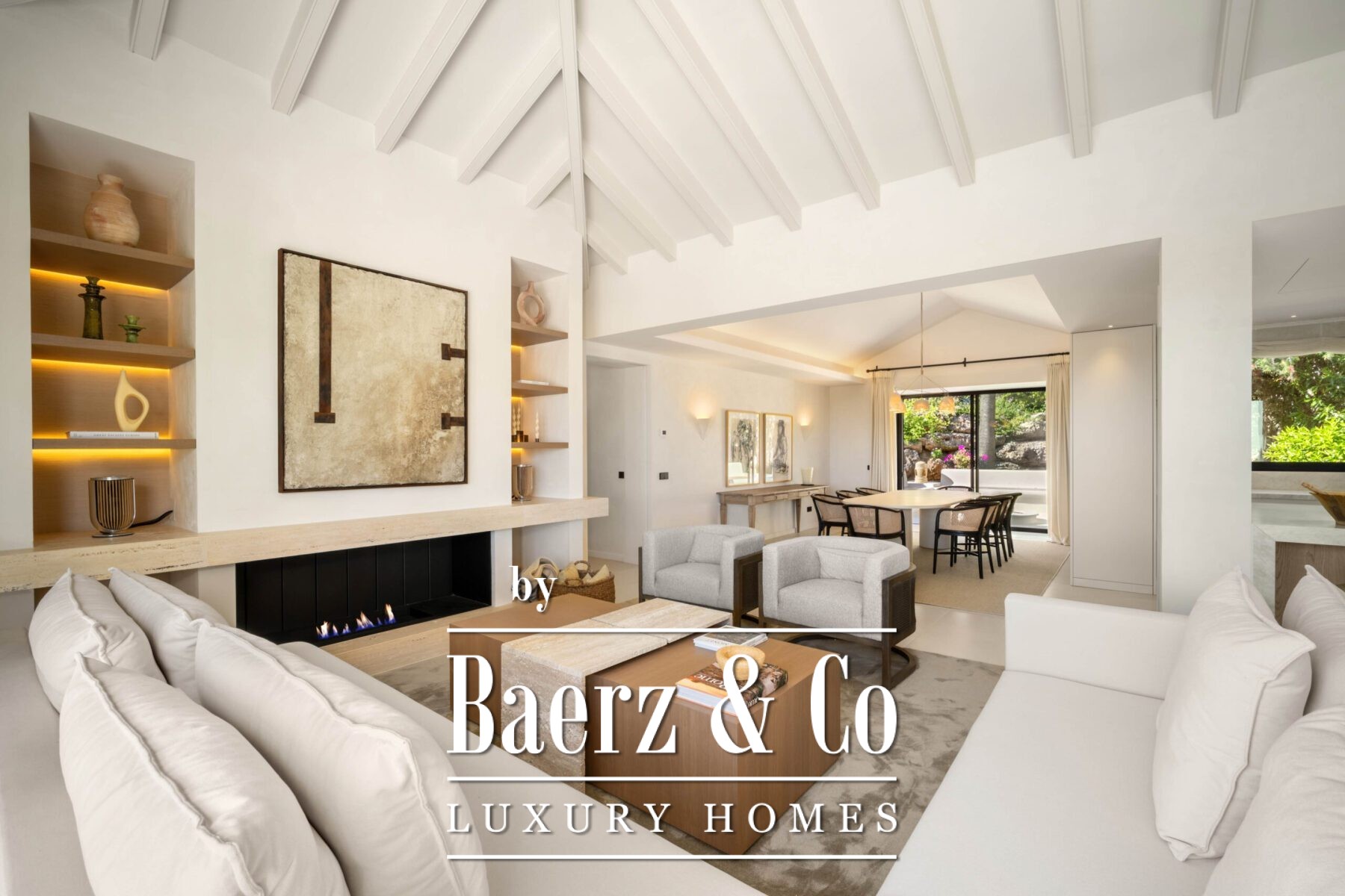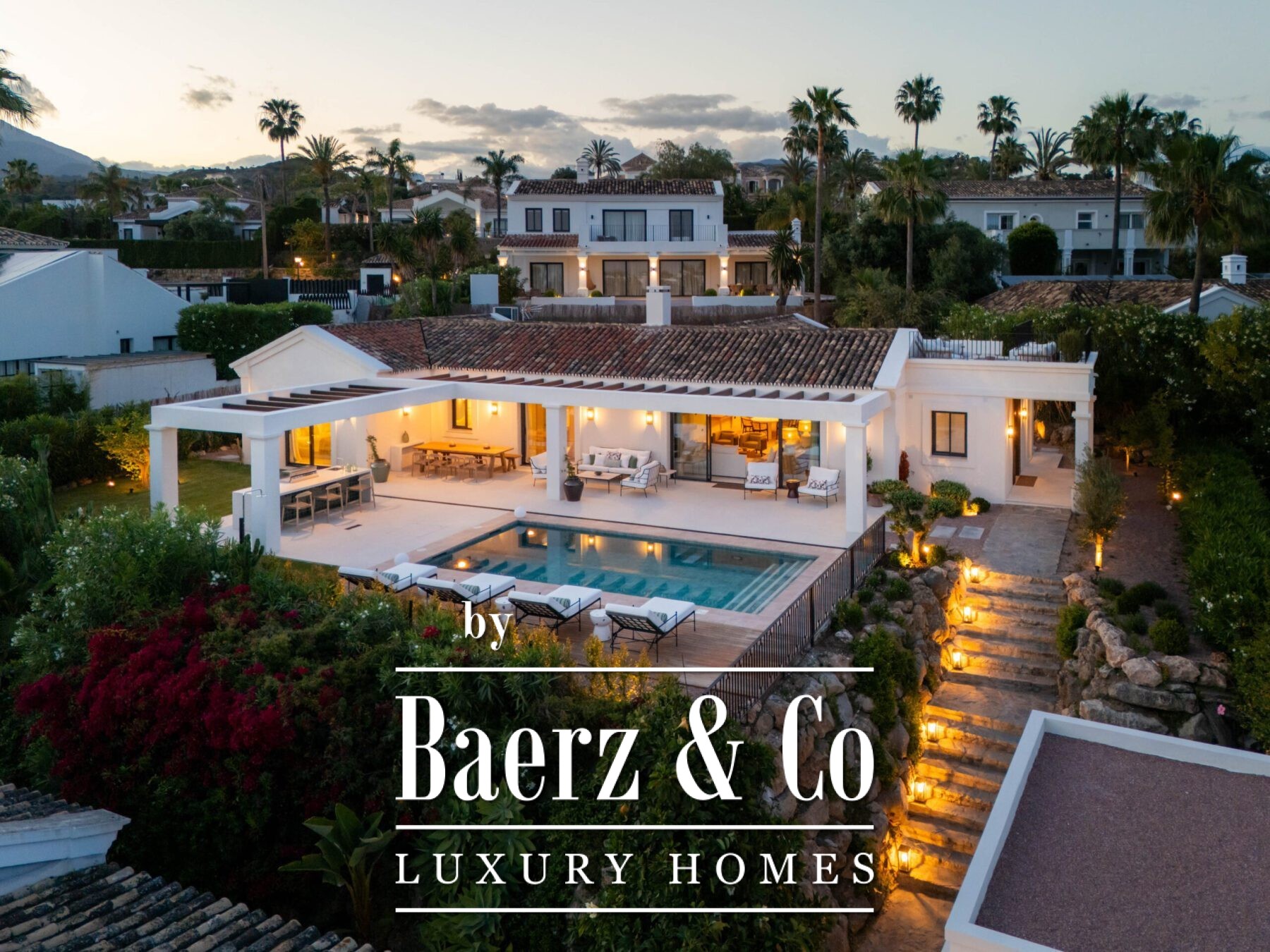 Villa Marbella met zee- en bergzicht bevindt zich in alle rust in Nueva Andalucía, op enkele minuten van de Los Naranjos Golf en nabij de befaamde stranden en restaurants van Marbella. Deze volledig gerenoveerde gelijkvloerse villa biedt 241 m² woonoppervlak op een verhoogd perceel van 855 m² en ademt de mediterrane levensstijl. Het leefgedeelte kenmerkt zich door een open indeling, hoge gewelfde plafonds en een palet aan zachte natuurlijke tinten. Daglicht stroomt vrij door de kamer dankzij schuifpuien van vloer tot plafond, die uitkomen op een royaal terras waar het infinity-zwembad lijkt te zweven boven het dal. Zowel vanuit de woning als vanaf het dakterras strekken panoramische vergezichten zich uit over de vallei tot aan de zee.