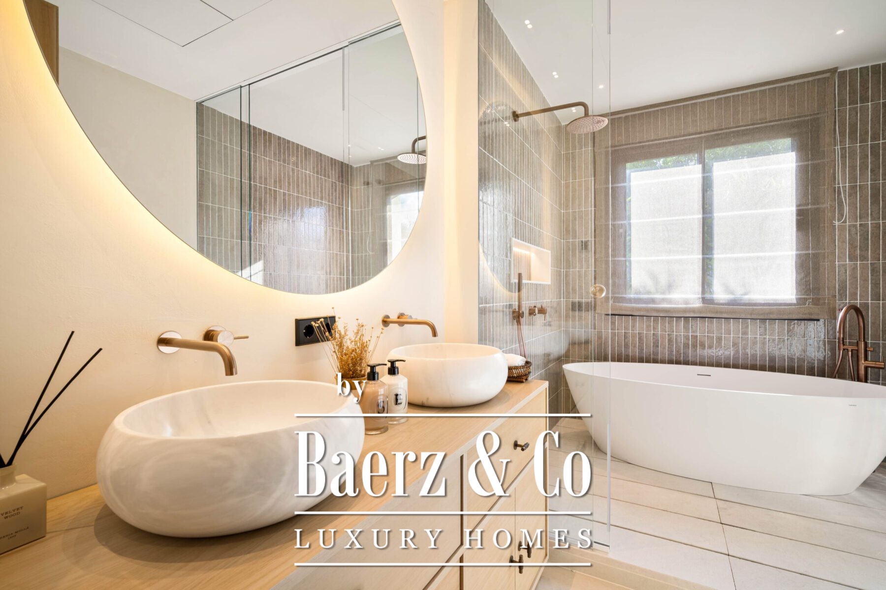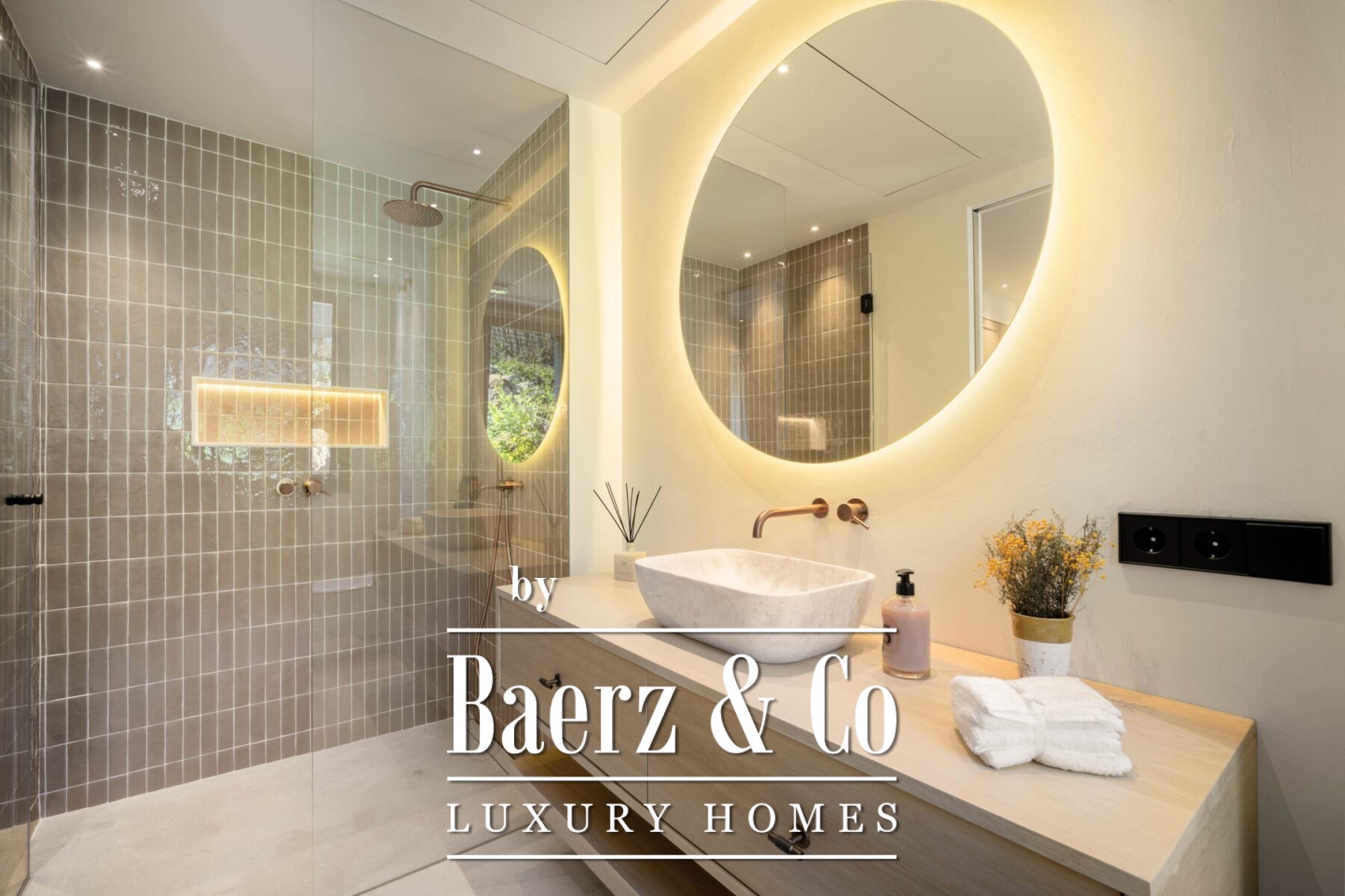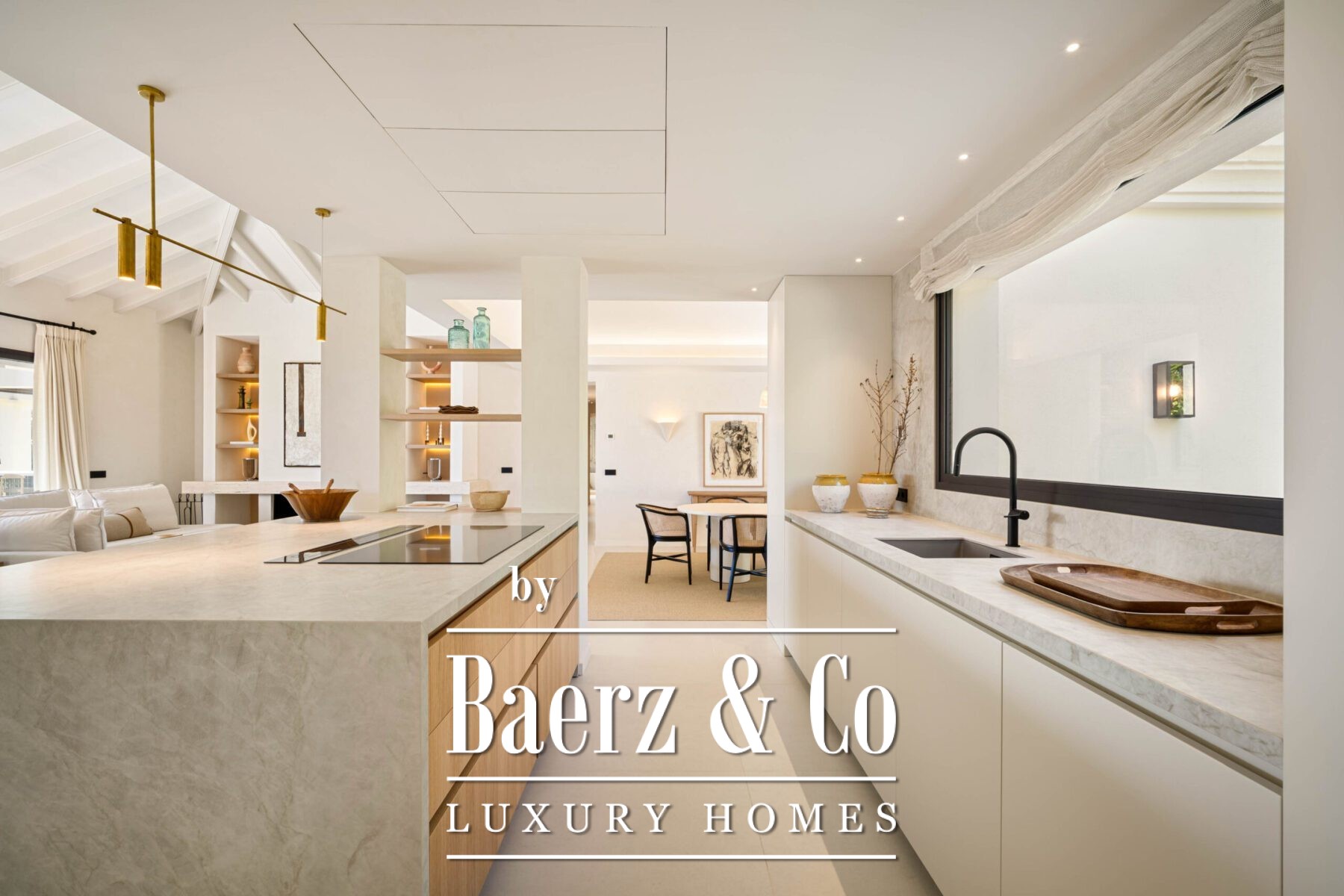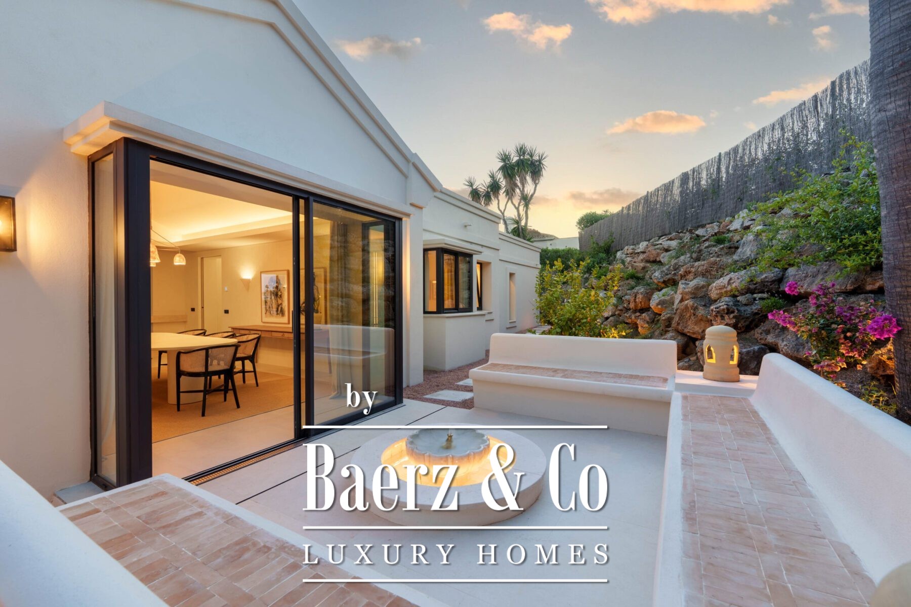 Villa Marbella met zee- en bergzicht bevindt zich in alle rust in Nueva Andalucía, op enkele minuten van de Los Naranjos Golf en nabij de befaamde stranden en restaurants van Marbella. Deze volledig gerenoveerde gelijkvloerse villa biedt 241 m² woonoppervlak op een verhoogd perceel van 855 m² en ademt de mediterrane levensstijl. Het leefgedeelte kenmerkt zich door een open indeling, hoge gewelfde plafonds en een palet aan zachte natuurlijke tinten. Daglicht stroomt vrij door de kamer dankzij schuifpuien van vloer tot plafond, die uitkomen op een royaal terras waar het infinity-zwembad lijkt te zweven boven het dal. Zowel vanuit de woning als vanaf het dakterras strekken panoramische vergezichten zich uit over de vallei tot aan de zee.