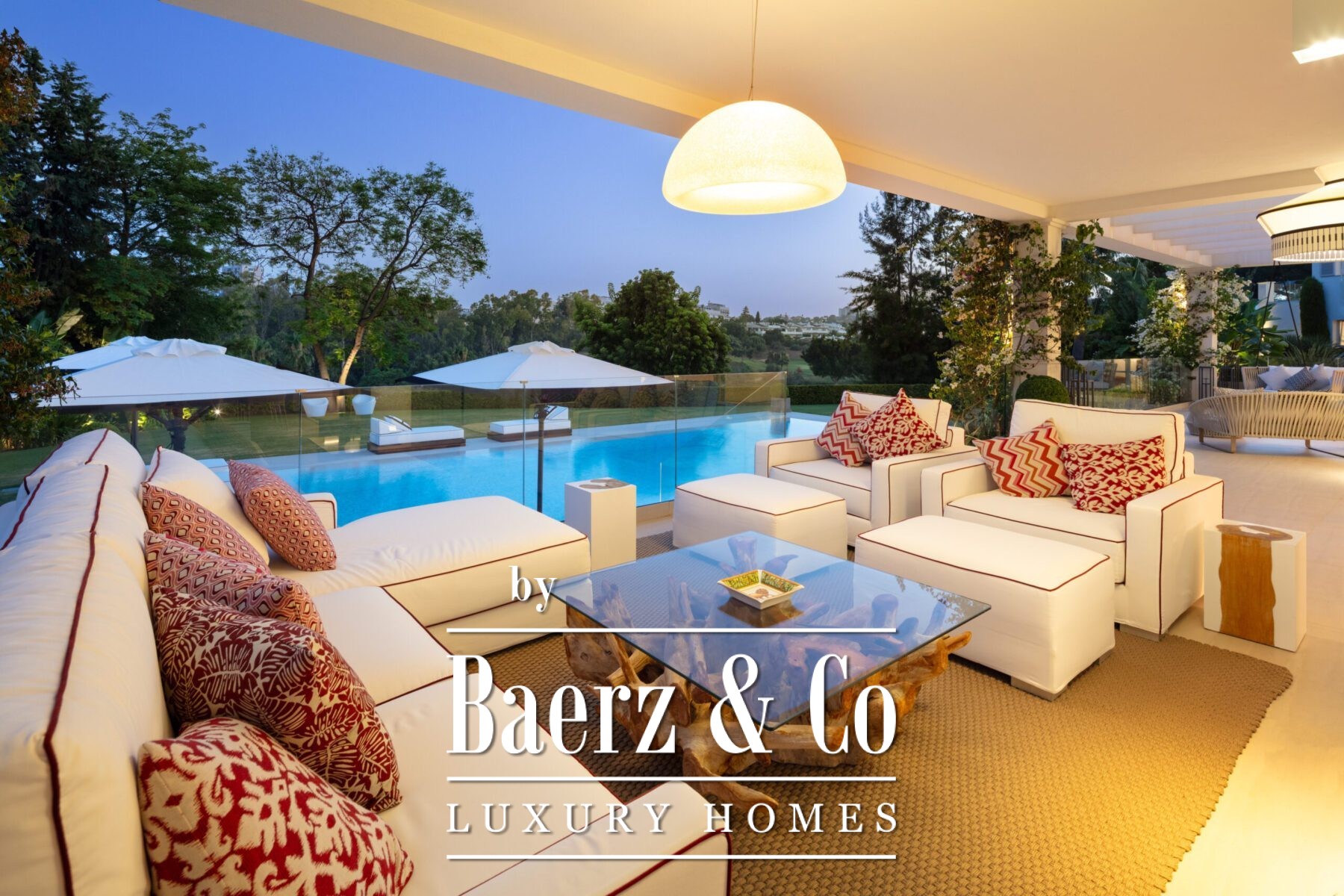 A private oasis nestled in the luxurious area of Marbella's Golf Valley. This magnificent mansion sits in a prestigious gated community and boasts an enviable front-line position overlooking Aloha Golf Course. Its timeless exterior and top-of-the-line interior finishes strike the perfect balance between classic elegance and modern sophistication. The property strikes a perfect balance between classic elegance and modern sophistication, featuring a timeless exterior and top-of-the-line interior finishes. The colour pallet used to decorate the interior is soft and inviting, exuding a calming atmosphere that one expects when coming back home.