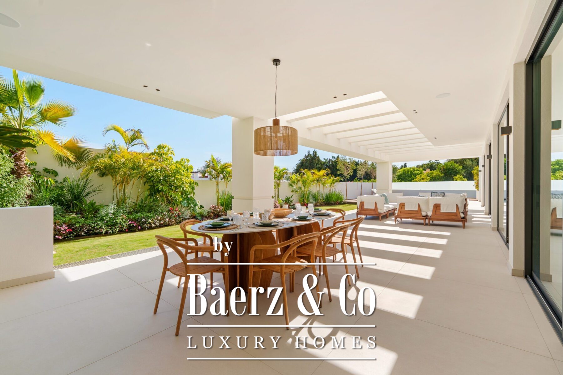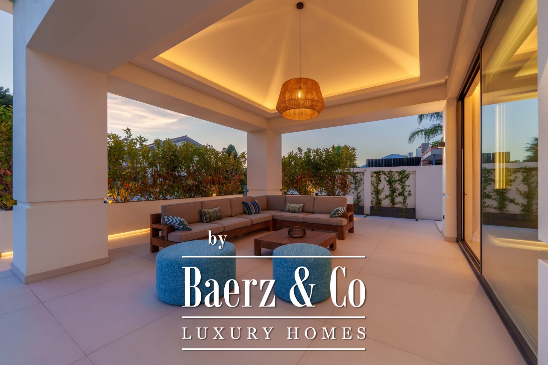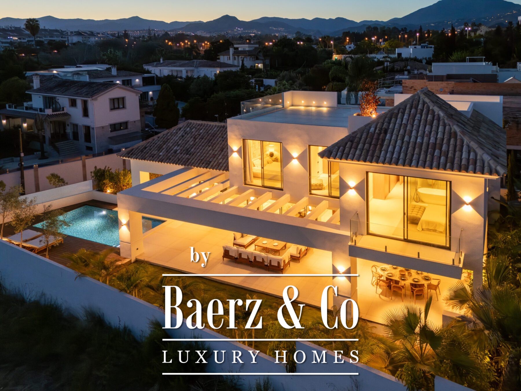 Deze eigentijdse villa in Marbella biedt een ingetogen toevluchtsoord in de gewilde wijk San Pedro de Alcántara, waar privacy en heldere architectuur het dagelijks leven vormgeven. Achter strakke witte gevels en zorgvuldig aangelegde begroeiing ontvouwt zich een woonruimte van 446 m², een weelderige oase met een privézwembad, houten terras en royale overdekte terrassen die uitnodigen tot dineren en ontspannen. Het dakterras vangen de essentie van zorgeloos kustleven en creëren ruimte voor zowel ontmoetingen als stille momenten.