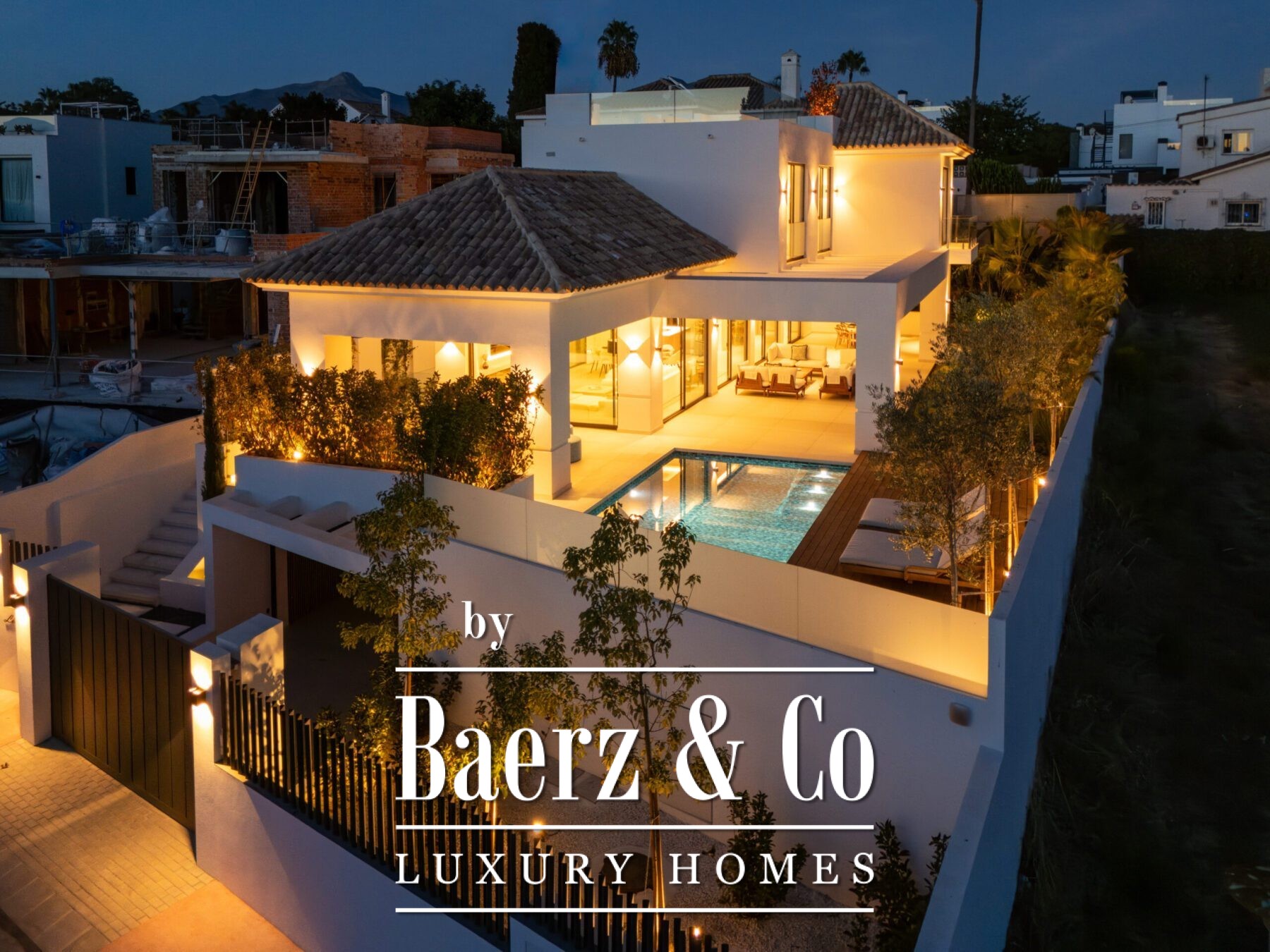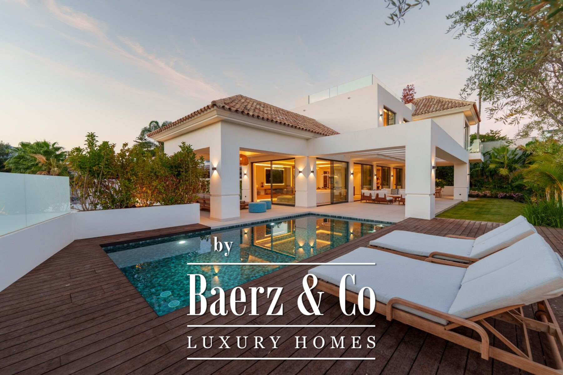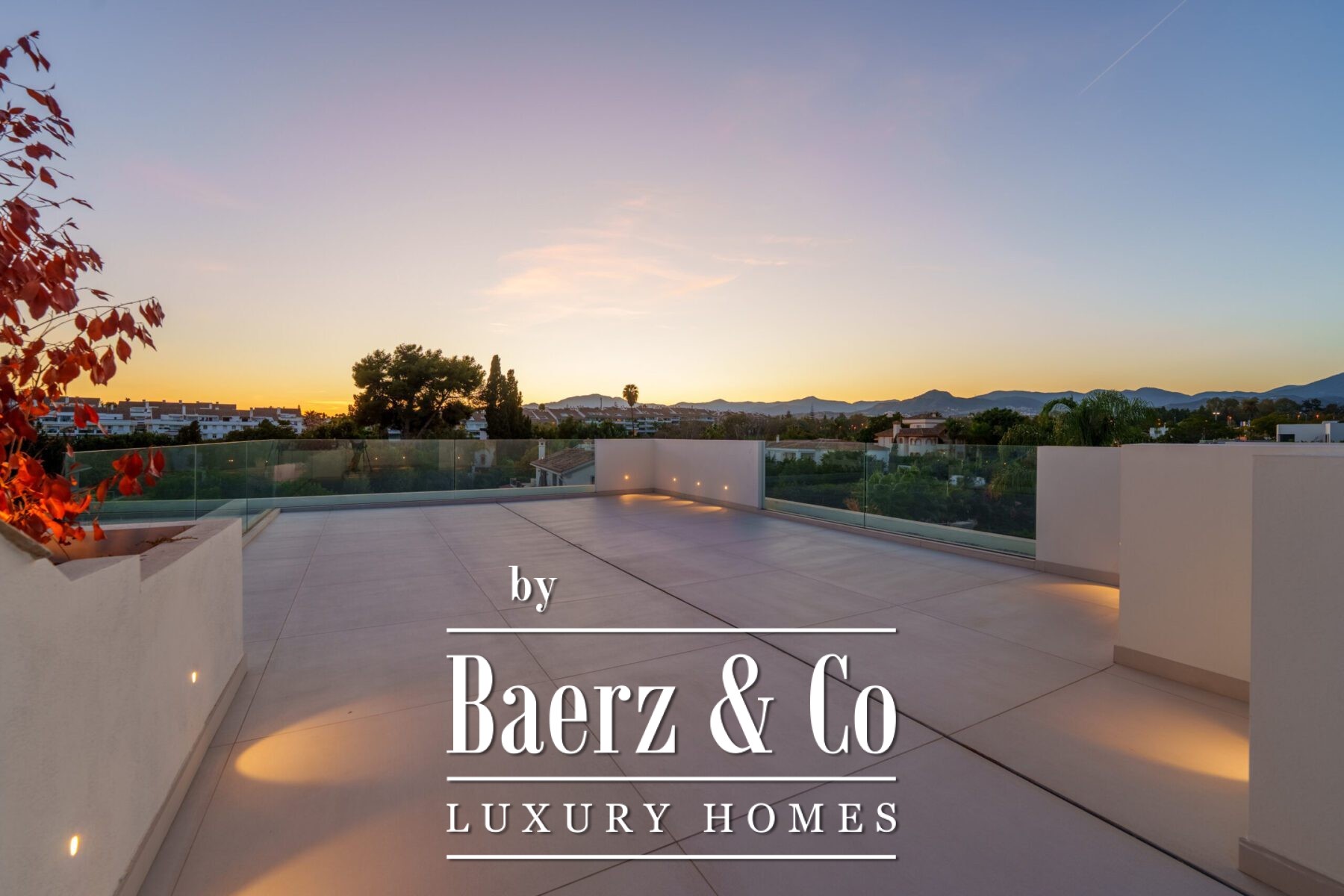 Deze eigentijdse villa in Marbella biedt een ingetogen toevluchtsoord in de gewilde wijk San Pedro de Alcántara, waar privacy en heldere architectuur het dagelijks leven vormgeven. Achter strakke witte gevels en zorgvuldig aangelegde begroeiing ontvouwt zich een woonruimte van 446 m², een weelderige oase met een privézwembad, houten terras en royale overdekte terrassen die uitnodigen tot dineren en ontspannen. Het dakterras vangen de essentie van zorgeloos kustleven en creëren ruimte voor zowel ontmoetingen als stille momenten.