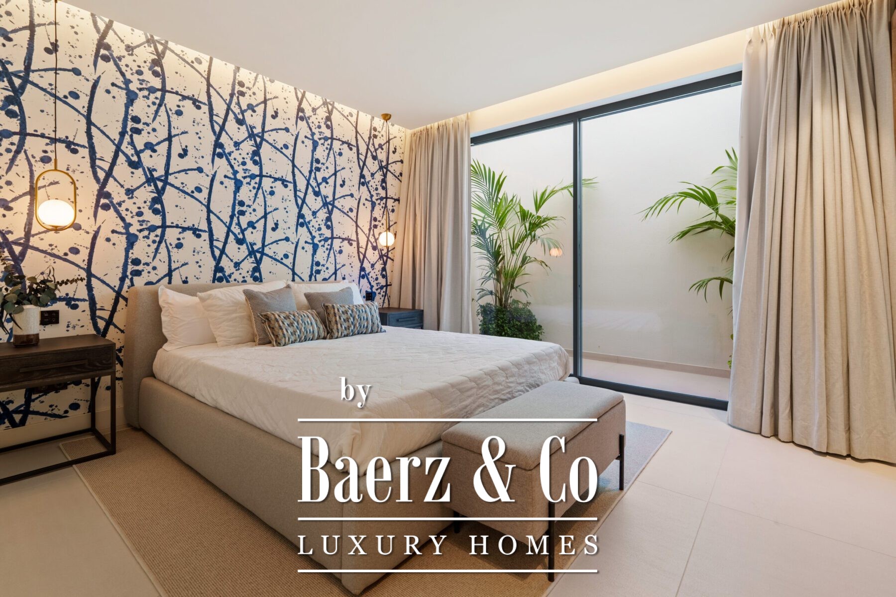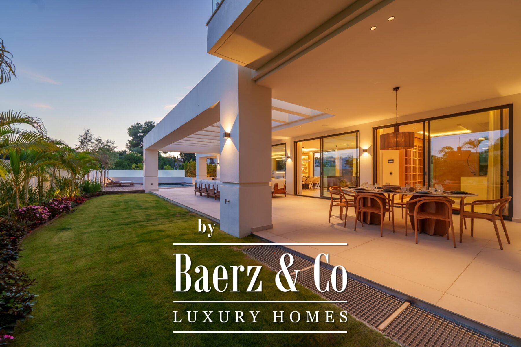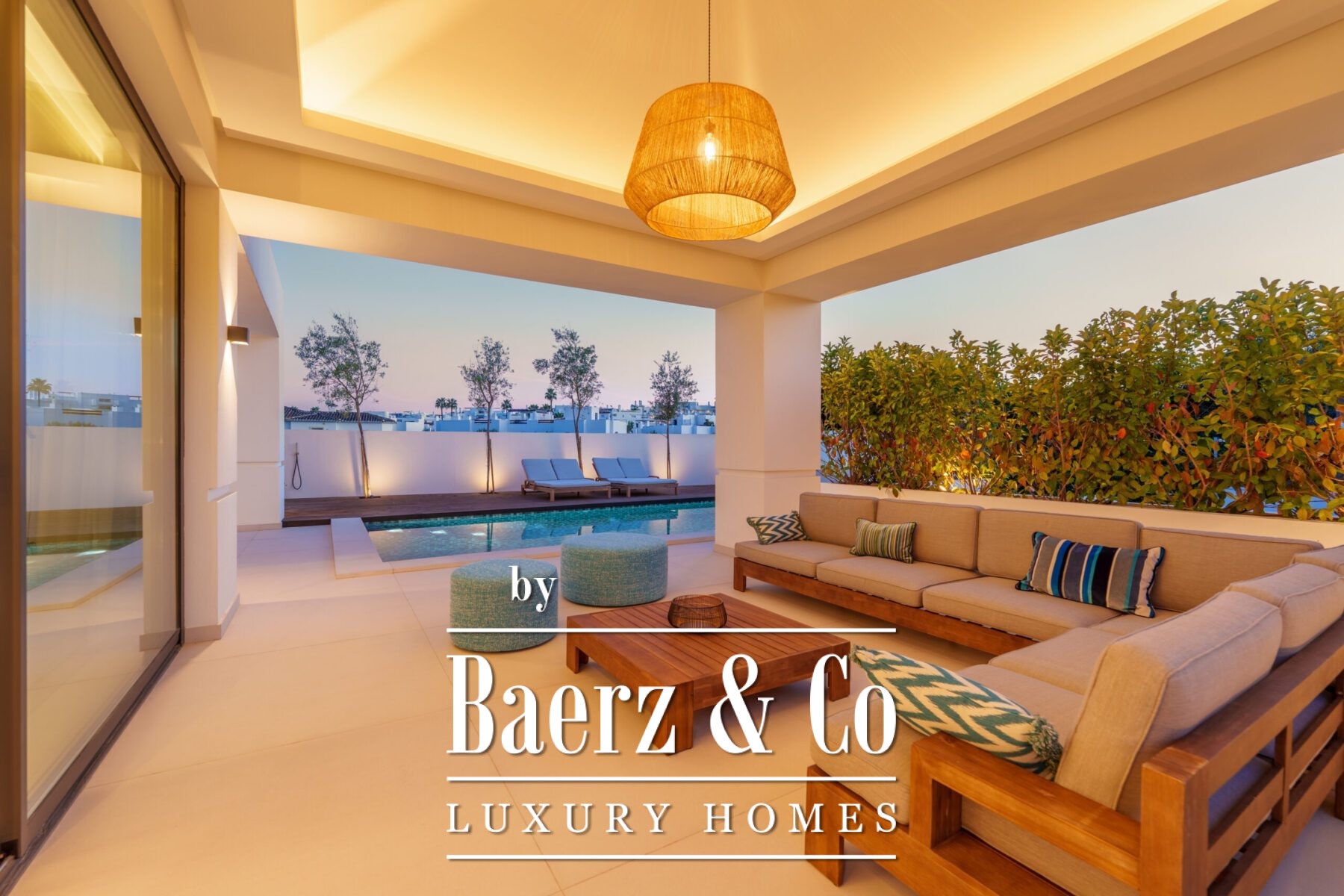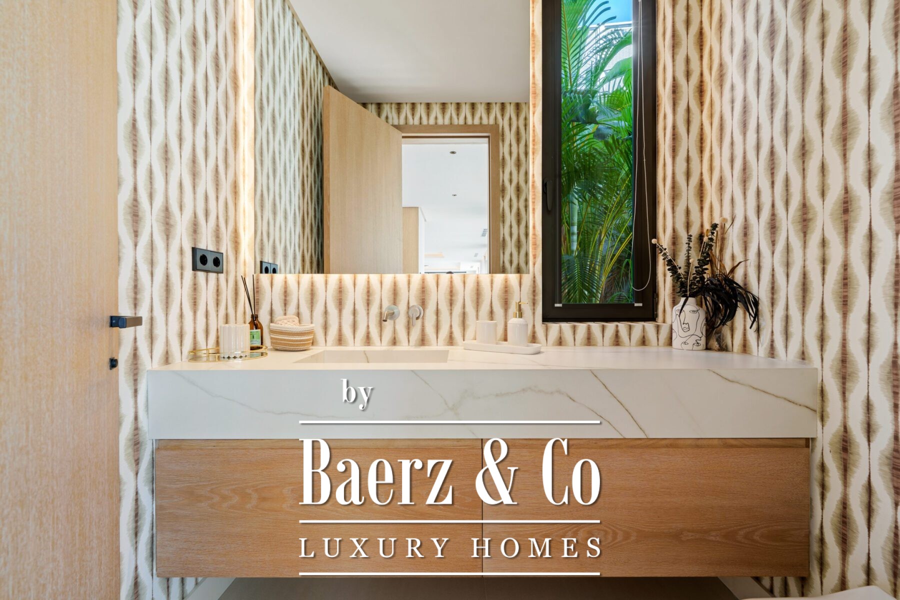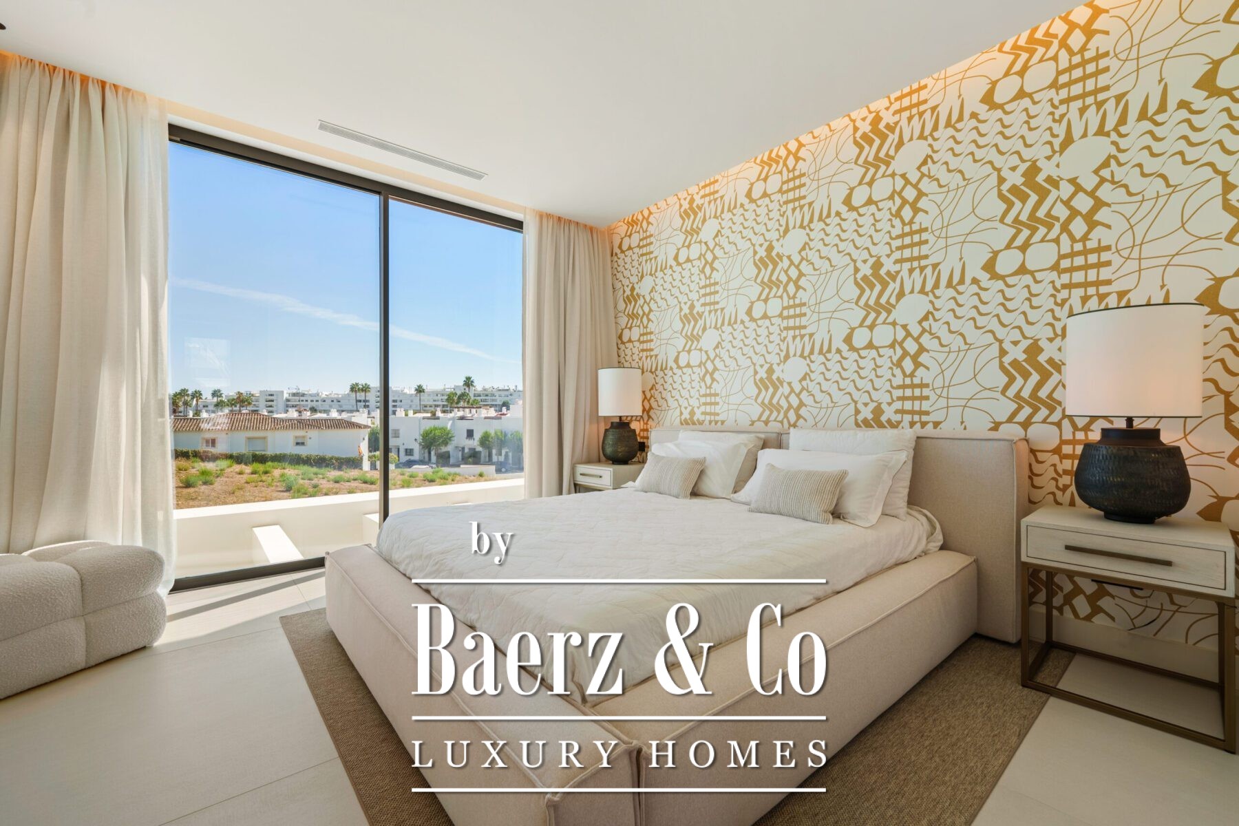 Het interieur ademt licht en sereniteit, met zachte neutrale tinten, subtiele inbouwverlichting en royale raampartijen van vloer tot plafond die het Andalusische licht binnenlaten. De open leef- en eetruimte, voorzien van een op maat gemaakte entertainmentwand en moderne afwerking, loopt naadloos over in de hoogwaardige keuken waar een houten kookeiland en geïntegreerde apparatuur samengaan met strak vormgegeven kasten. Deze vloeiende ruimte-ervaring zet zich voort in de eetkamer, ideaal voor betekenisvolle samenzijn.