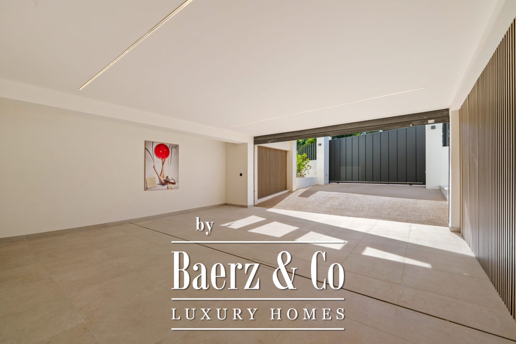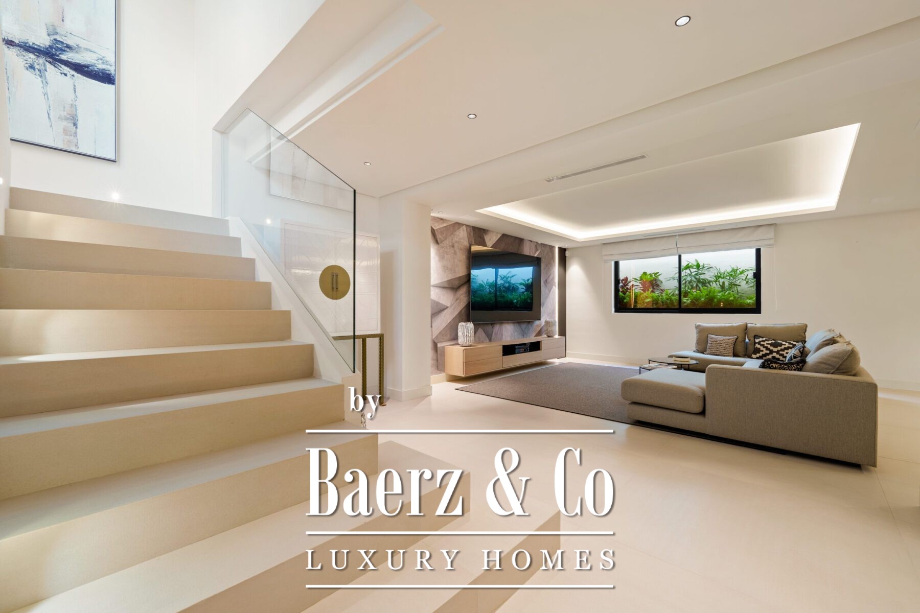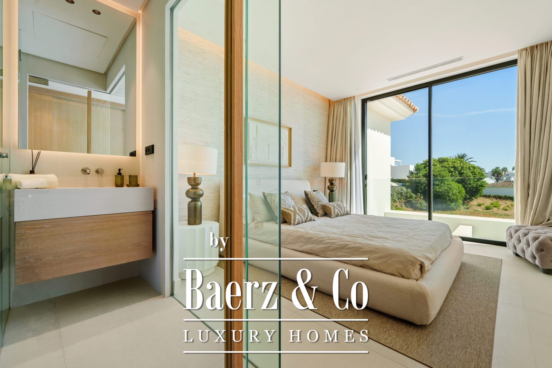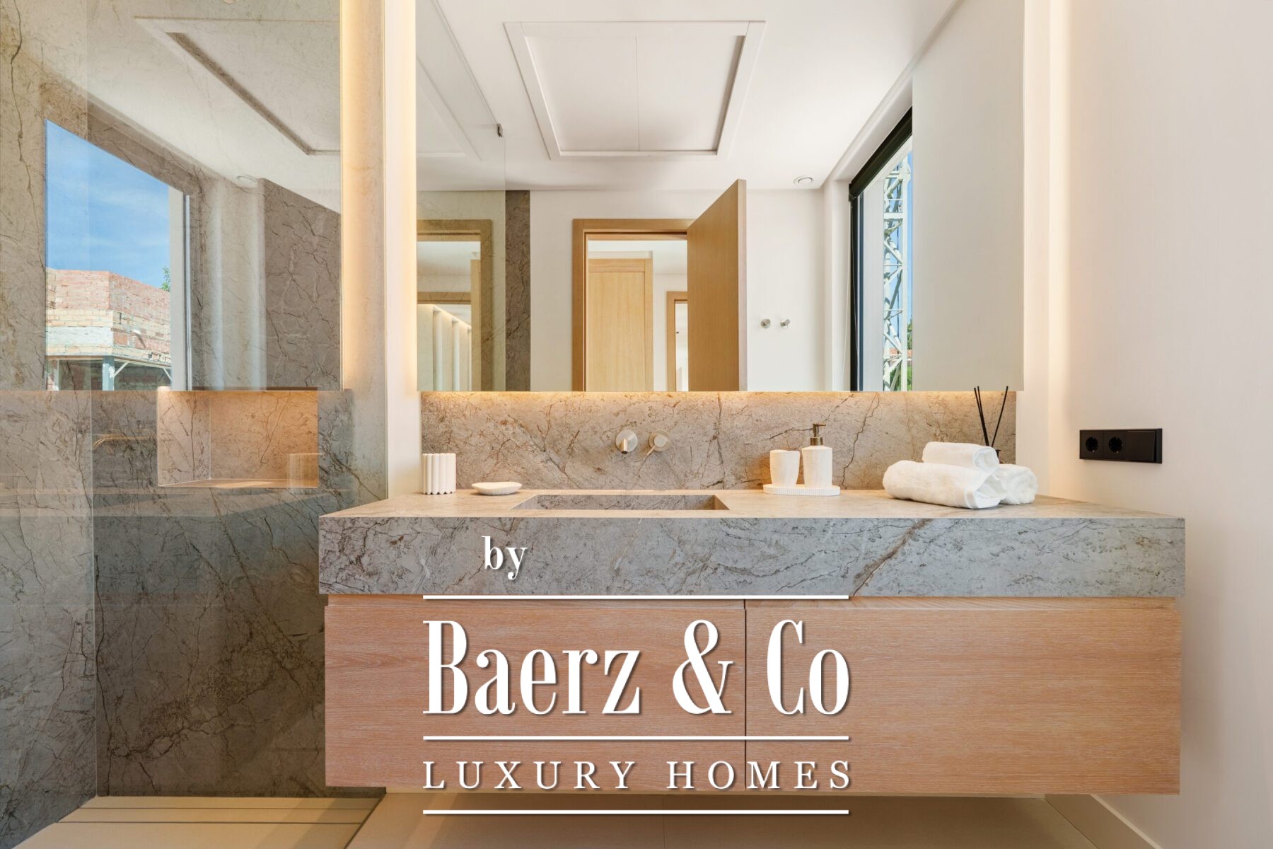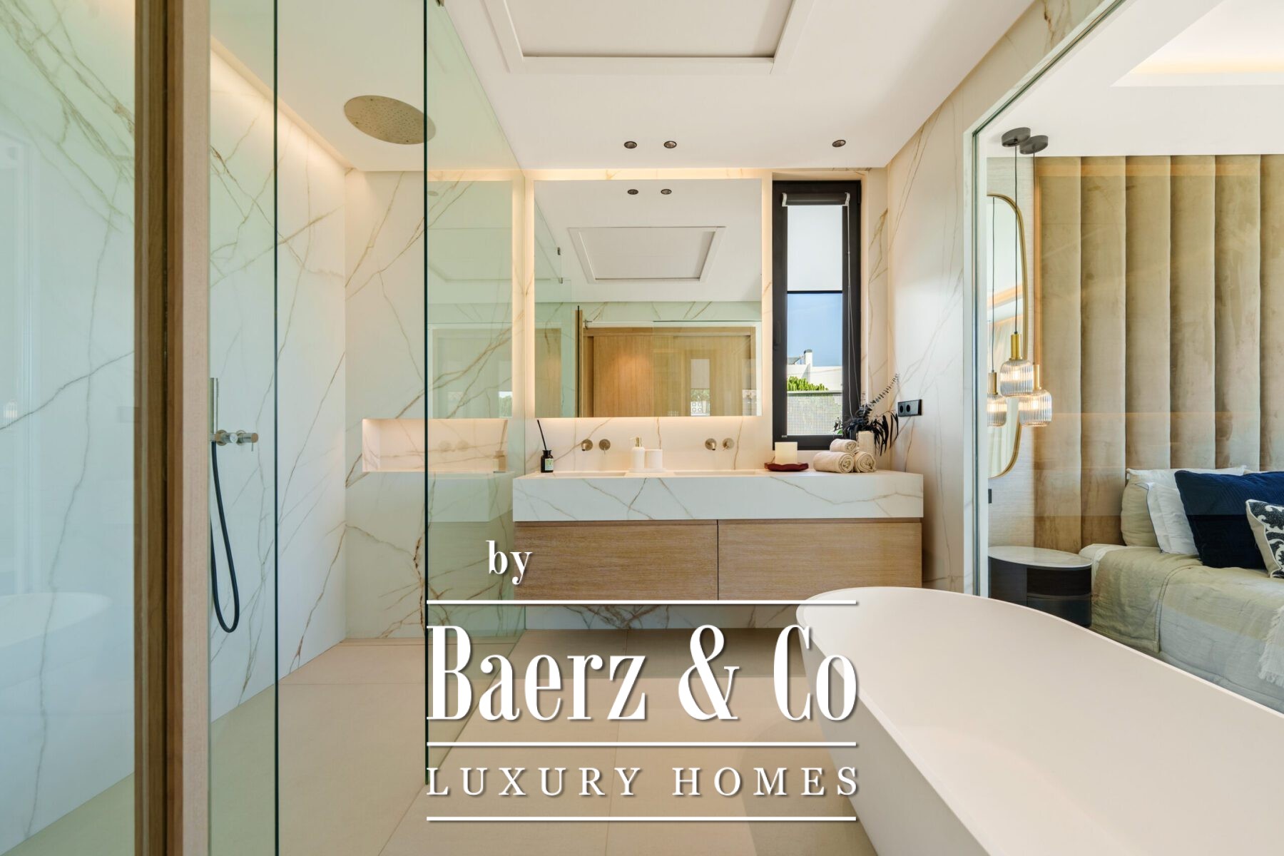 Vijf serene slaapkamers bieden direct toegang tot het terras en zijn ieder voorzien van een en-suite badkamer met marmeren afwerking, zwevende wastafels en vrijstaande baden. De mastersuite onderscheidt zich door zijn royale omvang en een zonnig privéterras, perfect als rustige schuilplaats. Op de benedenverdieping bevindt zich een volledig uitgeruste fitnessruimte, glazen sauna en stoombad voor een persoonlijke wellnessbeleving. Een beveiligde garage, luxe entree en uitzicht op de bergen geven verdere verfijning aan dit perceel van 612 m², waarmee het moderne comfort zich op steenworp afstand bevindt van Marbella’s golfbanen, stranden en lokale voorzieningen. Deze luxe villa te koop in Marbella vertegenwoordigt een verheven benadering van eigentijds mediterraan wonen.